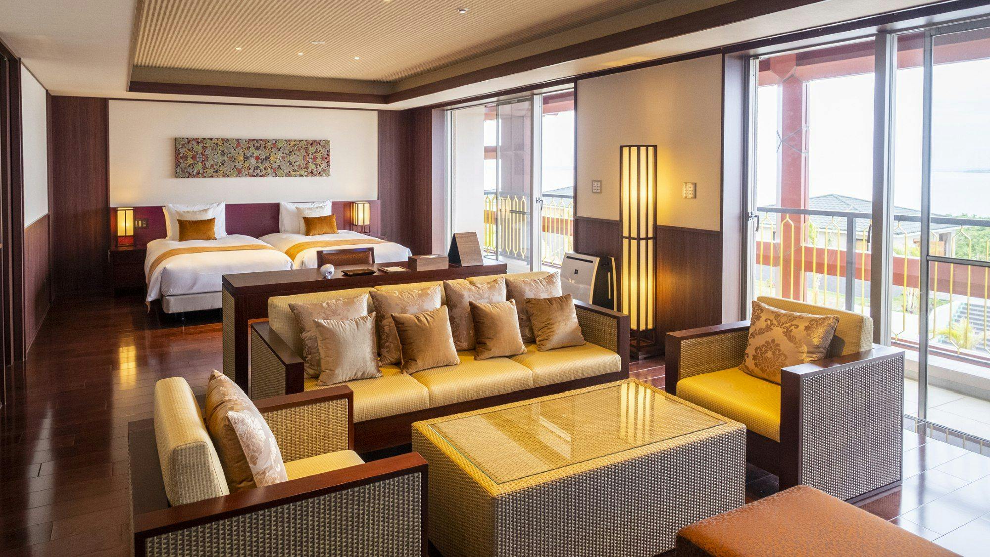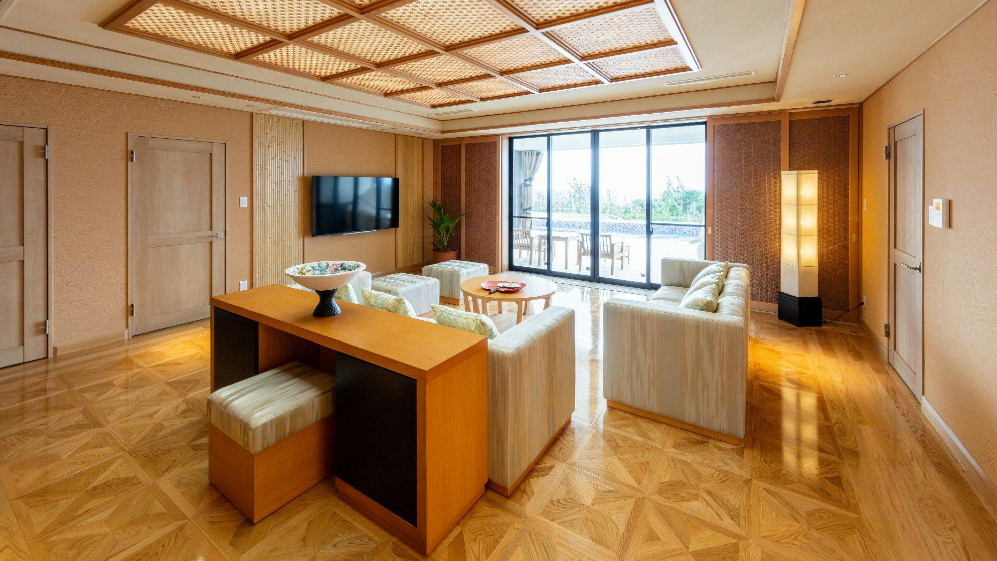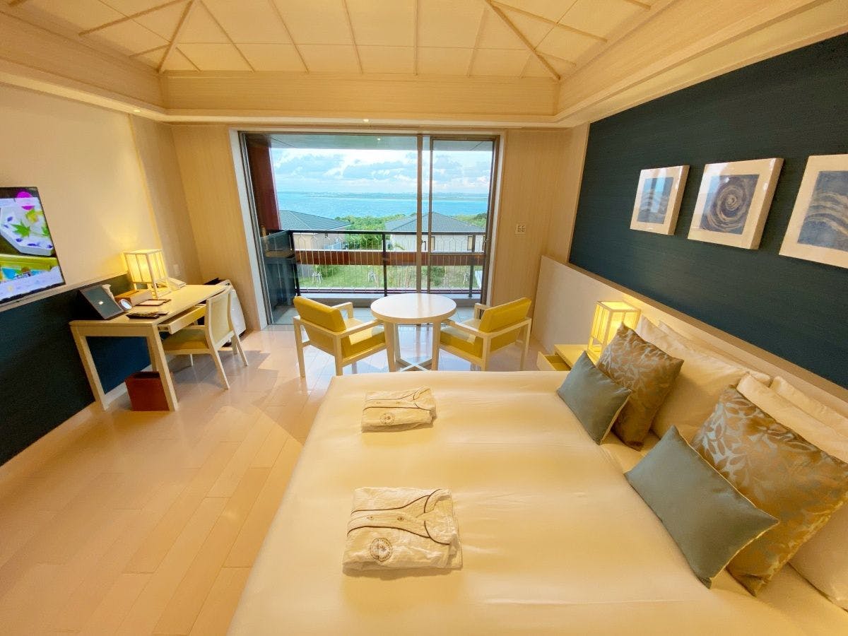 木の温もりを感じるシックで落ち着いた雰囲気のジュニアスイートは全2室のベッドスペースとリビングスペースが一体となったスタジオタイプ。広く取られた窓からは宮古ブルーの海が広がります。