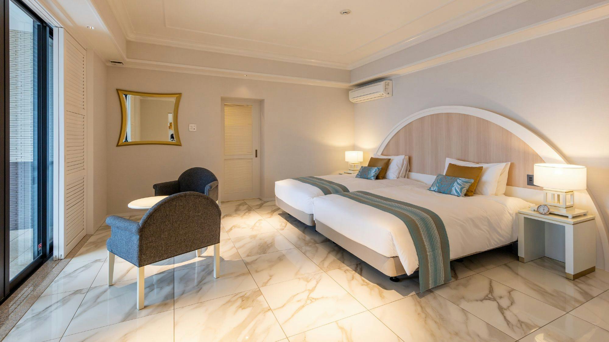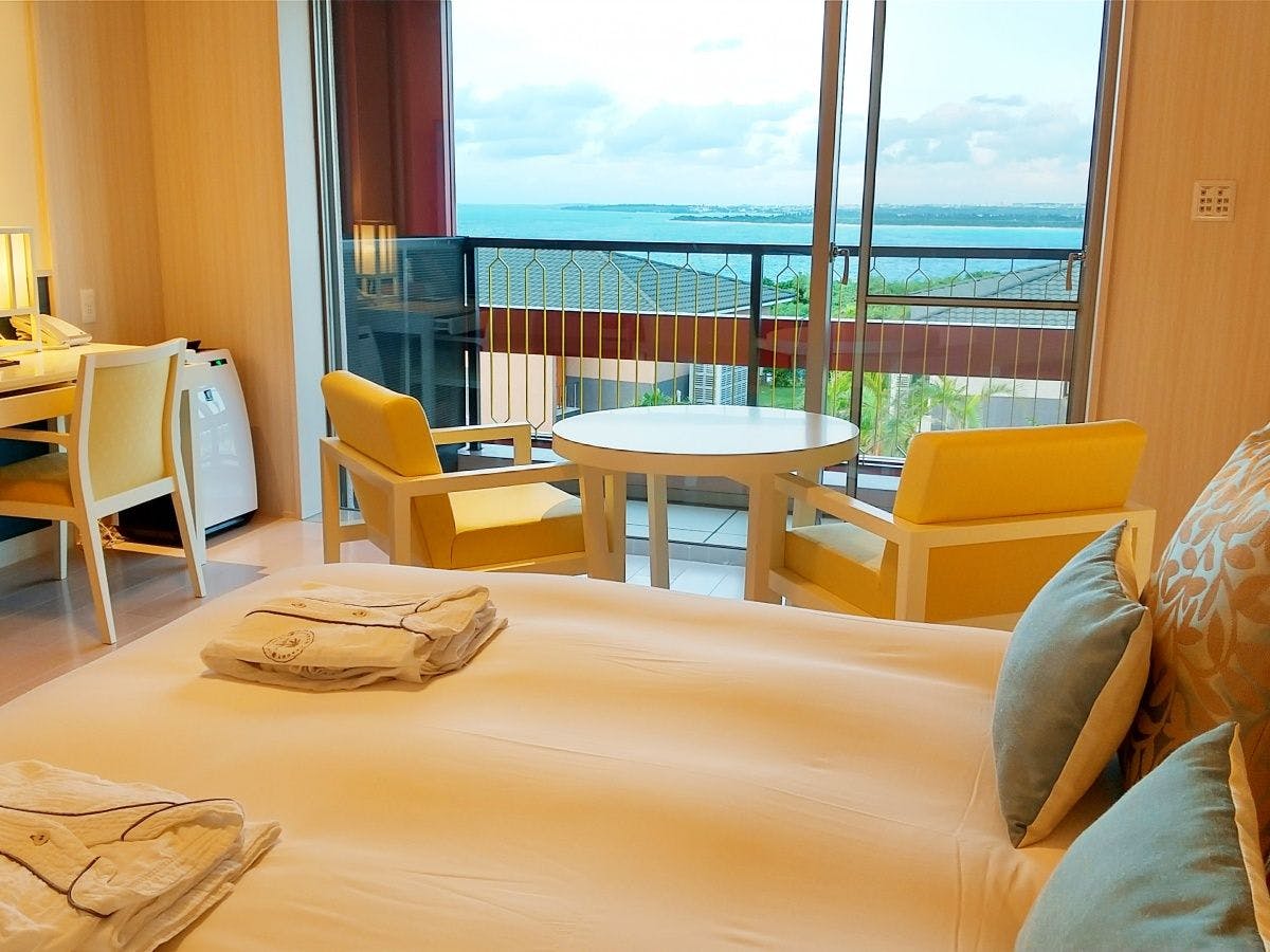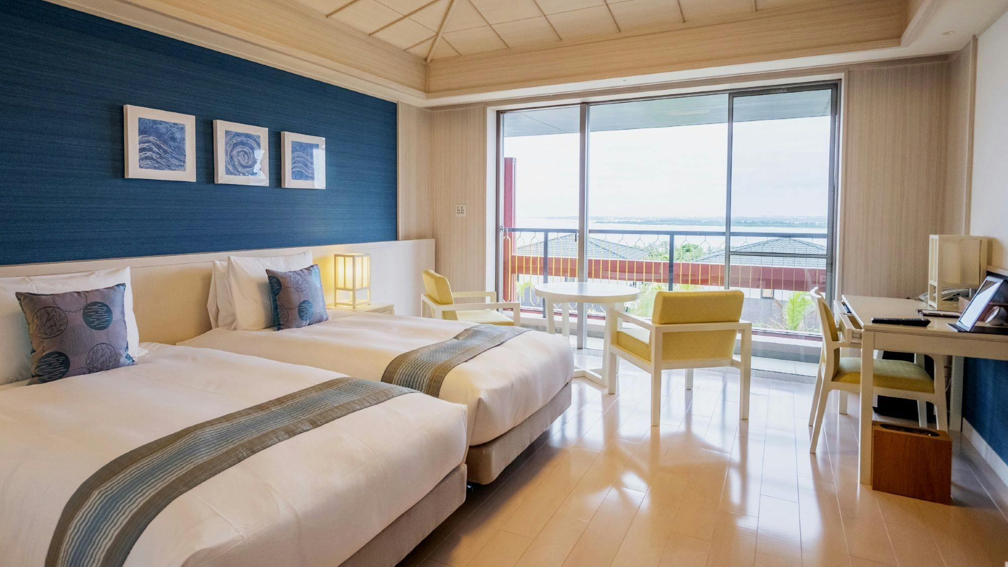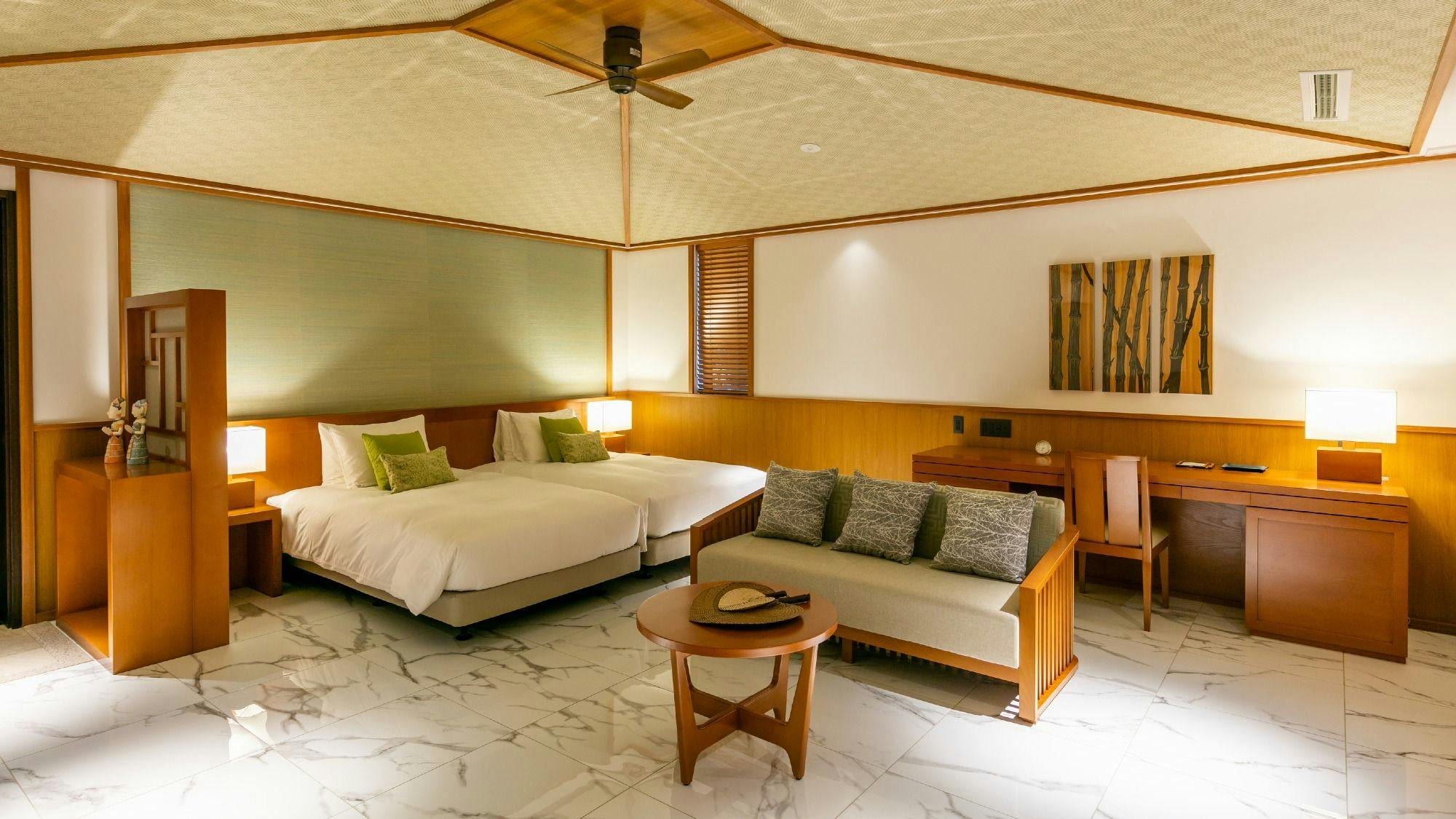 木の温もりを感じるシックで落ち着いた雰囲気のジュニアスイートは全2室のベッドスペースとリビングスペースが一体となったスタジオタイプ。広く取られた窓からは宮古ブルーの海が広がります。
