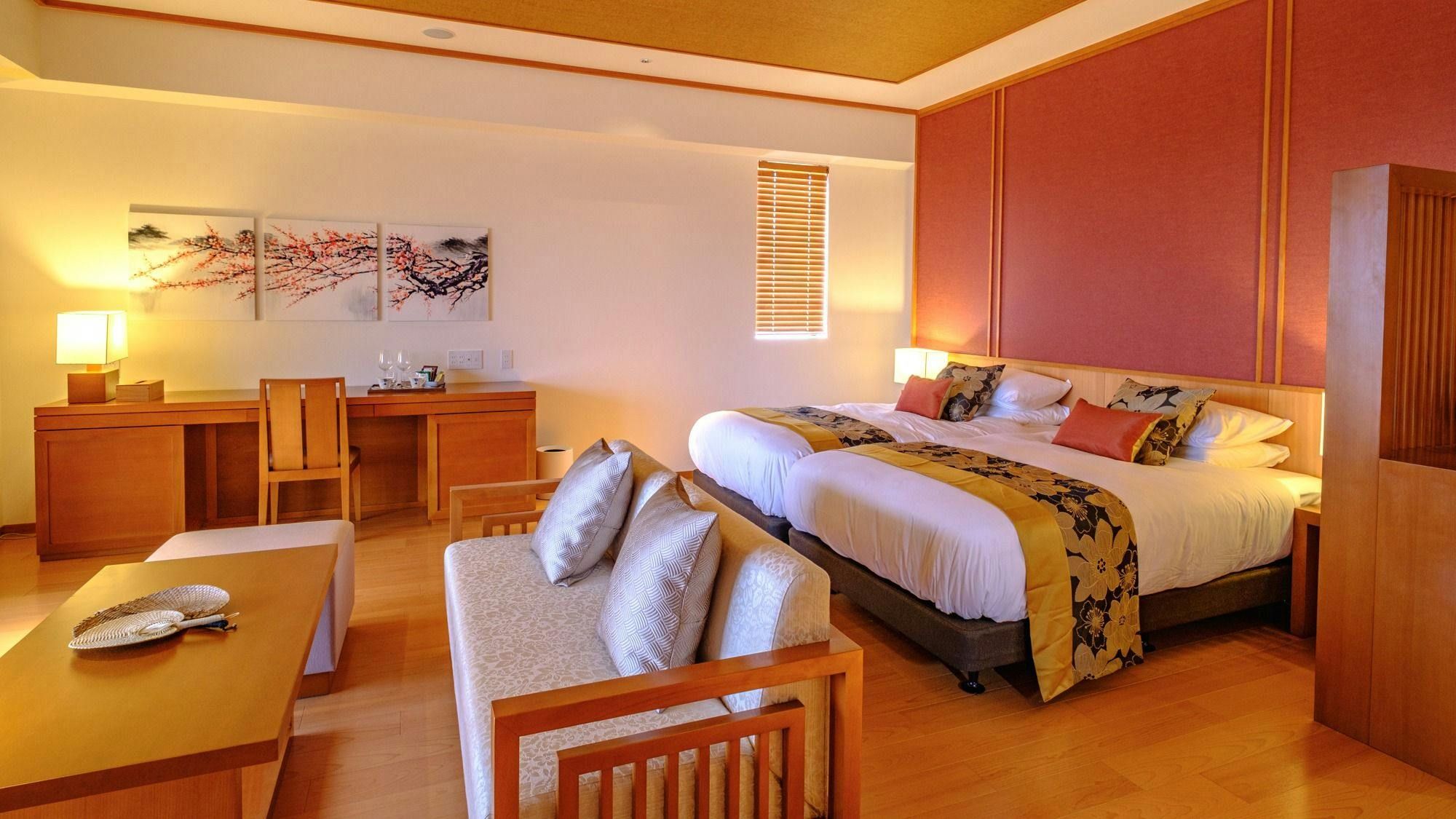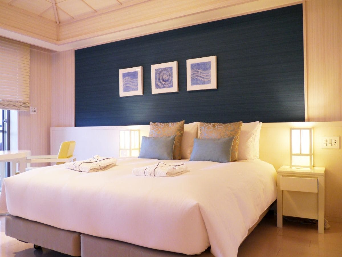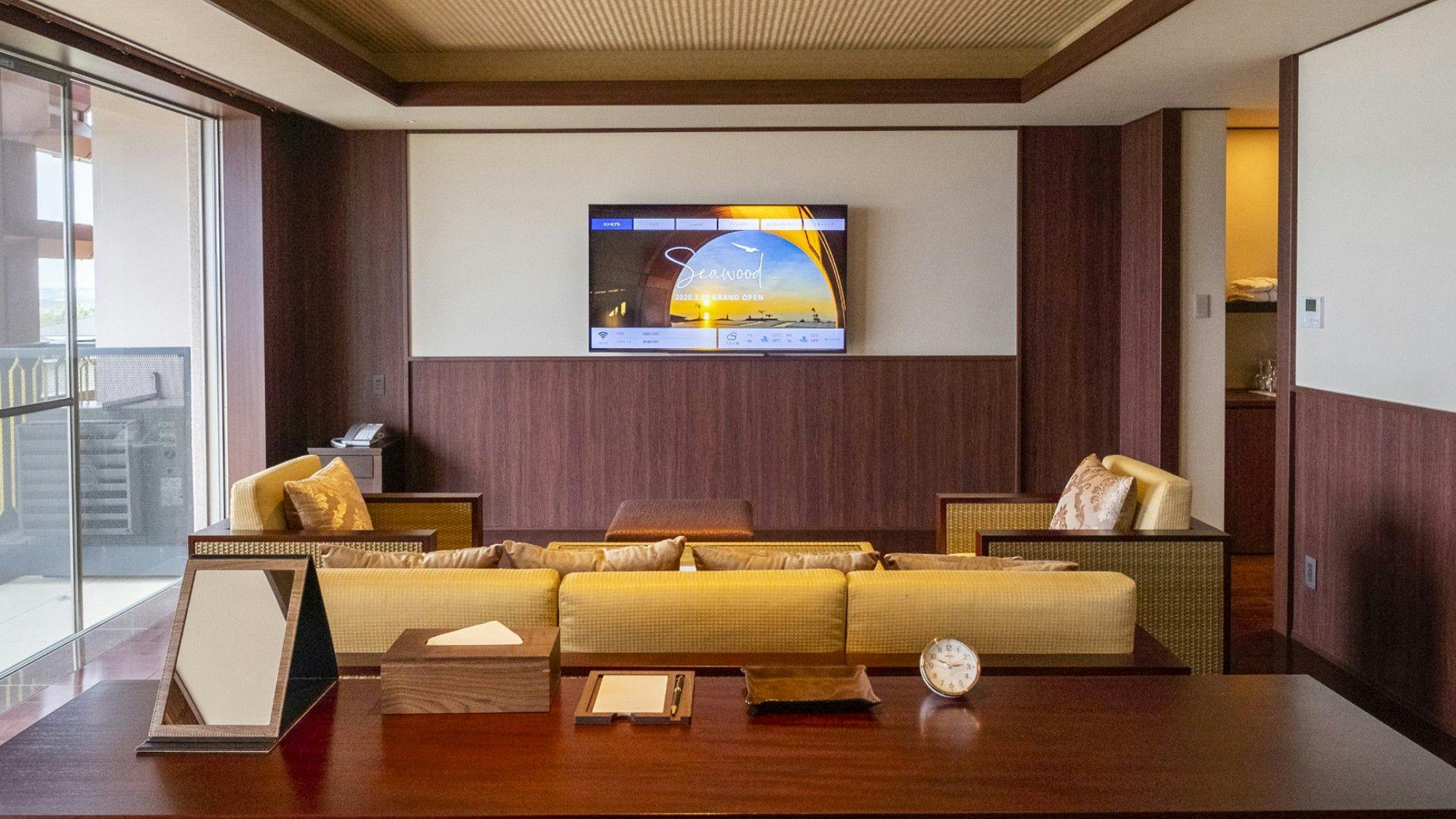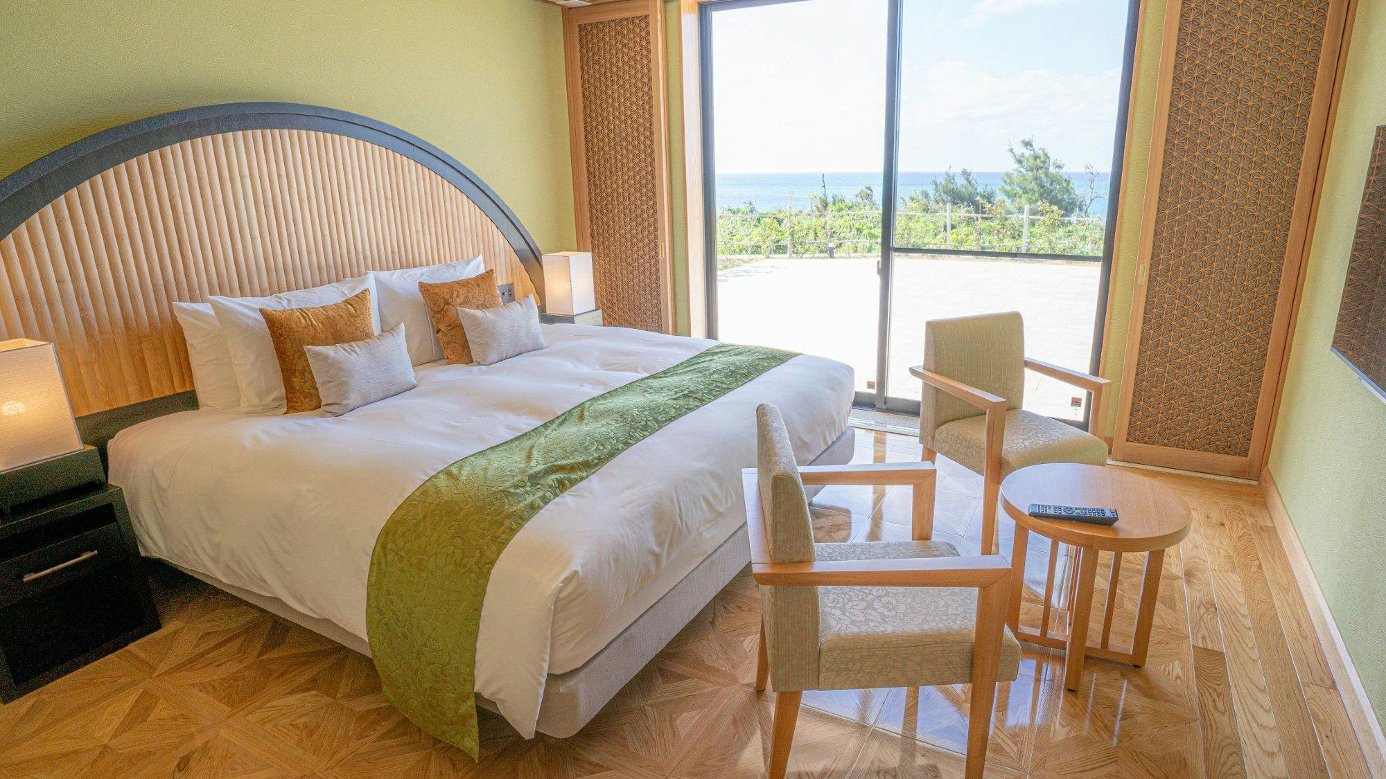 The Junior Suite has a chic and calm atmosphere that feels the warmth of wood and is a studio style with bed space and living space. The gorgeous Miyako Blue oceans spread out from the wide window.