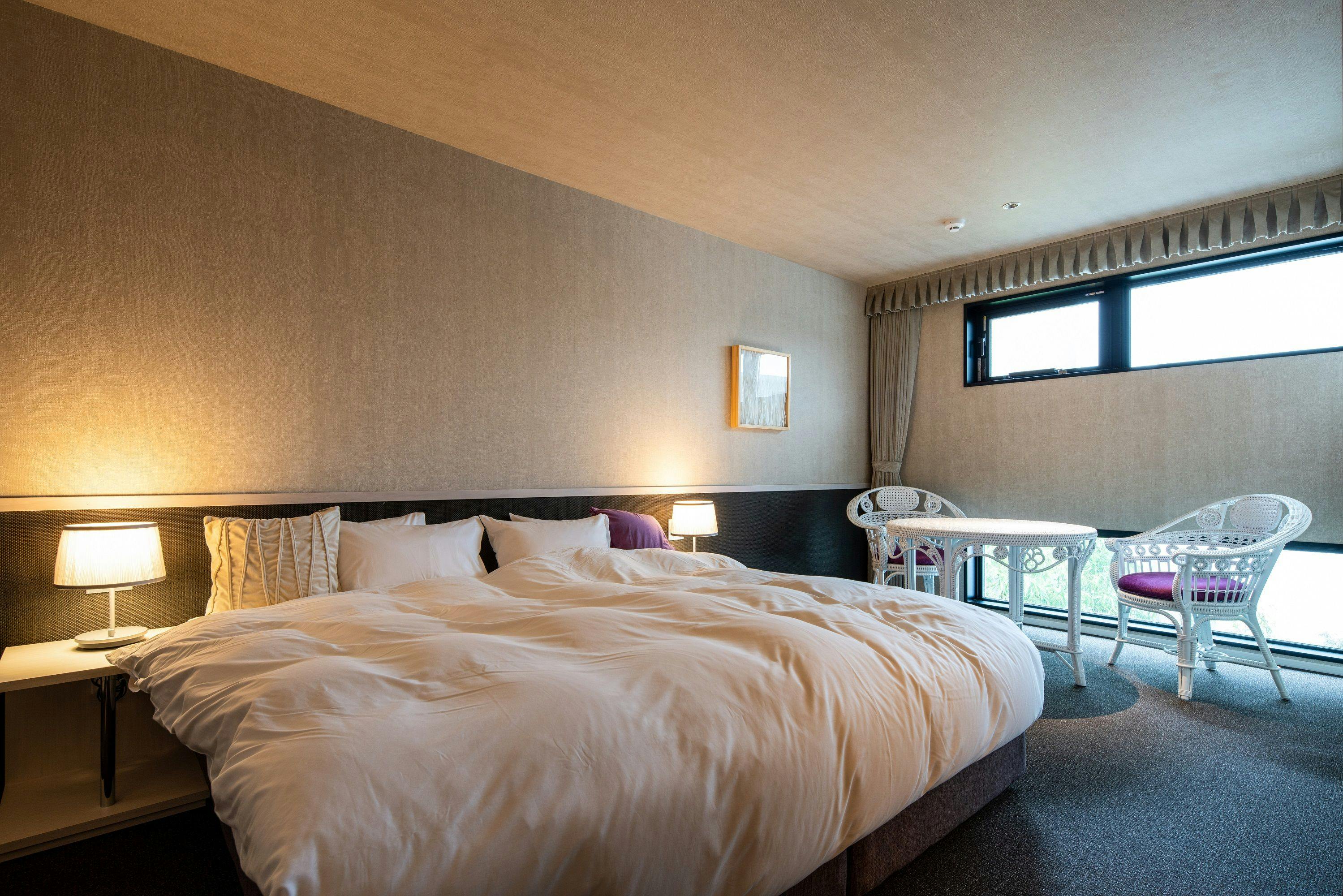 プライベートガーデン、シングルサイズベッド×2 or ワイドキングサイズベッド×1(Hollywood style)、ダブルボウル洗面、半露天風呂