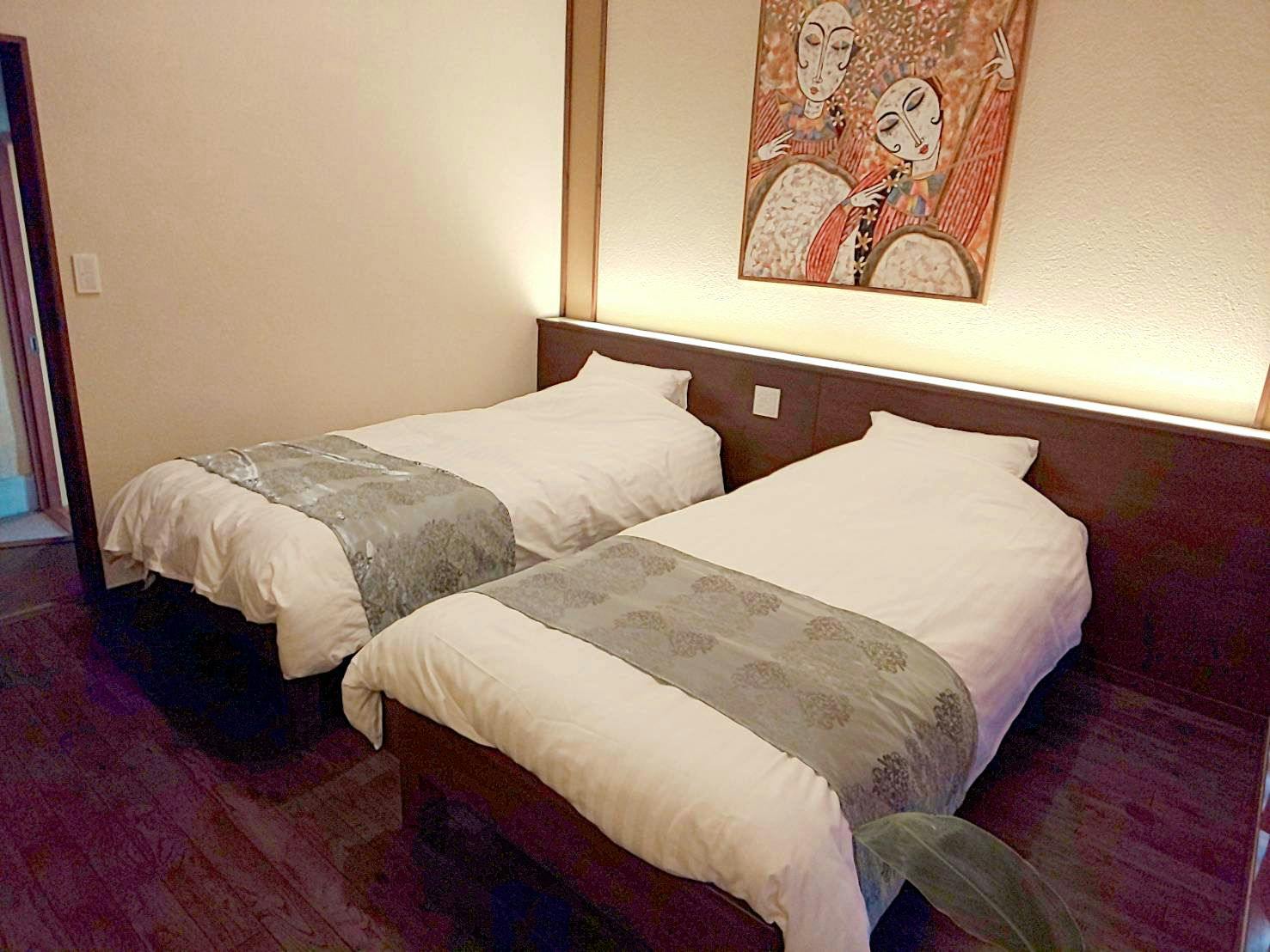 海を望む、露天風呂付の客室です(ダブルベッド×2台)。※※※エキストラベッド追加で4名様までご宿泊いただけますが、その場合はかなりお部屋が狭くなります。予めご了承をお願い致します。