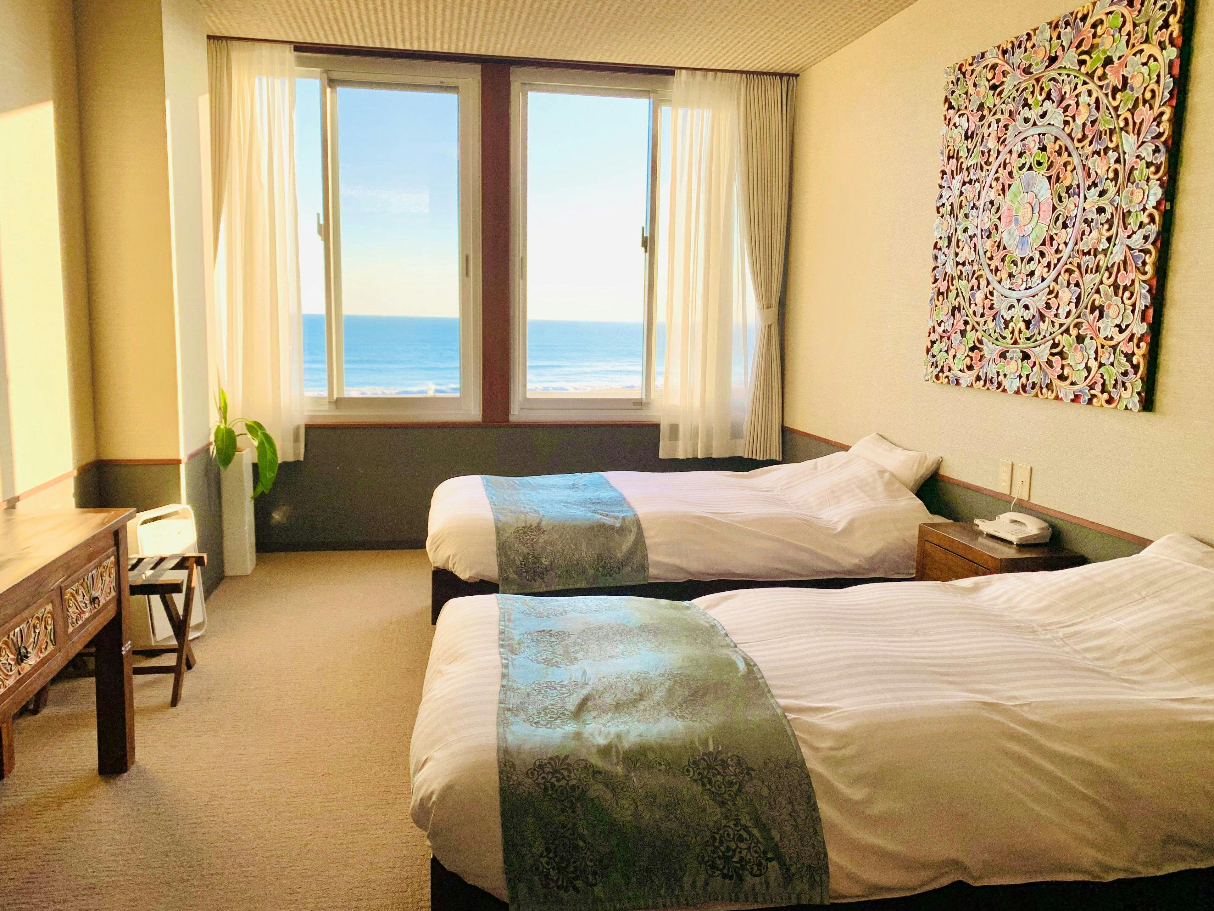 岬(伊良湖港)寄りを望む客室。リニューアルされた洋室で、シャワー・トイレ付。※※※エキストラベッドを1台追加し3名様までご宿泊いただけますが、その場合はかなりお部屋が狭くなります。予めご了承をお願い致します。※※※