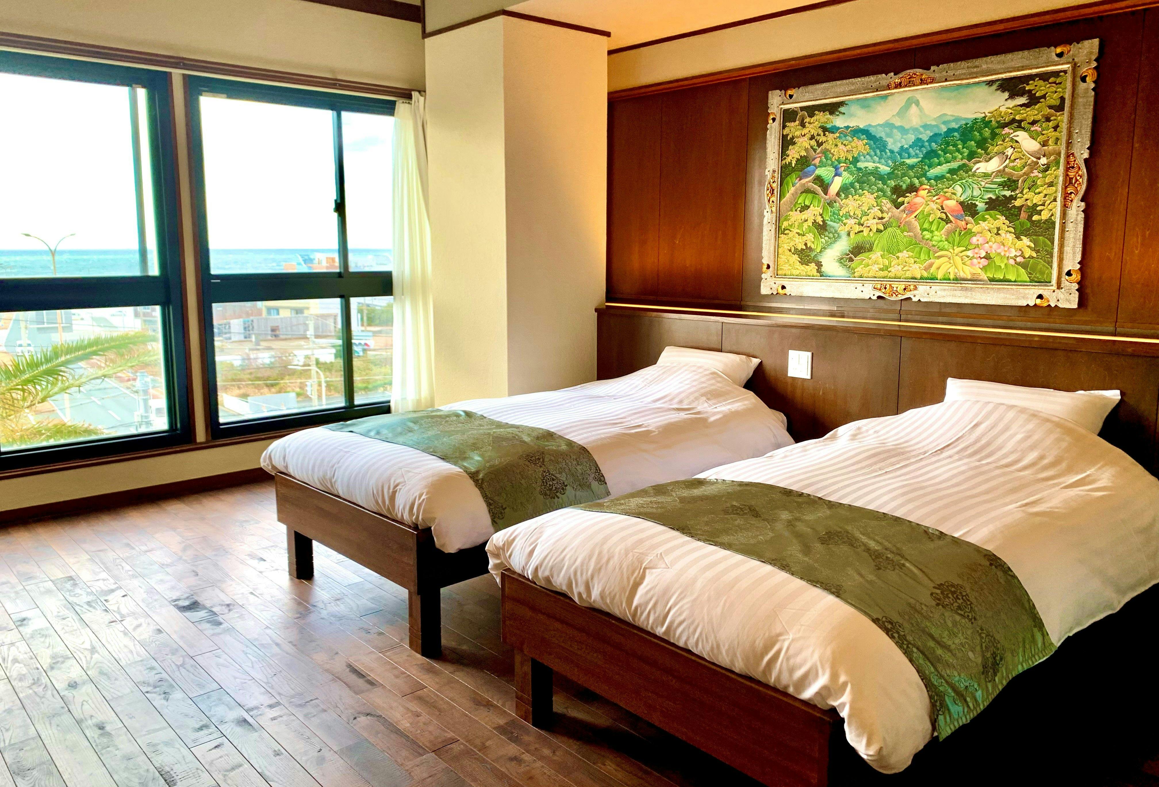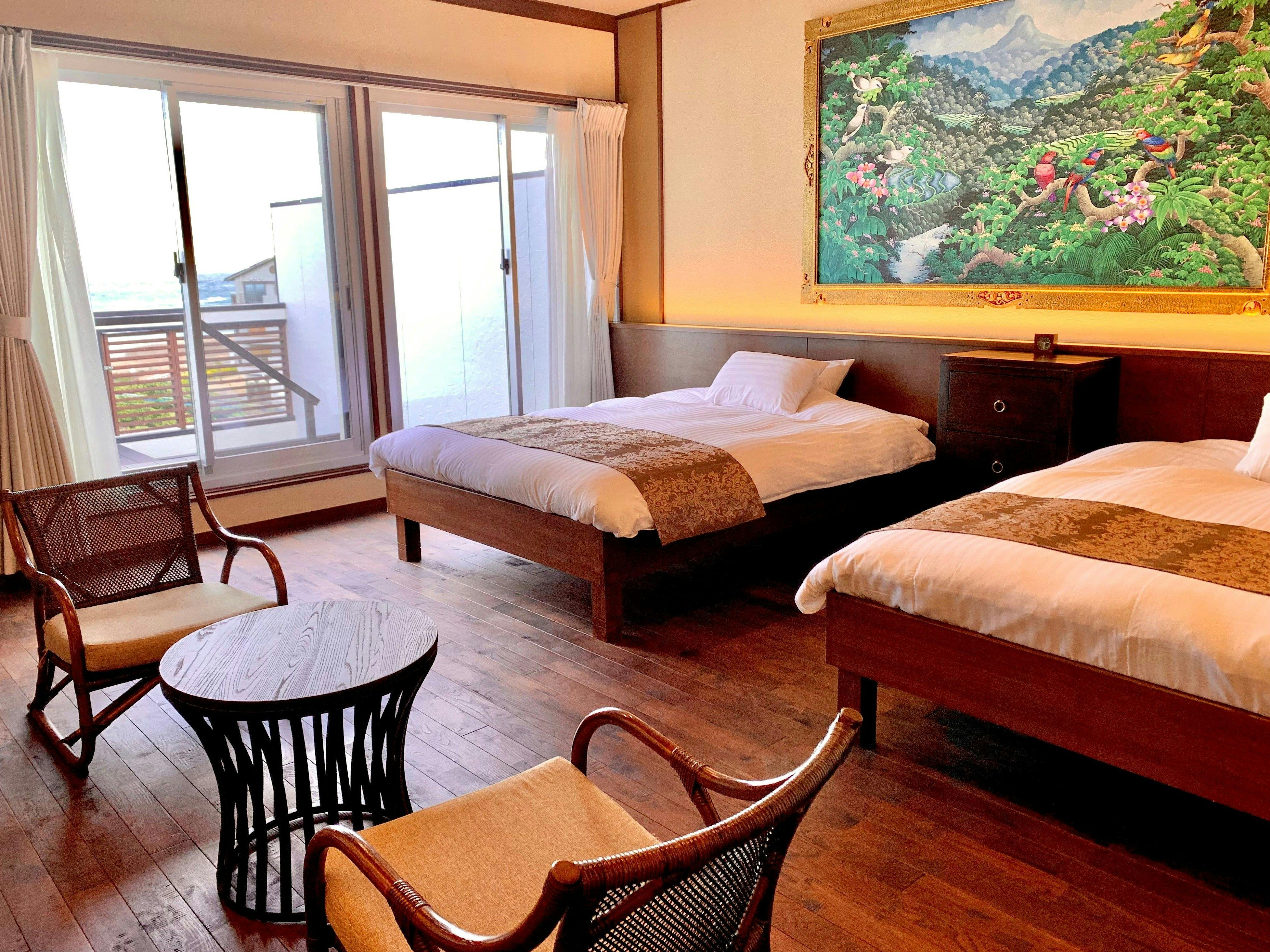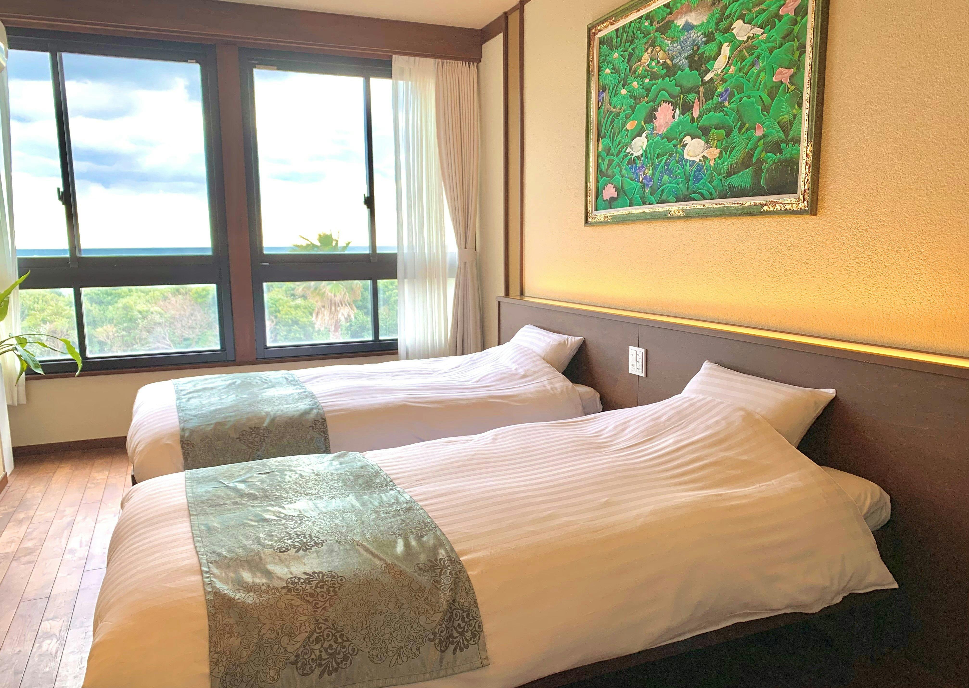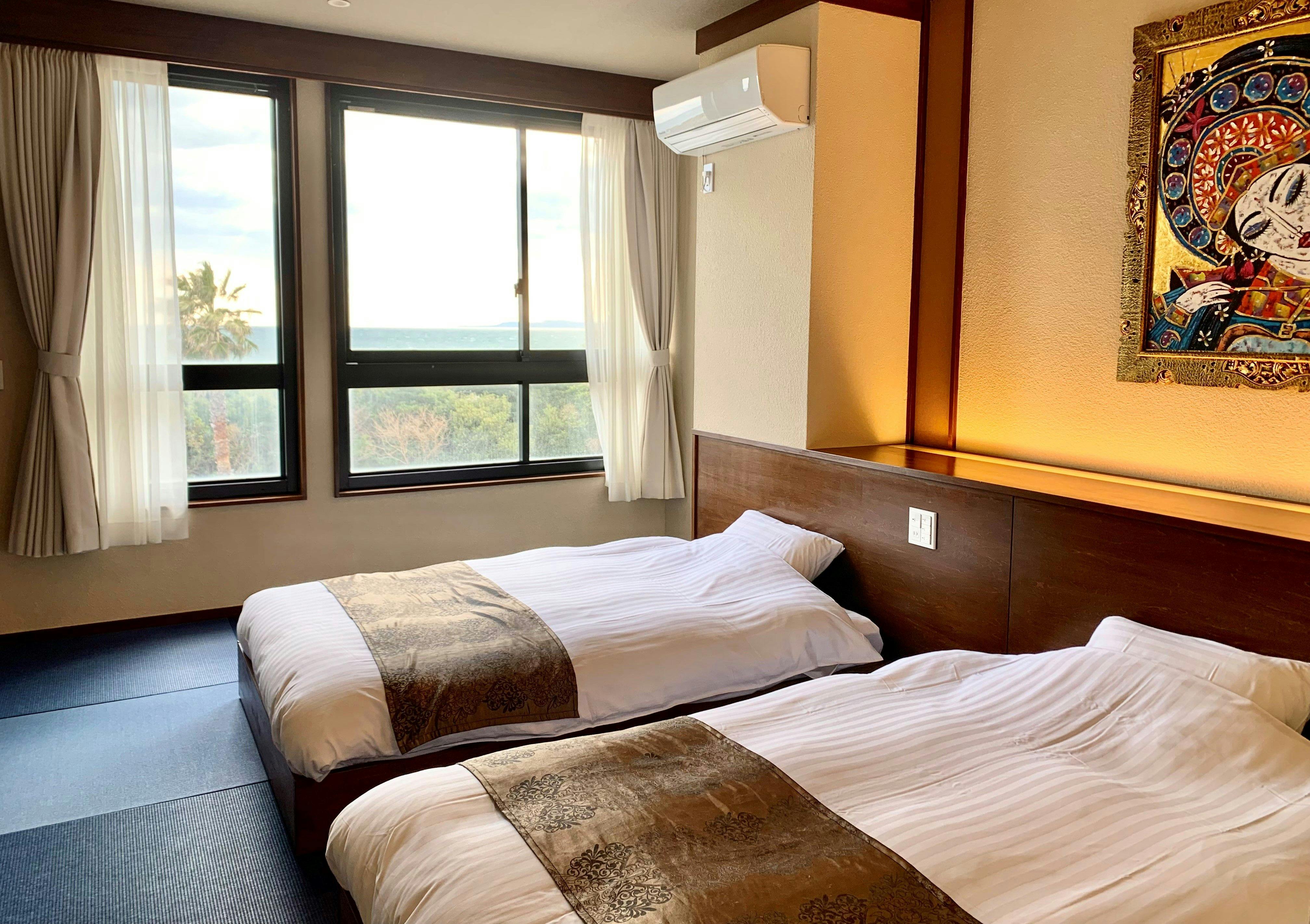 窓からの眺めは「恋路が浜、太平洋の海原」が目の前のオーシャンビュー。お子様がいても安心な琉球畳にセミダブルのロータイプベッド2台を備えた、ファミリータイプのお部屋です。(バス・トイレ付き)2台ベッドを接続させることで大人2名+幼児2名、または大人2名+子供1名で最適にご利用いただけます。