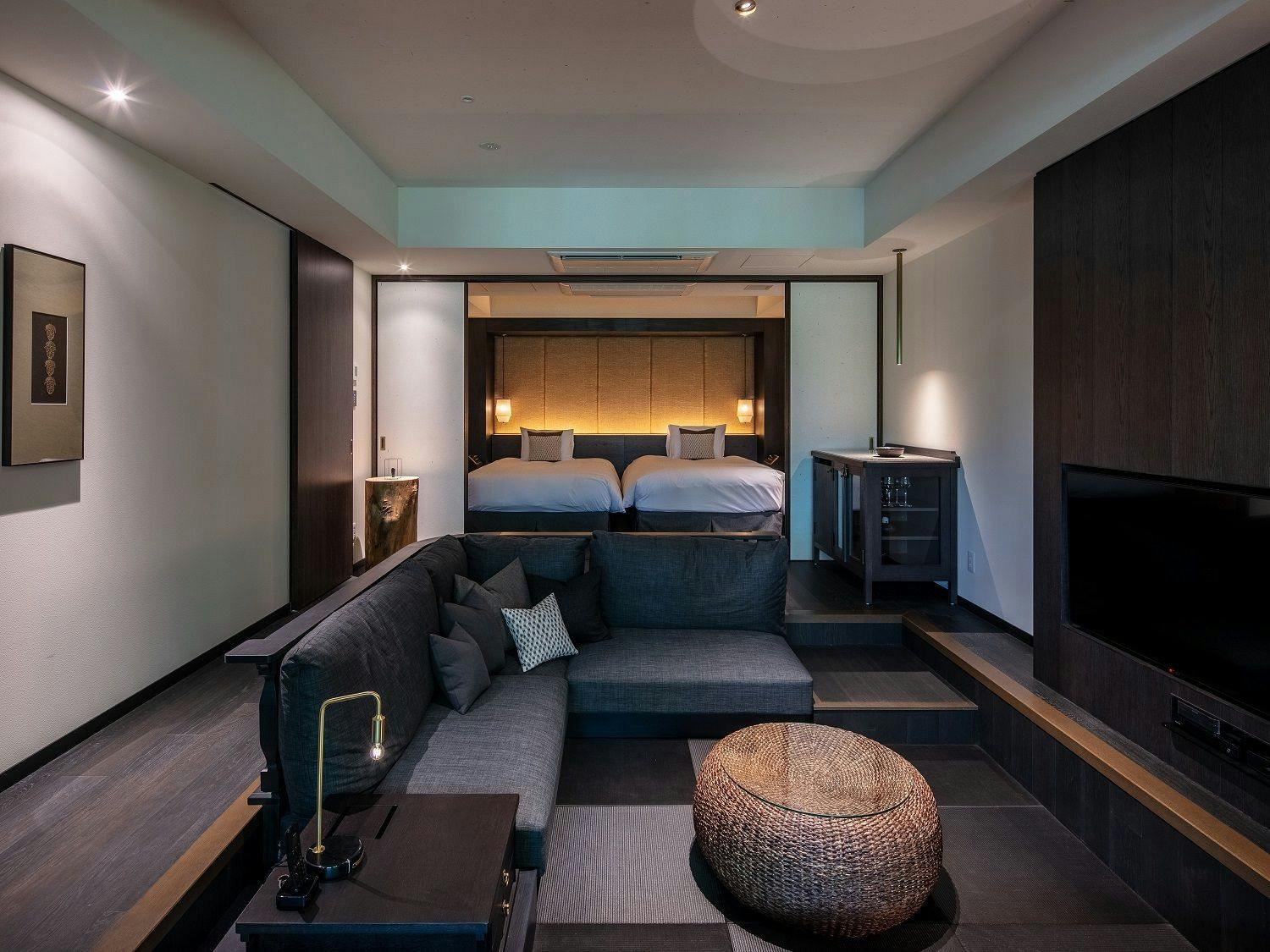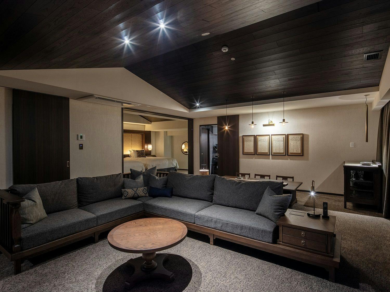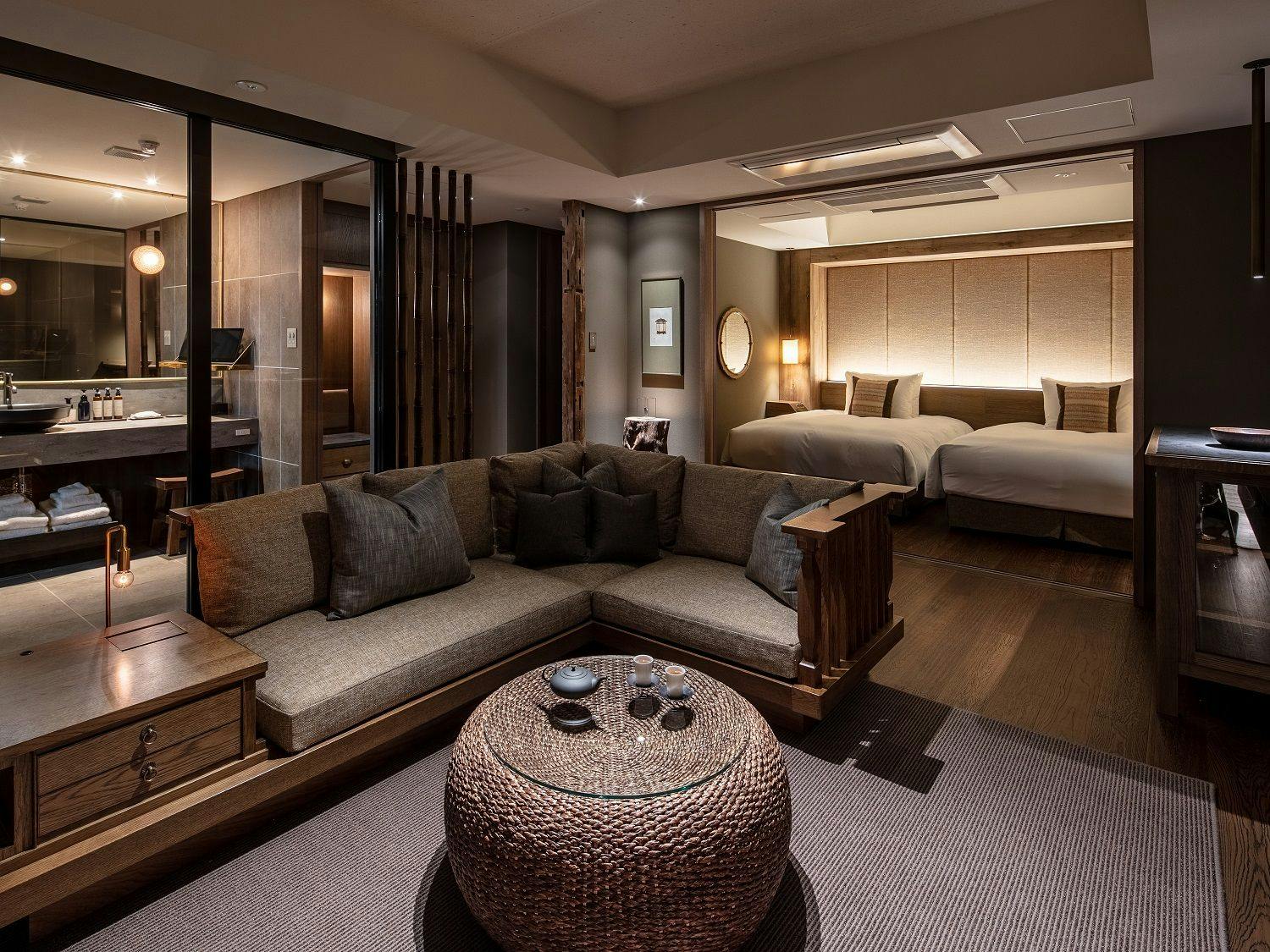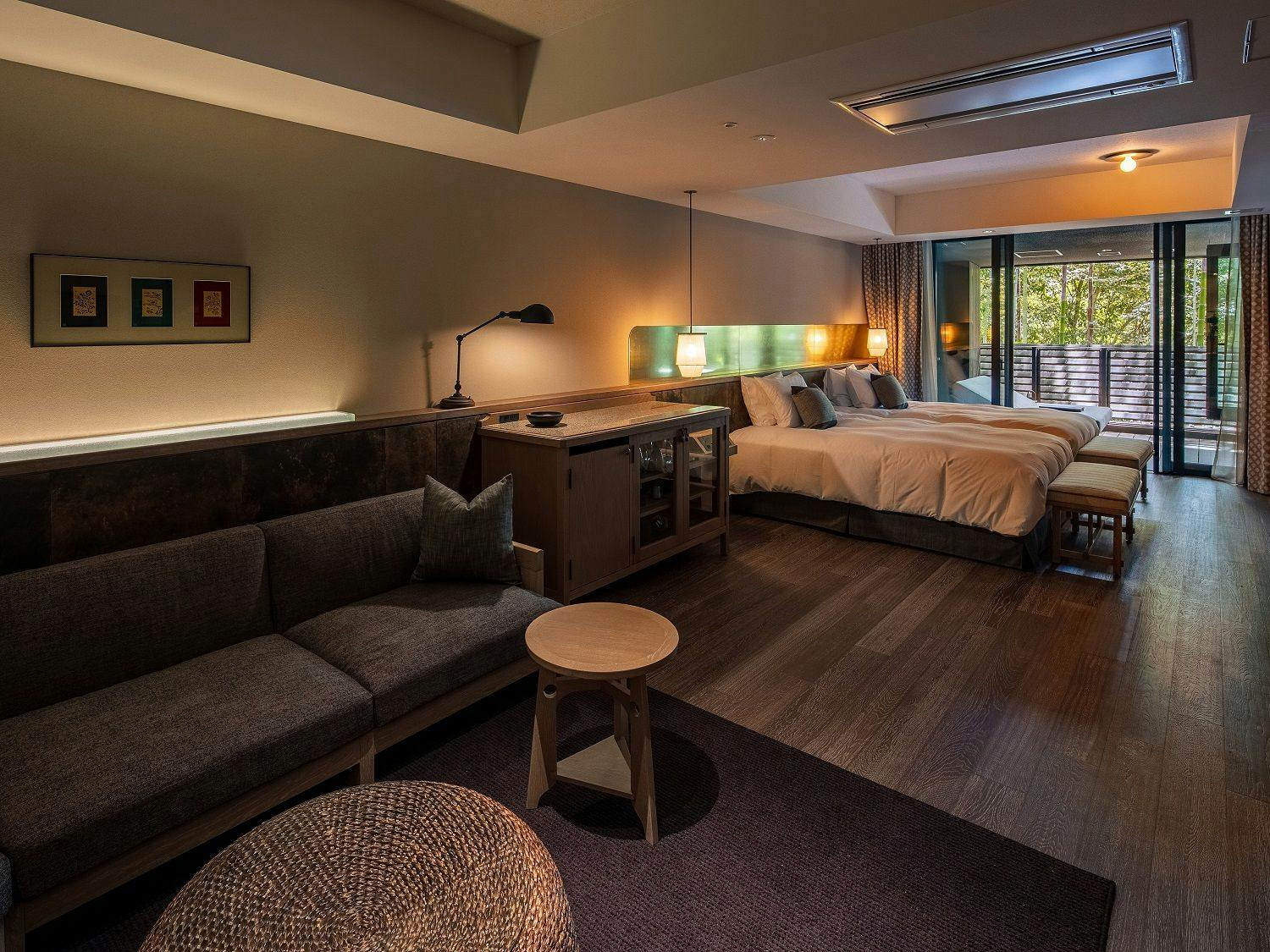 どの部屋からも庭園の木々や風を感じていただける二階のお部屋。天然温泉の露天風呂と「和漢の香りの湯」をしつらえています。家具だけでなく、ファブリックもすべて違うデザインで、広々とした一体感を感じるワンルームタイプのお部屋です。お好みのスタイルで様々なバリエーションをお選びいただけます。