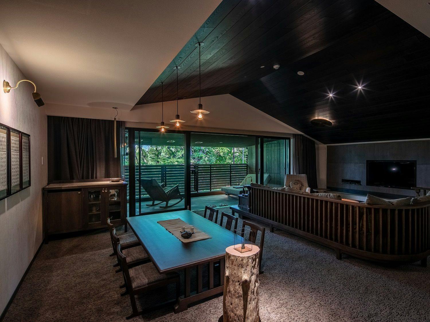 庭園を近くに感じられるお部屋。広々したテラスには天然温泉の露天風呂と内湯を完備し「和漢の香りの湯」に加え、「薬湯」をしつらえています。1Fは掘り込みのリビングで、畳や床、ソファ、低座椅子でおくつろぎいただけます。2Fは絨毯で大きなソファのしつらえ。天井が高く広々とした空間でお過ごしいただけます。4名までの宿泊が可能です。