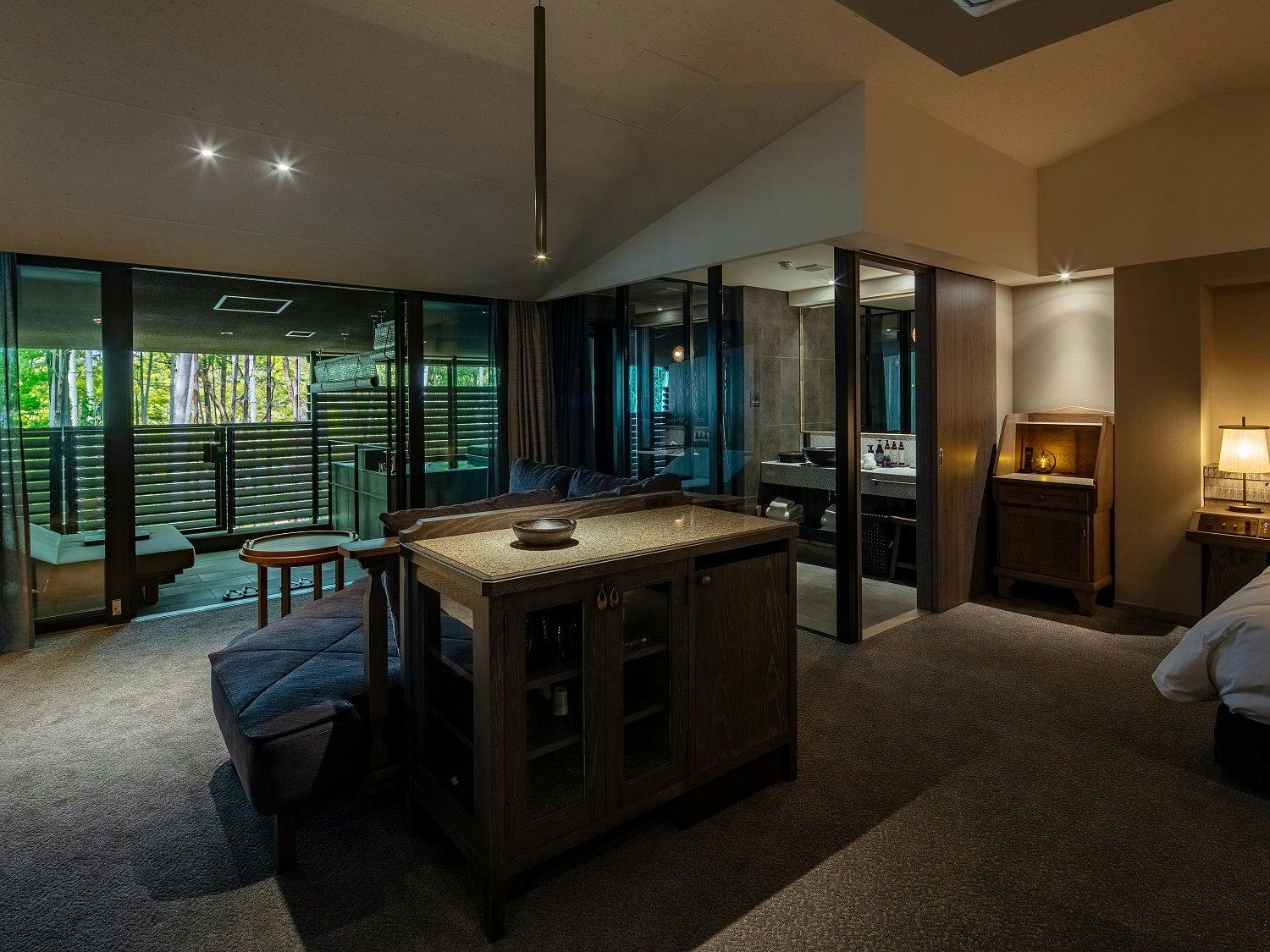 どの部屋からも庭園の木々や風を感じていただけるお部屋。天然温泉の露天風呂と「和漢の香りの湯」をしつらえています。家具だけでなく、ファブリックもすべて違うデザインで、広々とした一体感を感じるワンルームタイプのお部屋です。