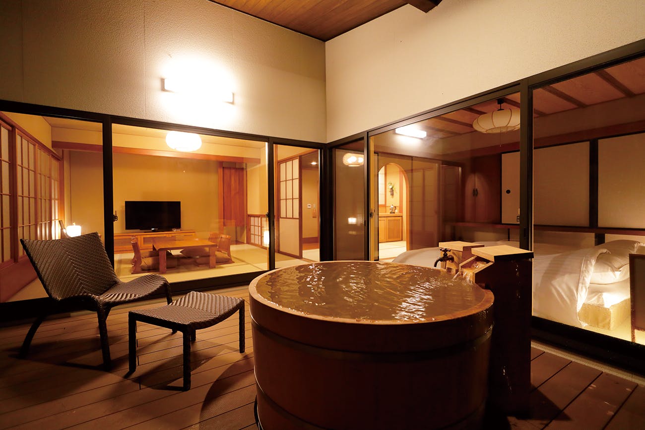 <カン亭>ウッドデッキに配した、円形の露天風呂を愉しめる。