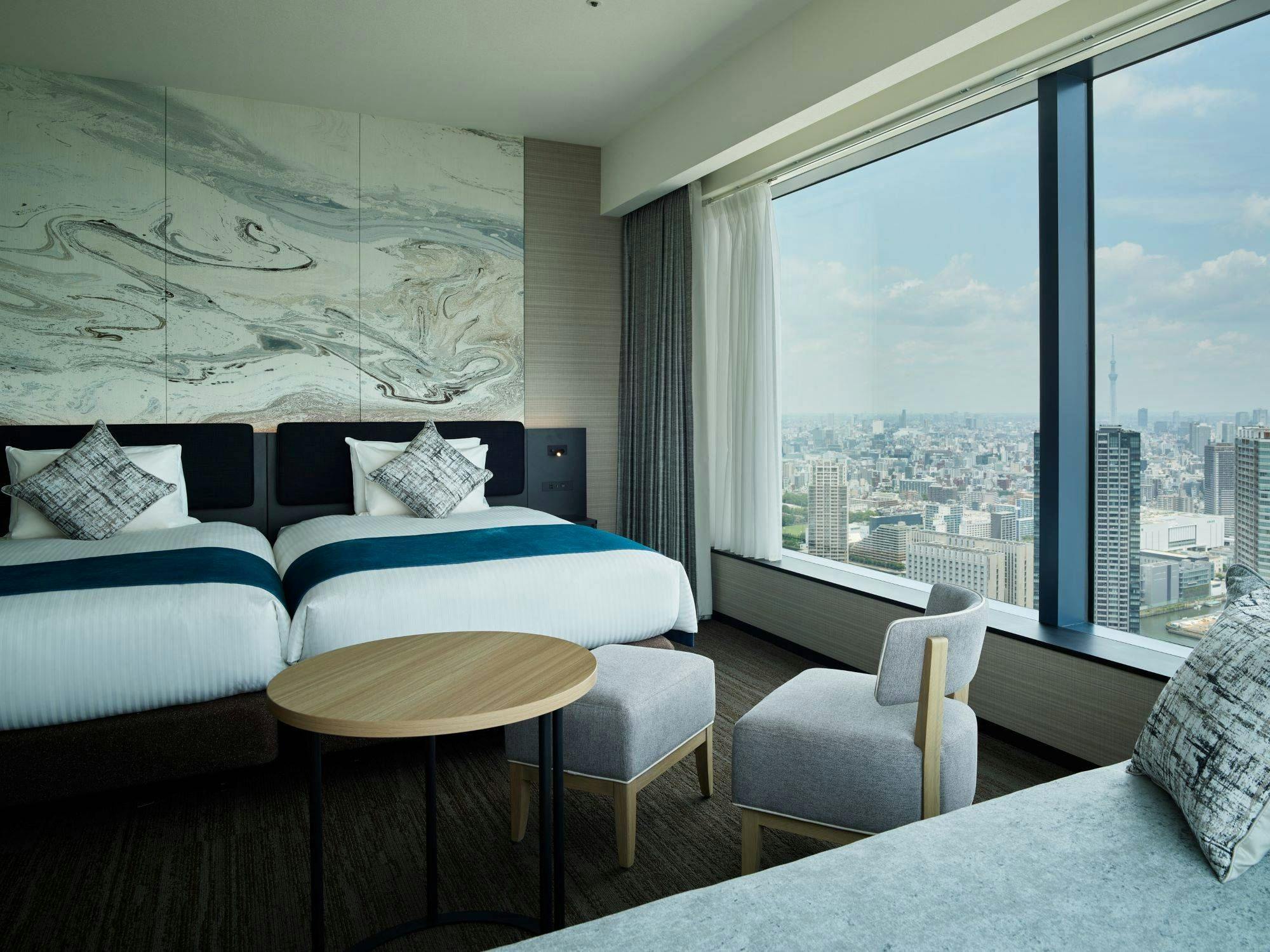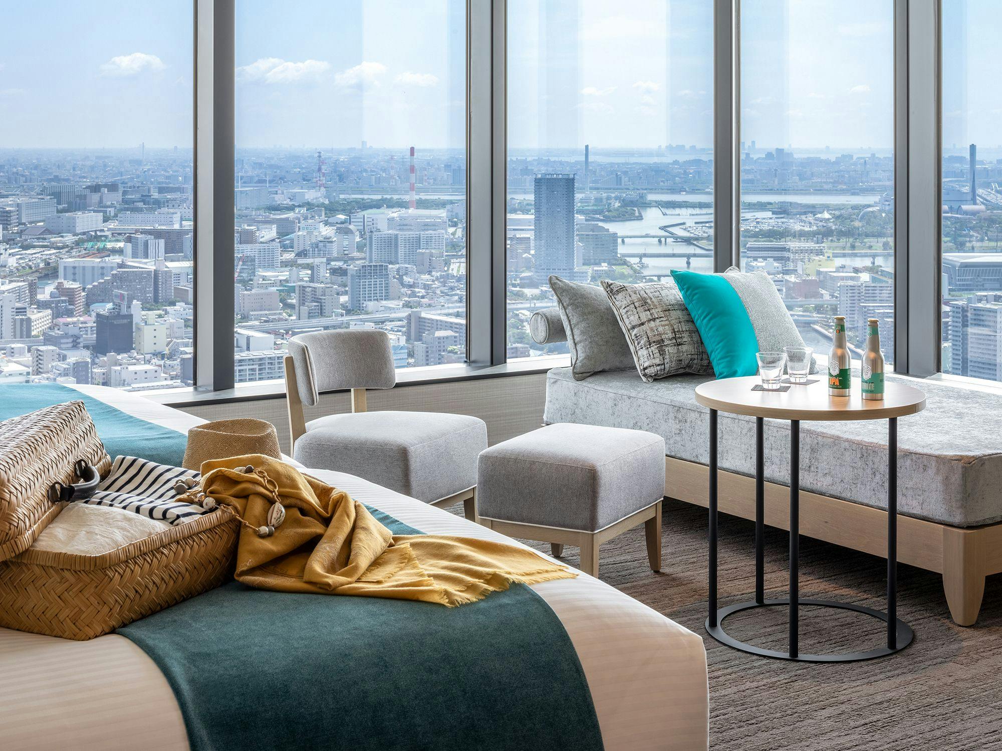 幅1,510のダブルサイズのベッドに、カウチソファを配したお部屋です。窓辺には東京シティビューが広がります。(墨田区・千葉側 ※レインボーブリッジはご覧いただけません。)リファファインバブルS を設置しています