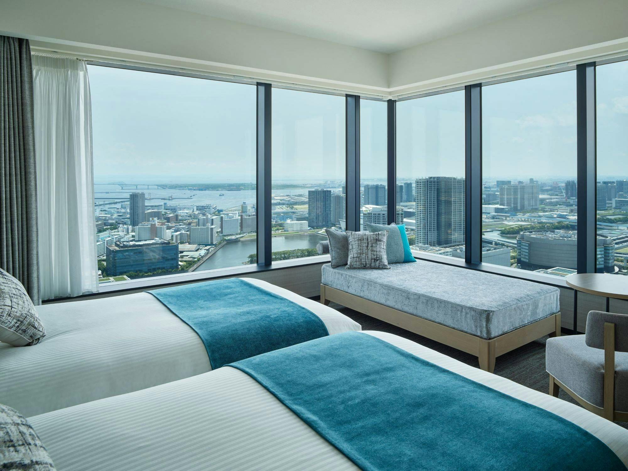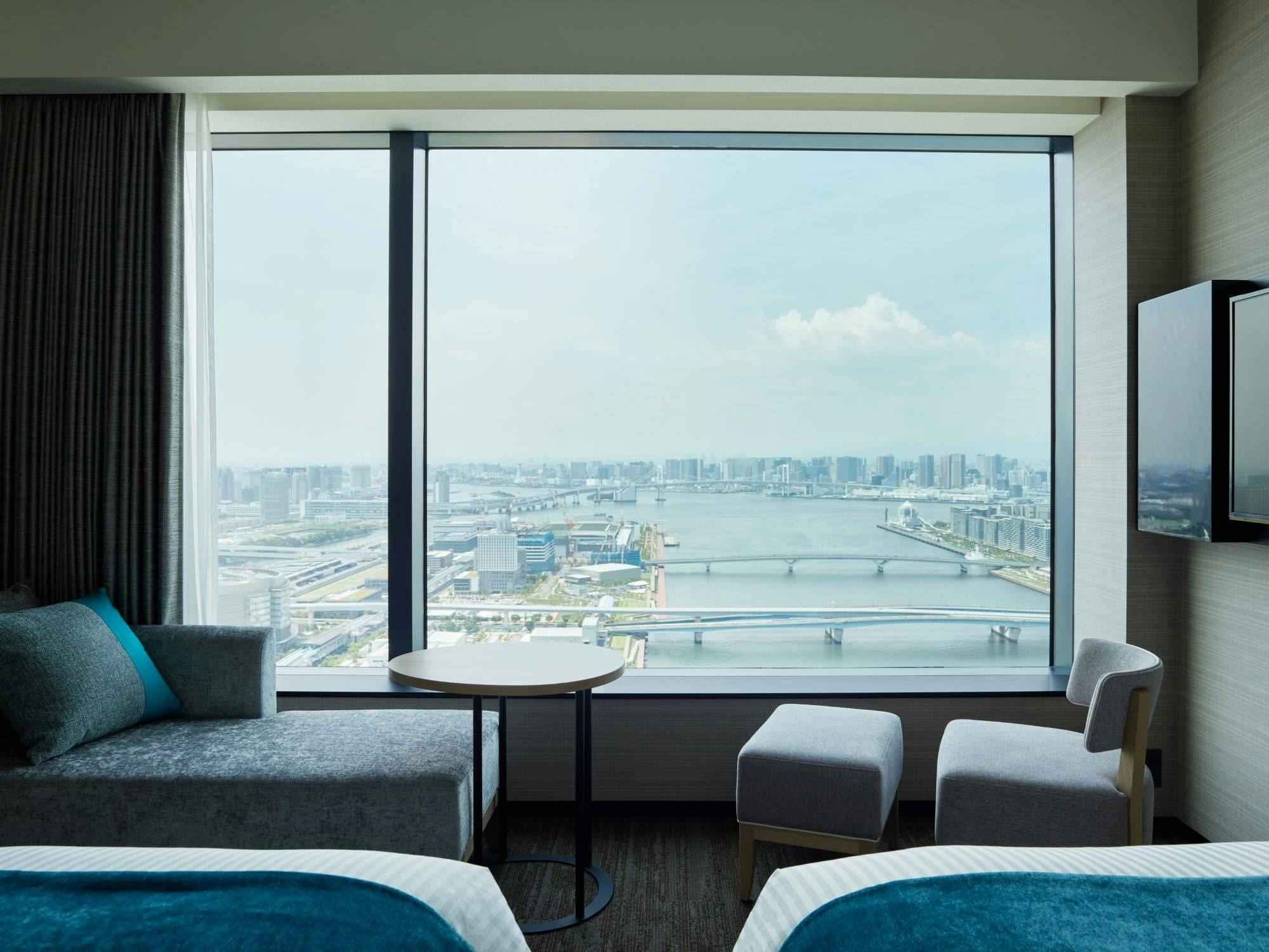 ハリウッドスタイルのツインベッドに、セパレートタイプの水まわり(ビューバス・パウダースペース・トイレ)を配した最も広いコーナールームです。窓辺にはパノラミックな東京シティービューが広がります。(※レインボーブリッジはご覧いただけません。)※3名でのご利用時はツインベッド+ソファベッド(970 x 1,960mm)となります。リファビューテックドライヤープロ、リファファインバブルS を設置しています
