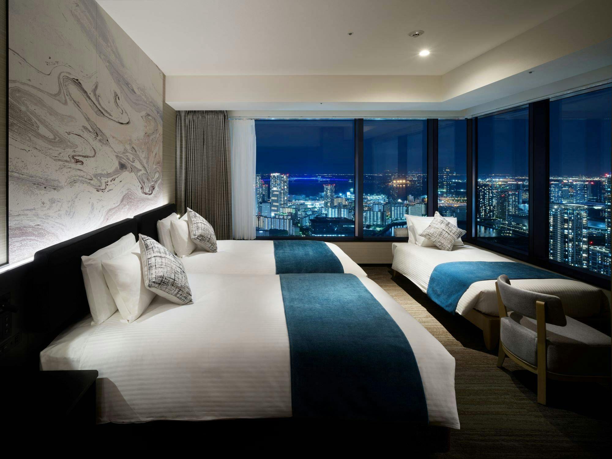 ハリウッドスタイルのツインベッドに、セパレートタイプの水まわり(ビューバス・パウダースペース・トイレ)配したコーナールームです。窓辺には東京ベイエリアのパノラミックな眺望が広がります。(レインボーブリッジ側)※3名でのご利用時はツインベッド+ソファベッド(970 x 1,960mm)となります。リファビューテックドライヤープロ、リファファインバブルS を設置しています