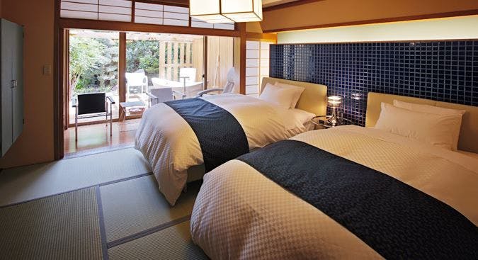 古き良き日本の佇まいにデザイナーズ家具を配したお部屋には畳にベットのスタイル。お庭のある広い濡縁には源泉かけ流しの露天風呂。浮かべる薔薇の花をご用意、優雅な湯浴みをお楽しみください。