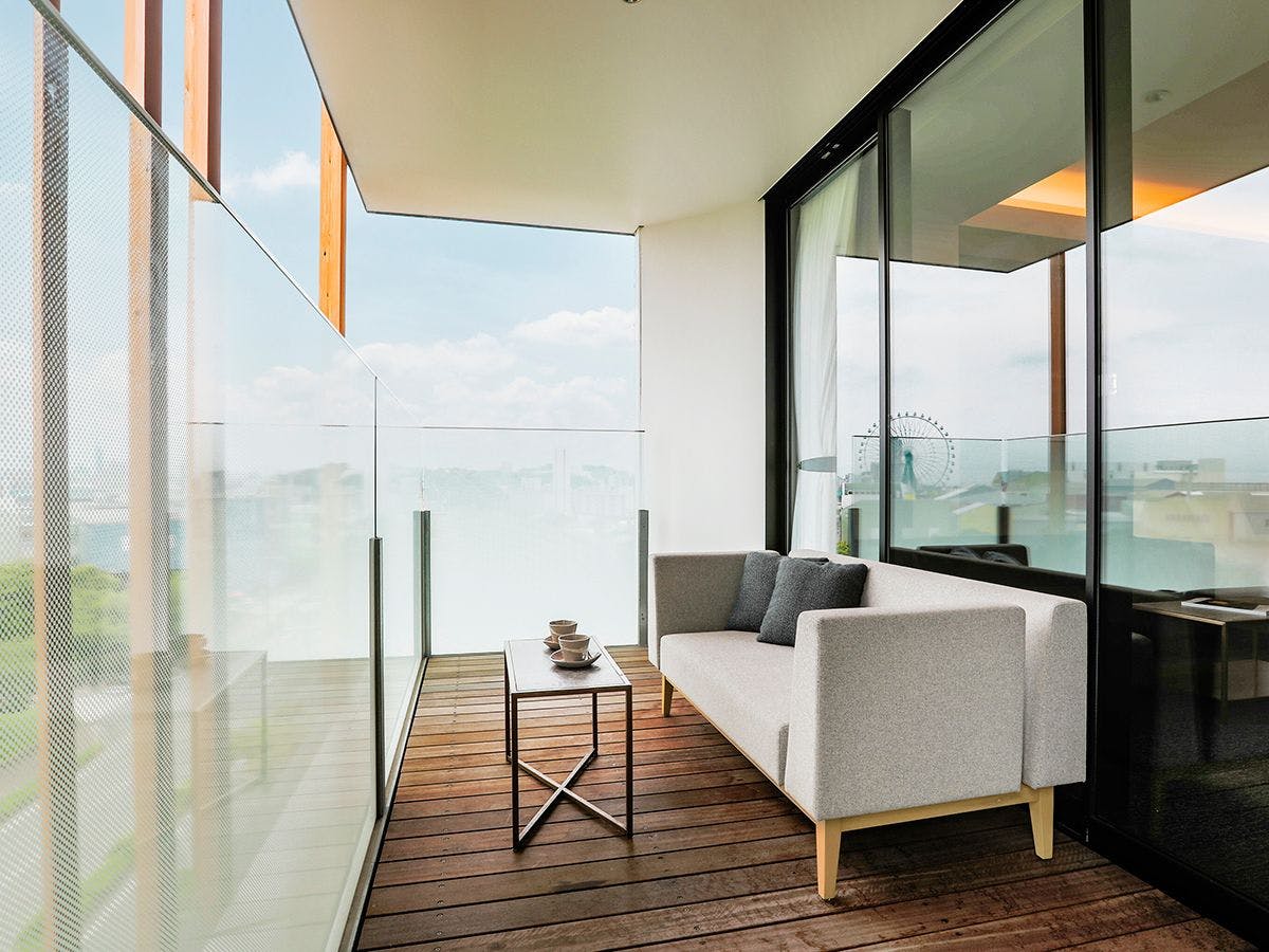 自由なバスタイムを楽しめるジャグジーにソファを設えたテラスなど、開放感とプライベート感を兼ね備えた優雅な一室。
