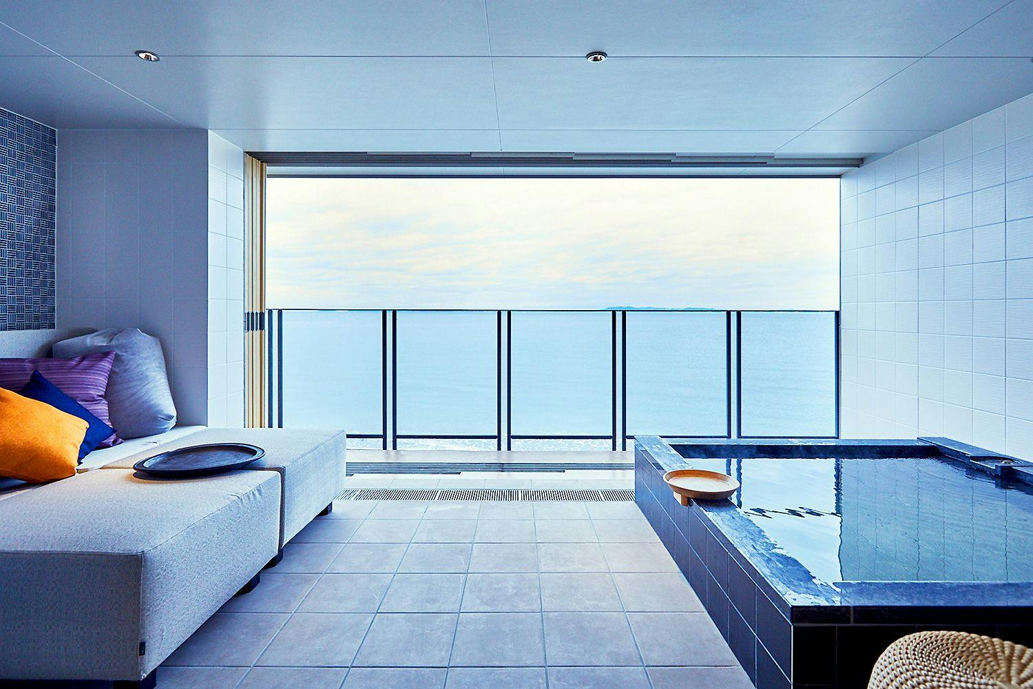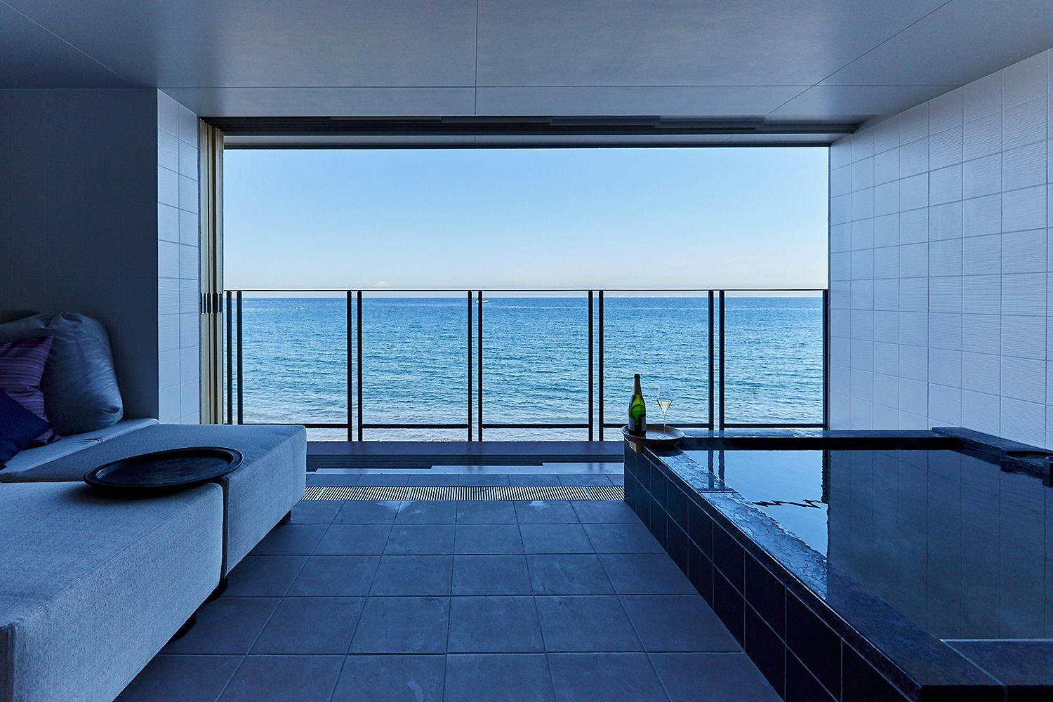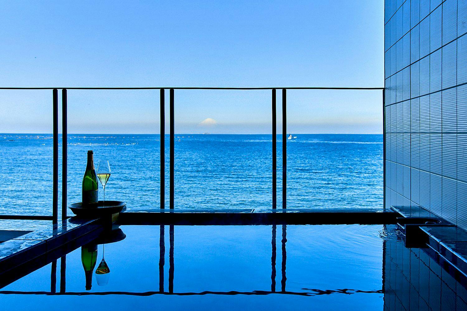全室露天風呂付オーシャンビュー客室とラグジュアリーな空間。目の前に広がるのは太平洋の大海原。都心から少し離れた非日常の特別な時間を過ごす大人のための宿。