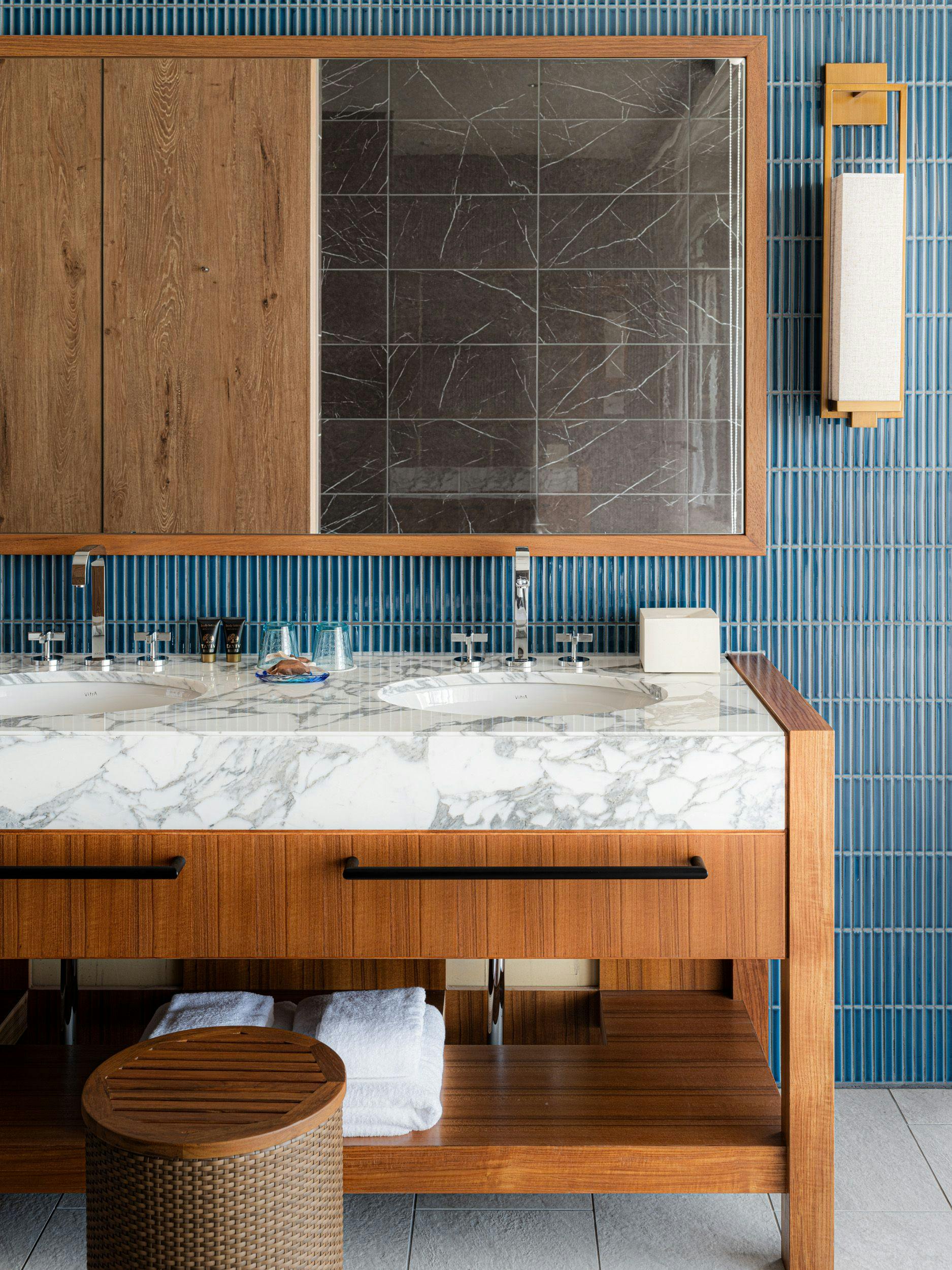 リゾート感溢れるボールタイプのバス、リビングルームとダイニングキッチン、2つのベッドルームには、それぞれにバス、トイレ、ベイシンがあります。