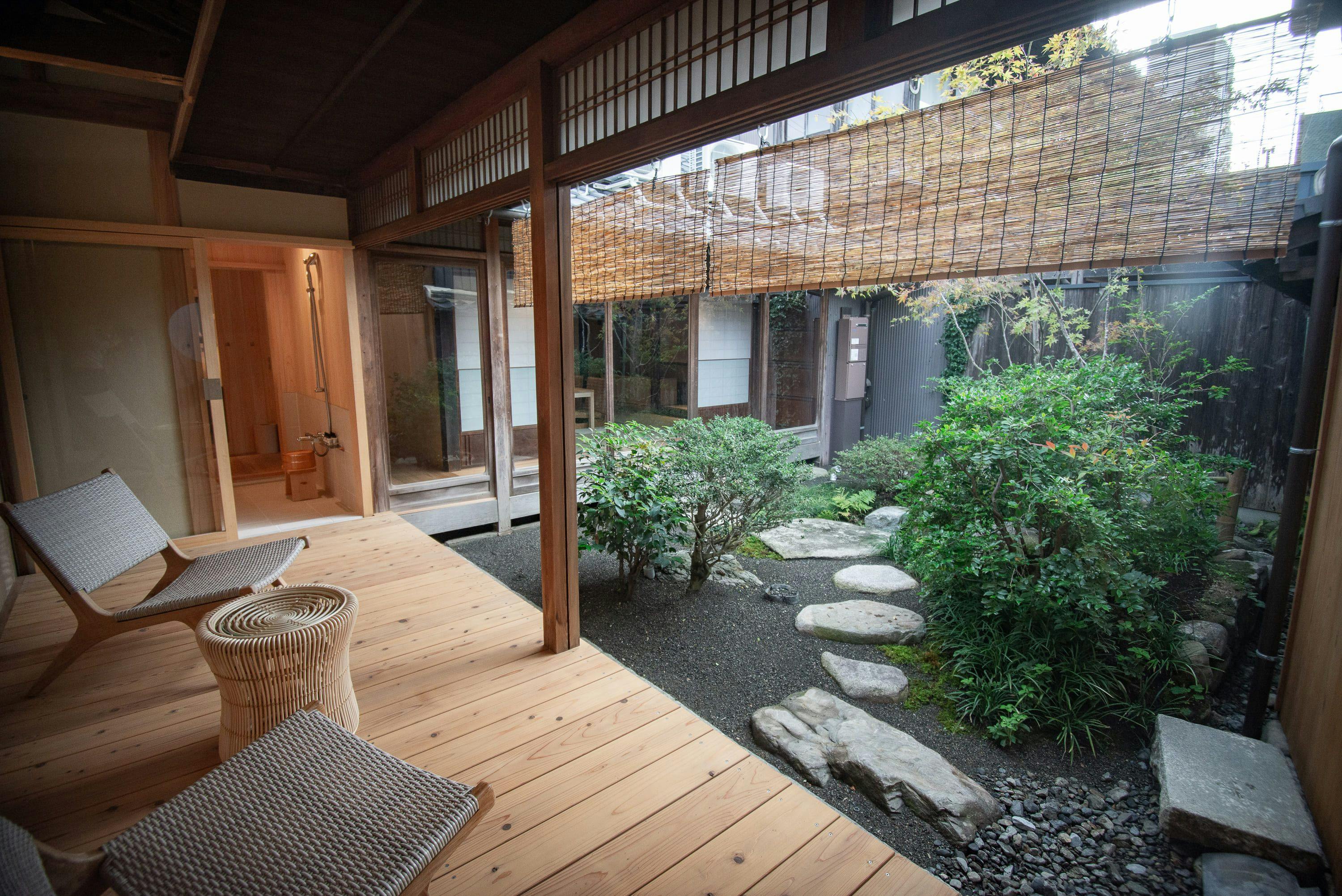 隆々とした梁など、建物の歴史を思わせる意匠を愉しみ、プライベートなお庭を縁側のデッキチェアから眺めつつ過ごす。
