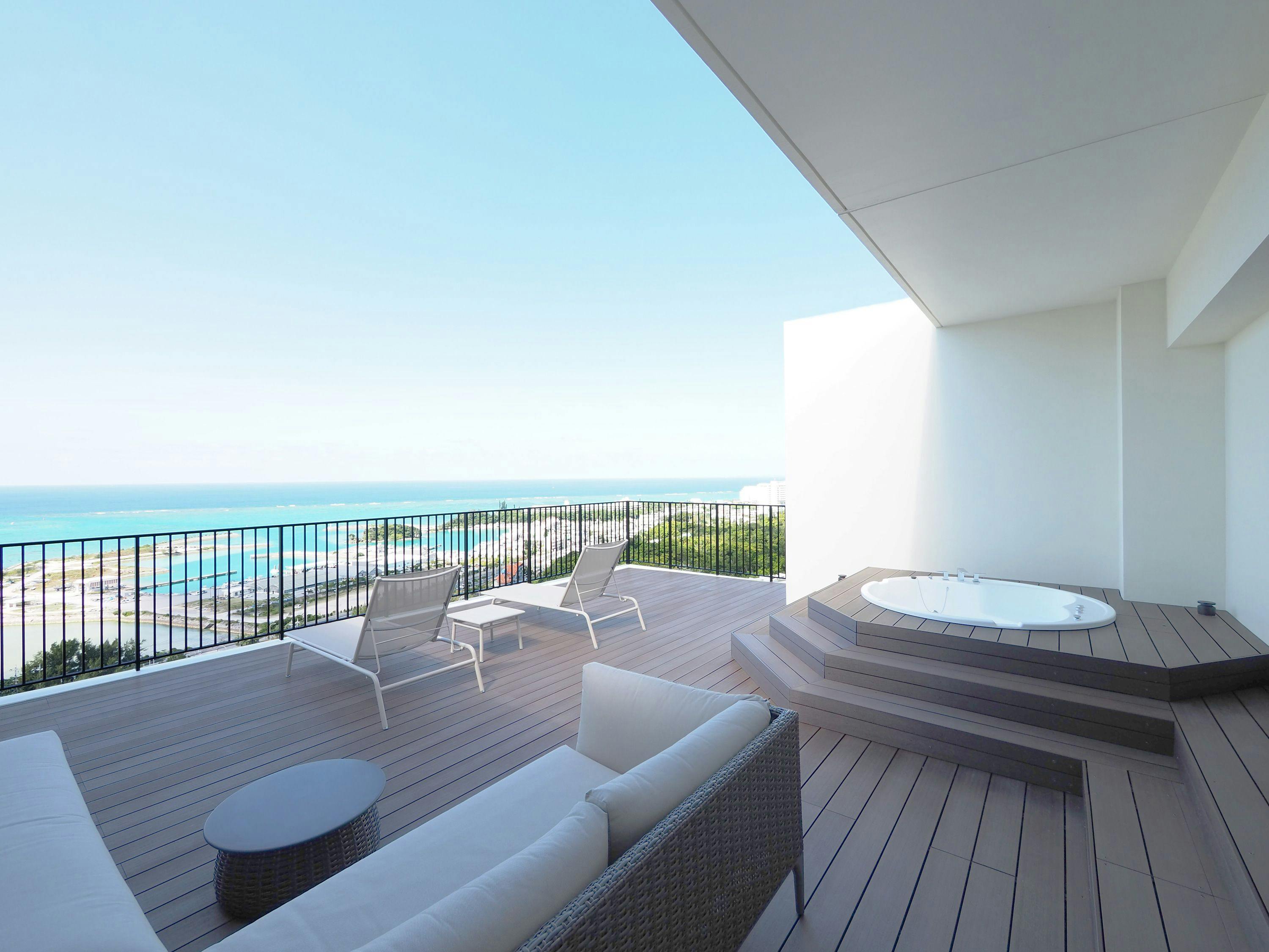 ホテル最上階に2室しかない、客室90平米+テラス68平米+天空ジャグジーバスを兼ね備えた特別室。最上階でしか見られない景色を眺める最上の時間を優雅にお過ごしいただけます。最上階の角部屋に位置するこのお部屋からは、海、空、恩納村全体を見渡すことができ、テラスの天空ジャグジーバスでくつろぎながら、ゆっくり景色を堪能できます。