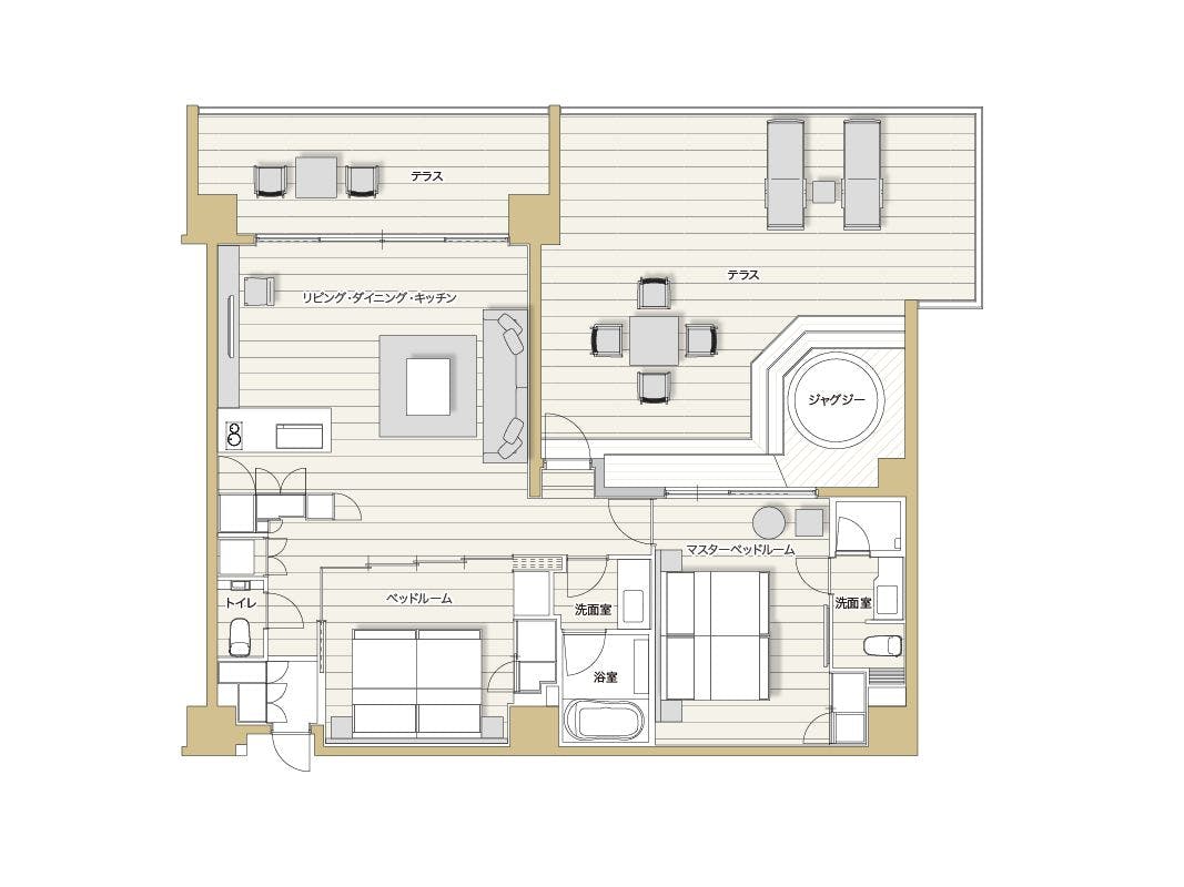 約14平米のテラスはリビングからフラットにつながり、約56平米のお部屋と合わせると約70平米の広いリゾート空間で優雅にお寛ぎいただけます。