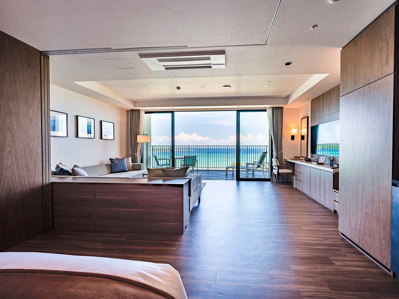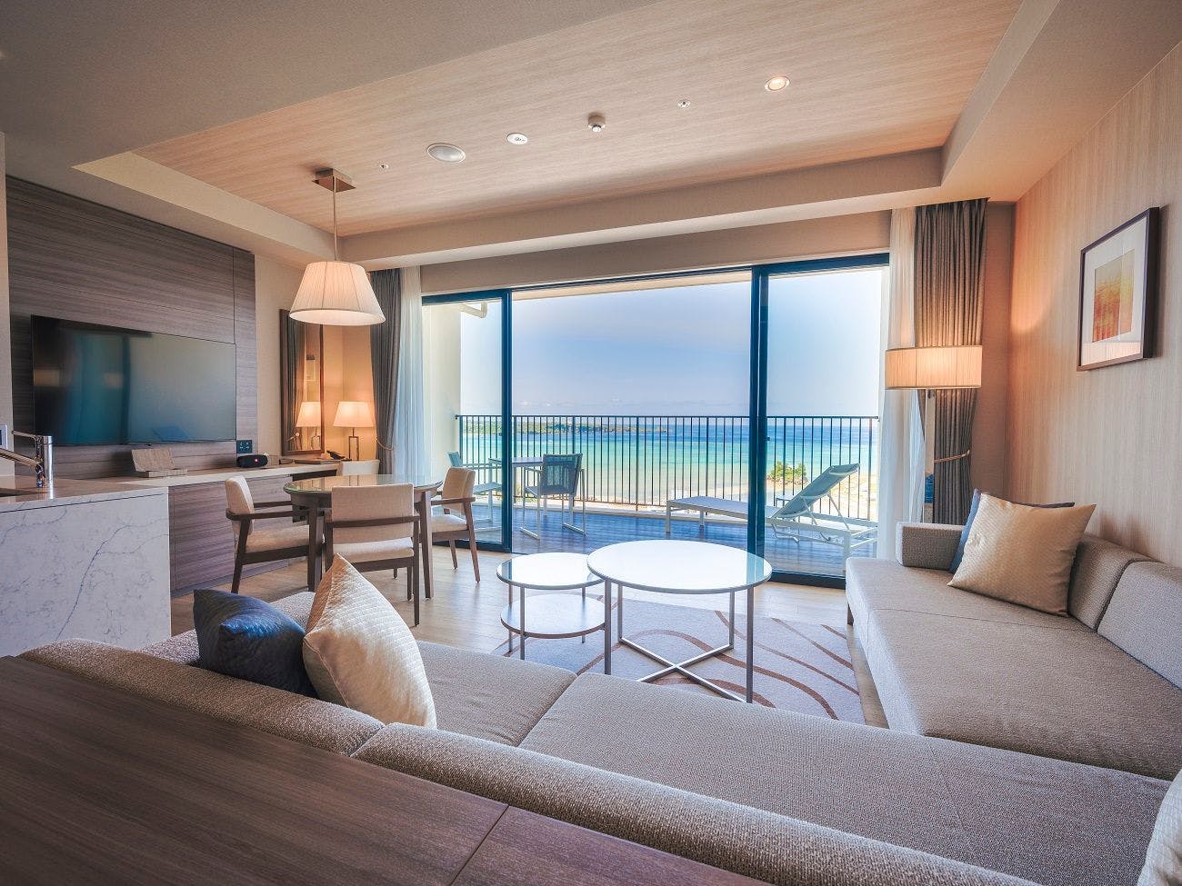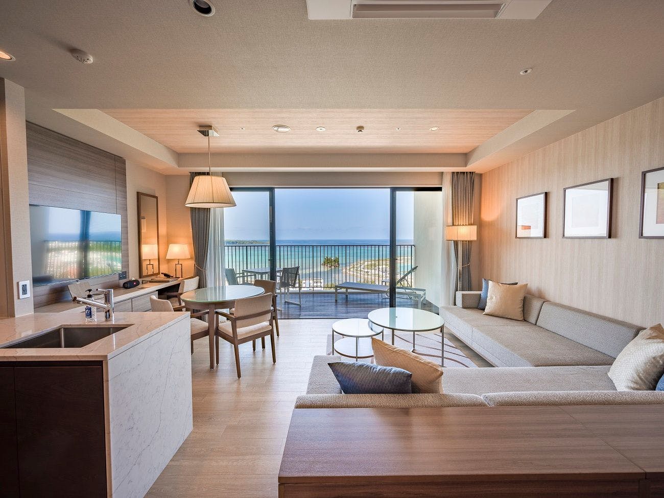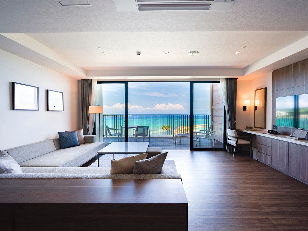 ワイドで開放的なテラスが心地よい、暮らすように滞在していただける全室オーシャンビュースイート。約14平米のテラスはリビングからフラットにつながり、約56平米のお部屋と合わせると約70平米の広いリゾート空間でお寛ぎいただけます。