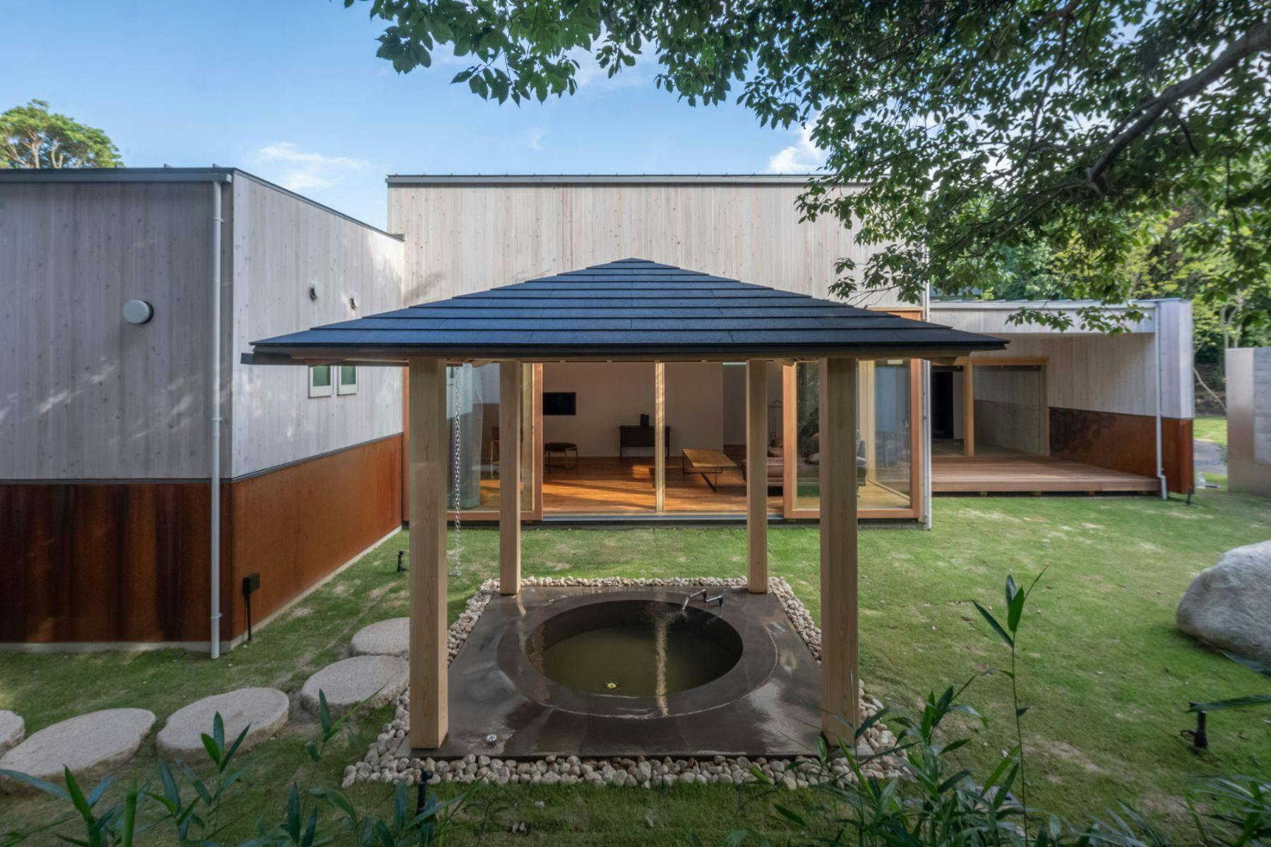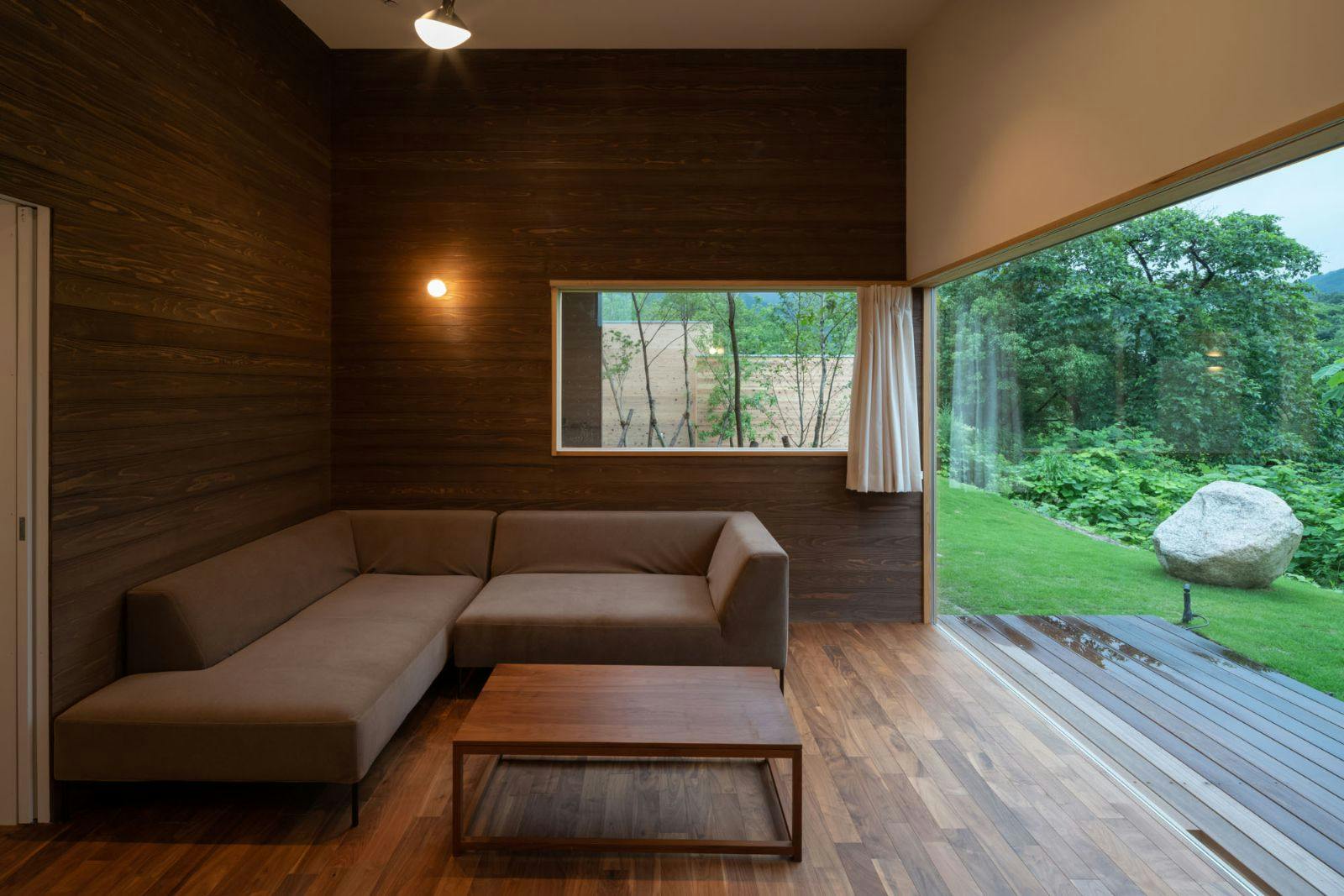 木造建築に鉄素材のひとつ、コールテン鋼を大胆に用いました。経年変化により浮かび上がる錆の質感が、山々の風景に溶け込みます。