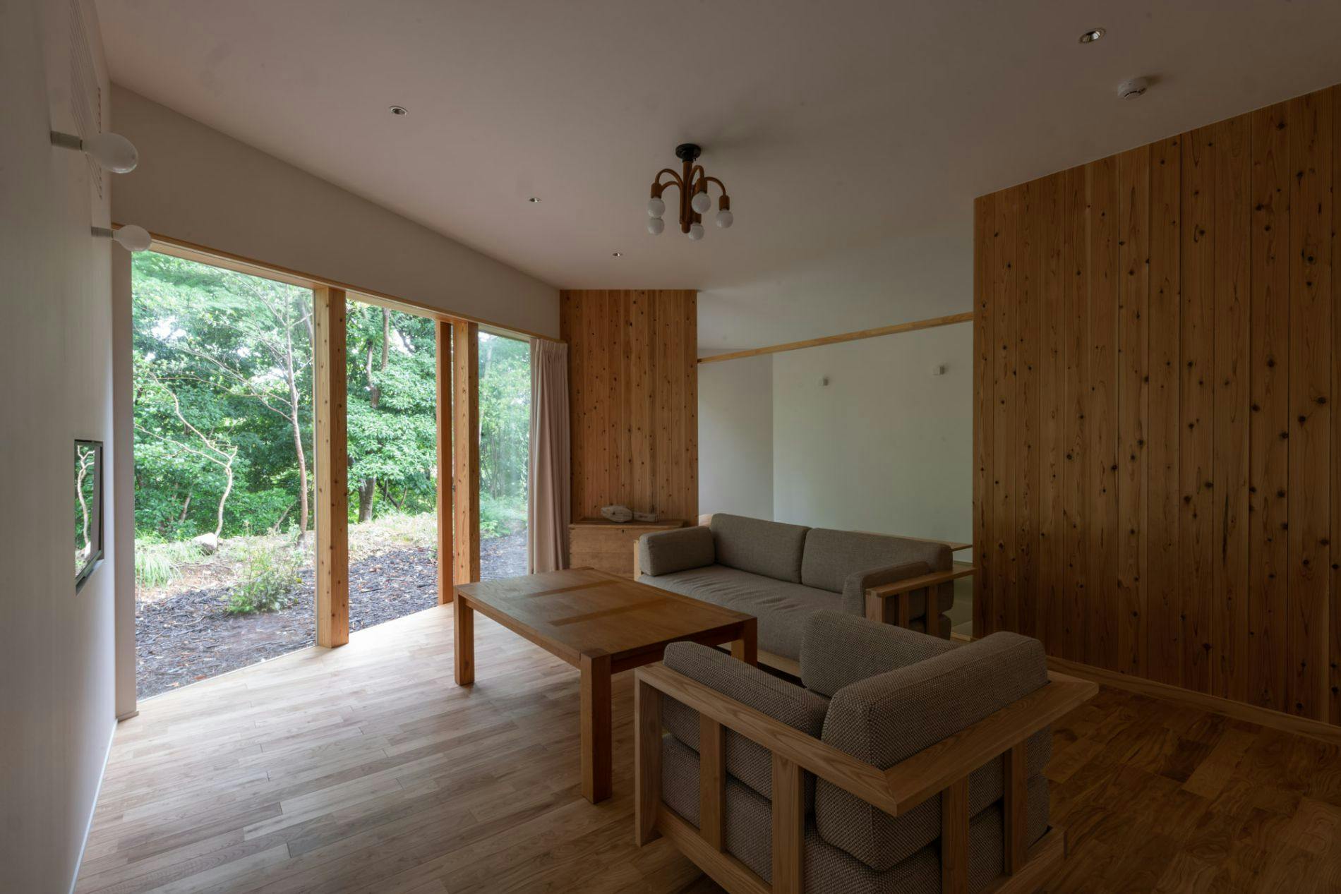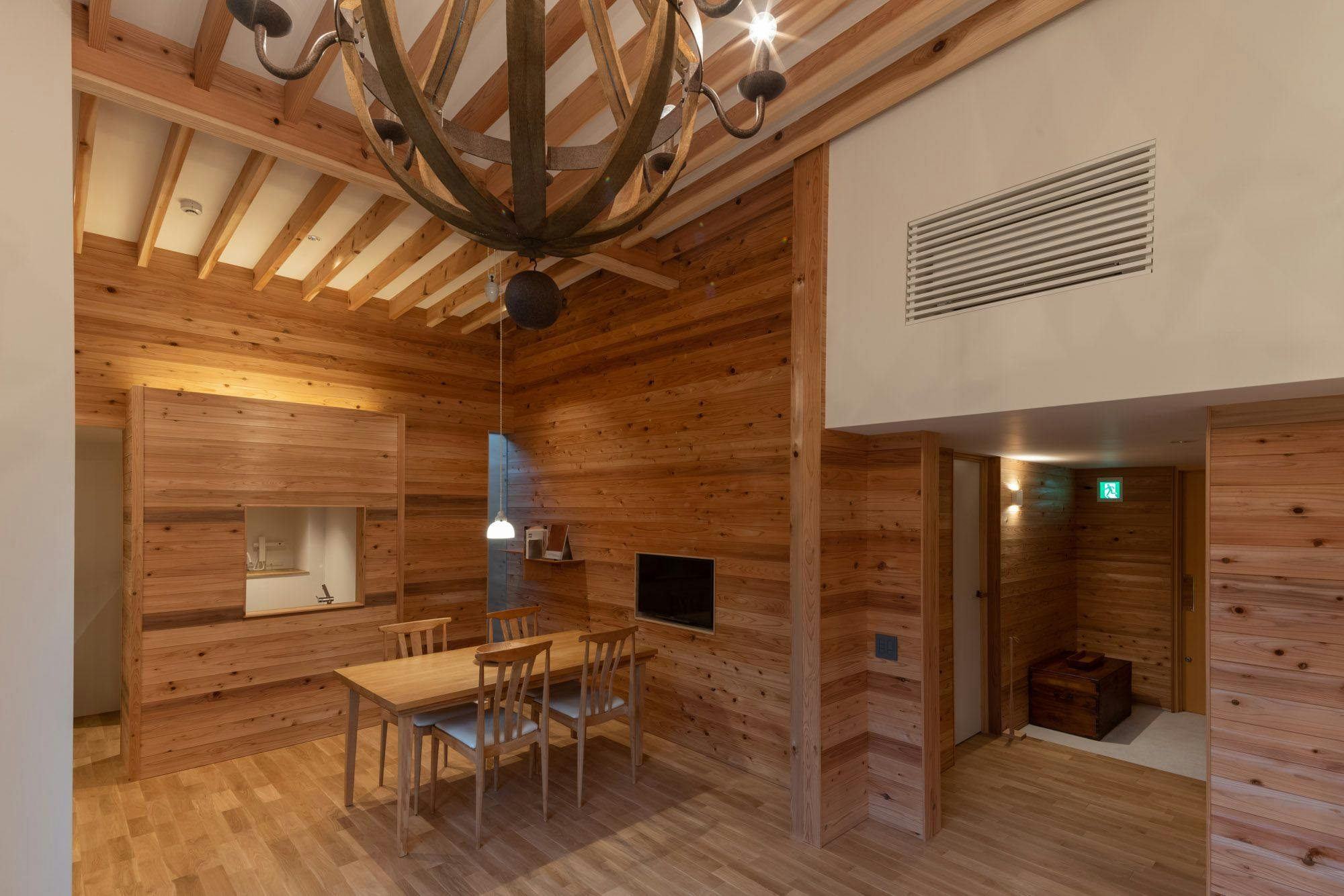 森に囲まれた高台に立つ棟には、スギ材をふんだんに使いました。無垢の木材に囲まれて、室内にいながら森林浴の気分を味わってください。