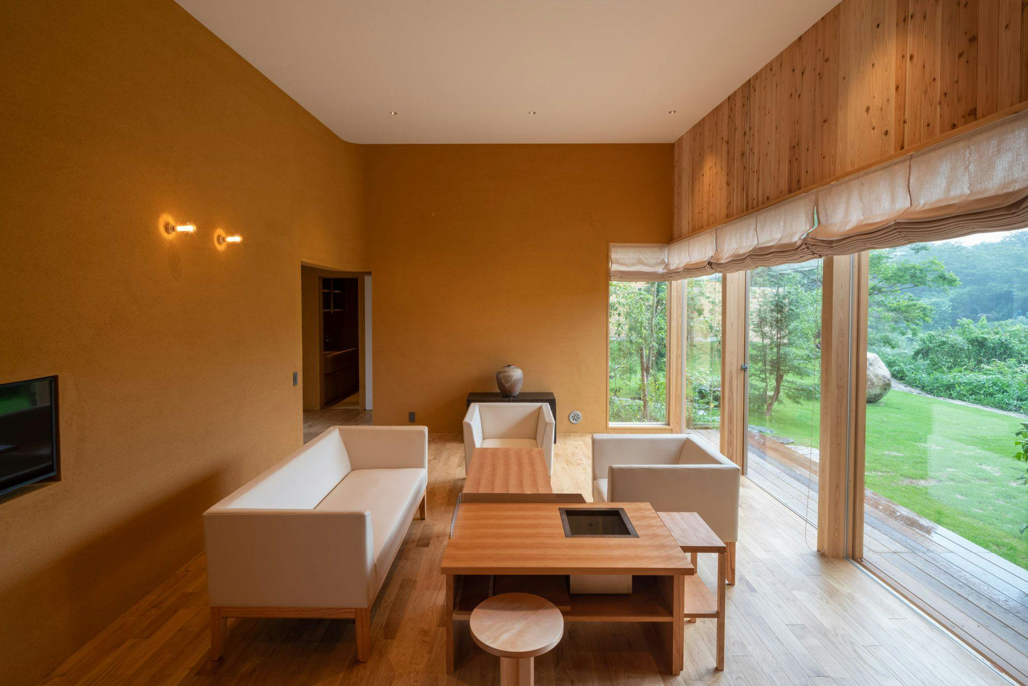 土、石、漆喰、木、漆、和紙、硝子、鉄の8つの素材をテーマにし、源泉掛け流しの露天風呂をしつらえた12のヴィラを持つ美術館のような宿。お食事は素材を生かした美味と滋味をお楽しみください。