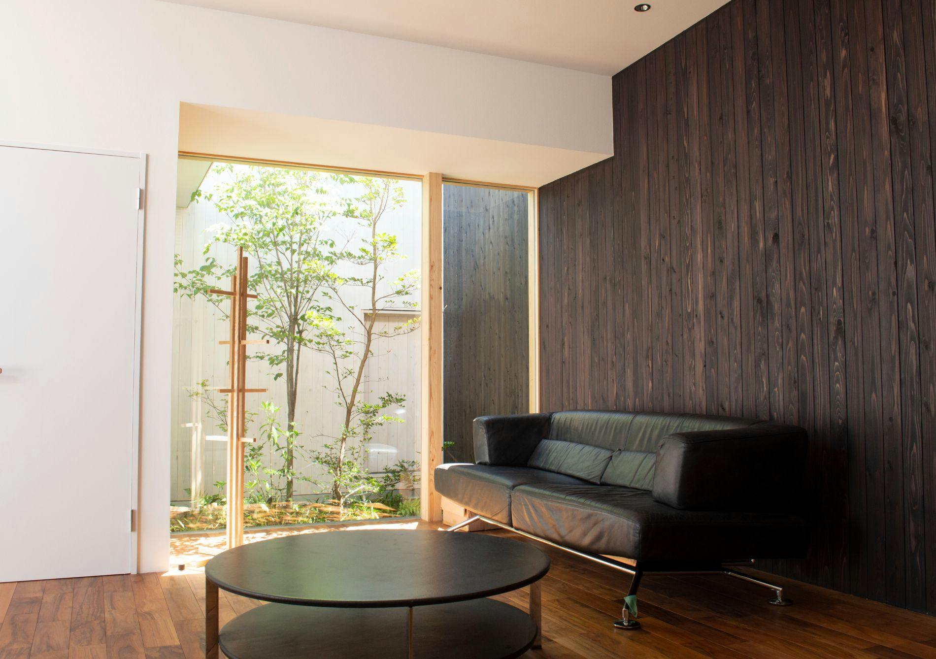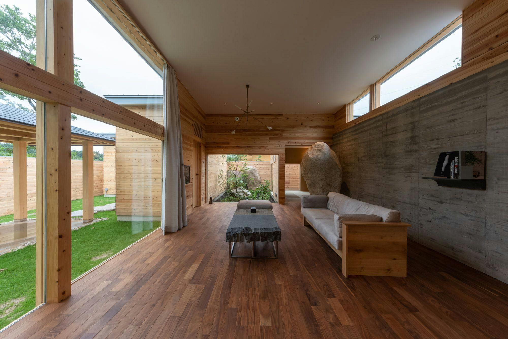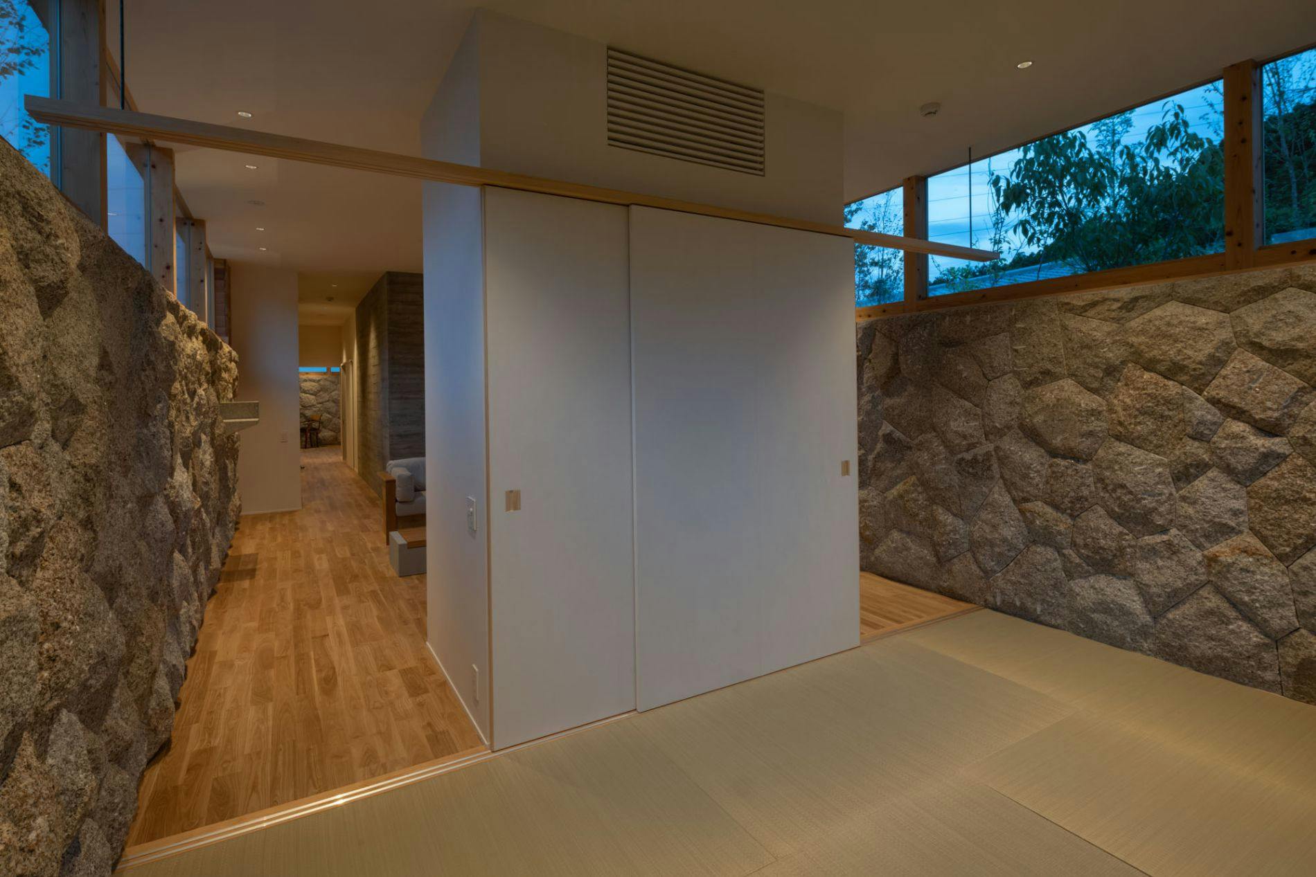 地元で産出する菰野石の巨石をアプローチとリビングに配しました。石に触れ、その力を肌で感じる。そんな非日常を体験できる空間です。