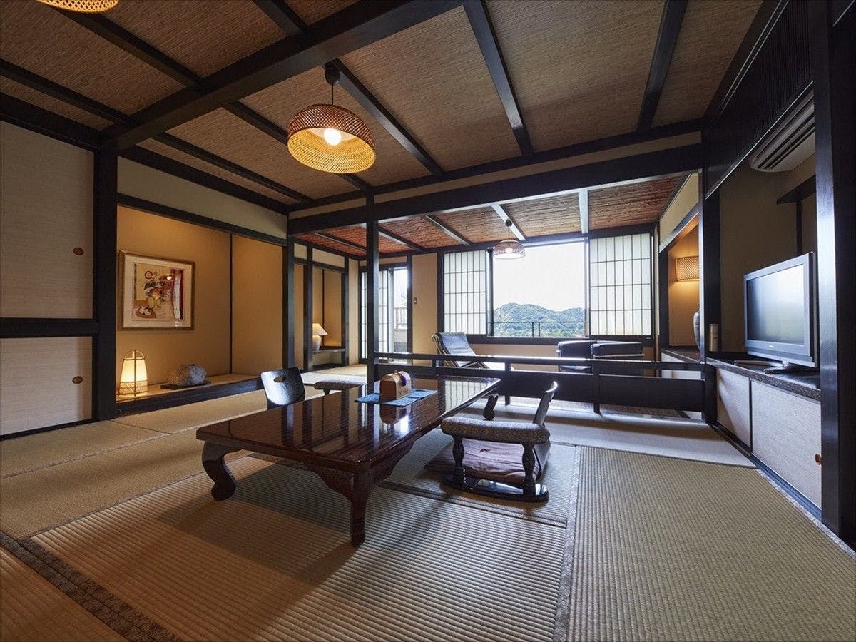 露天壺風呂付、和室にツインベッドを合わせた和モダンな空間をお楽しみください。