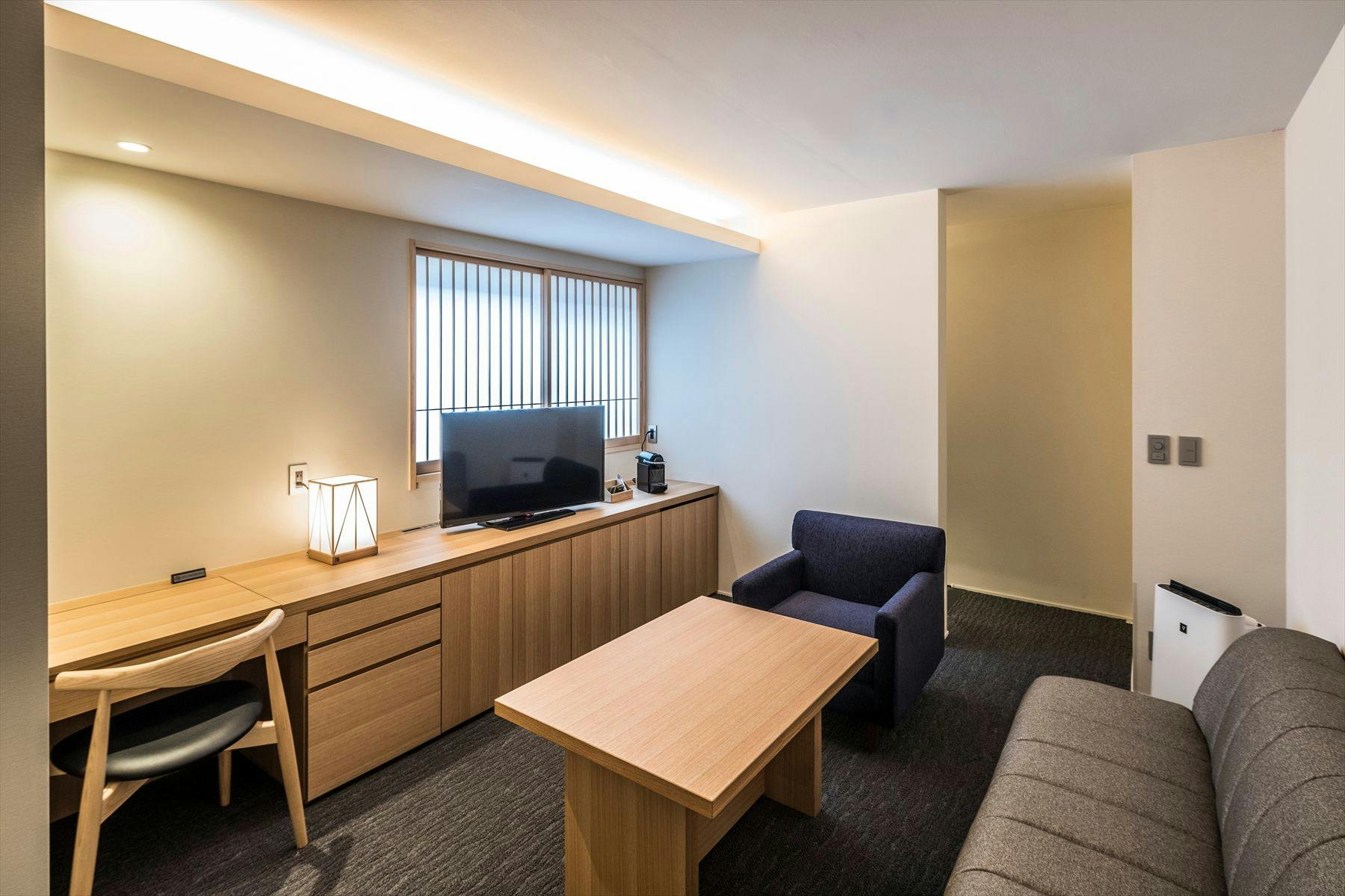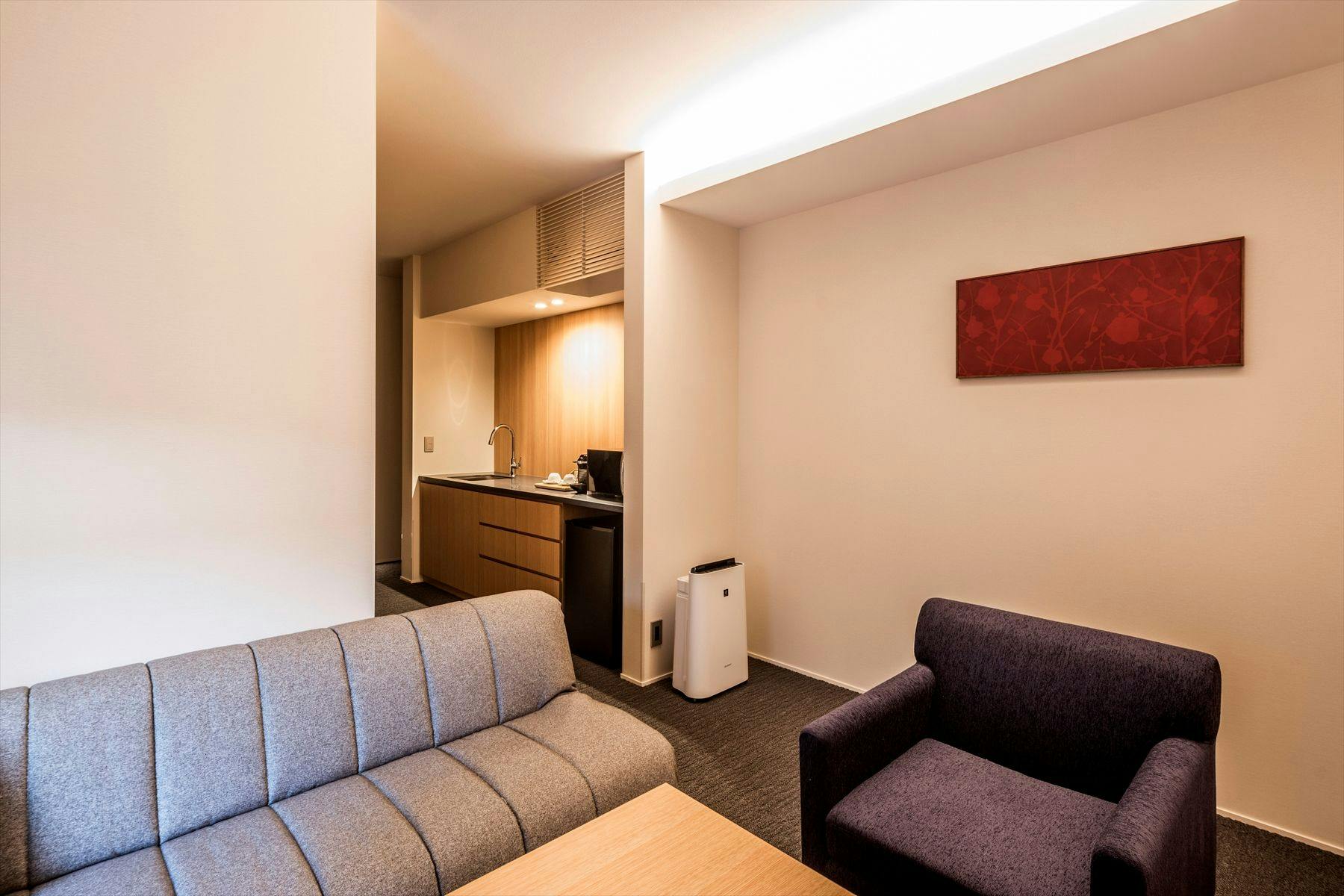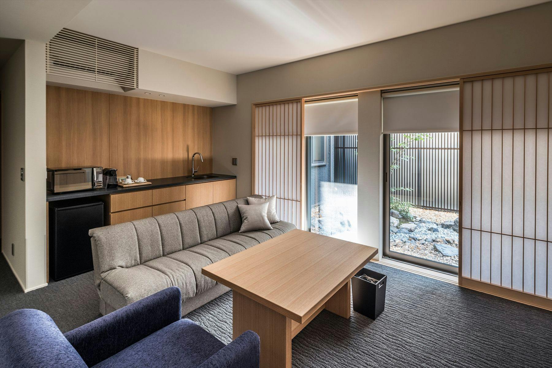 ソファで寛ぎながら専用の坪庭で京都の四季を感じる贅沢なひととき。独立したベッドルーム、リビングルームに使い勝手のいいキッチンを設けたお部屋。クローゼット内には専用洗濯機・衣類乾燥機を完備。長期滞在にも便利です。