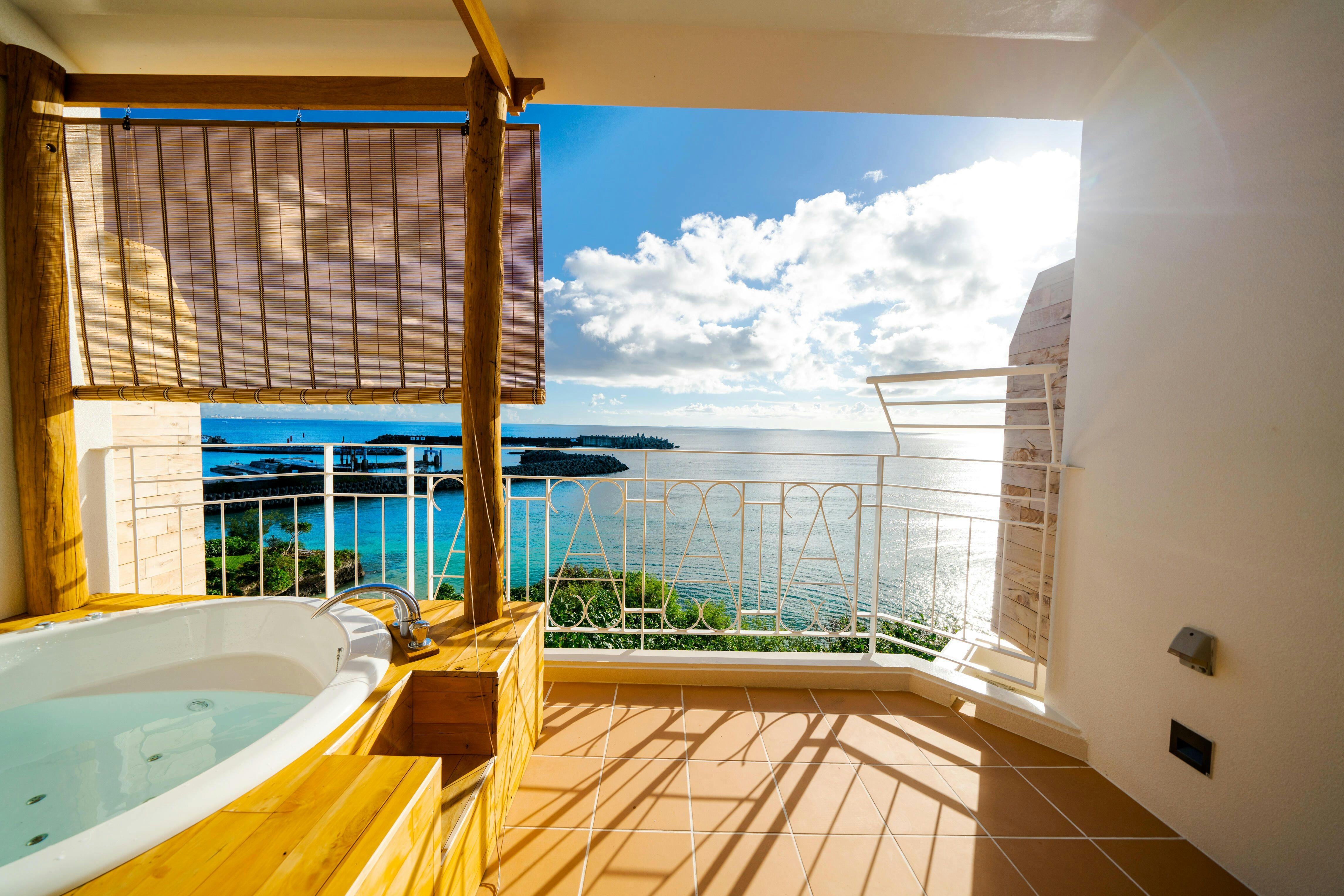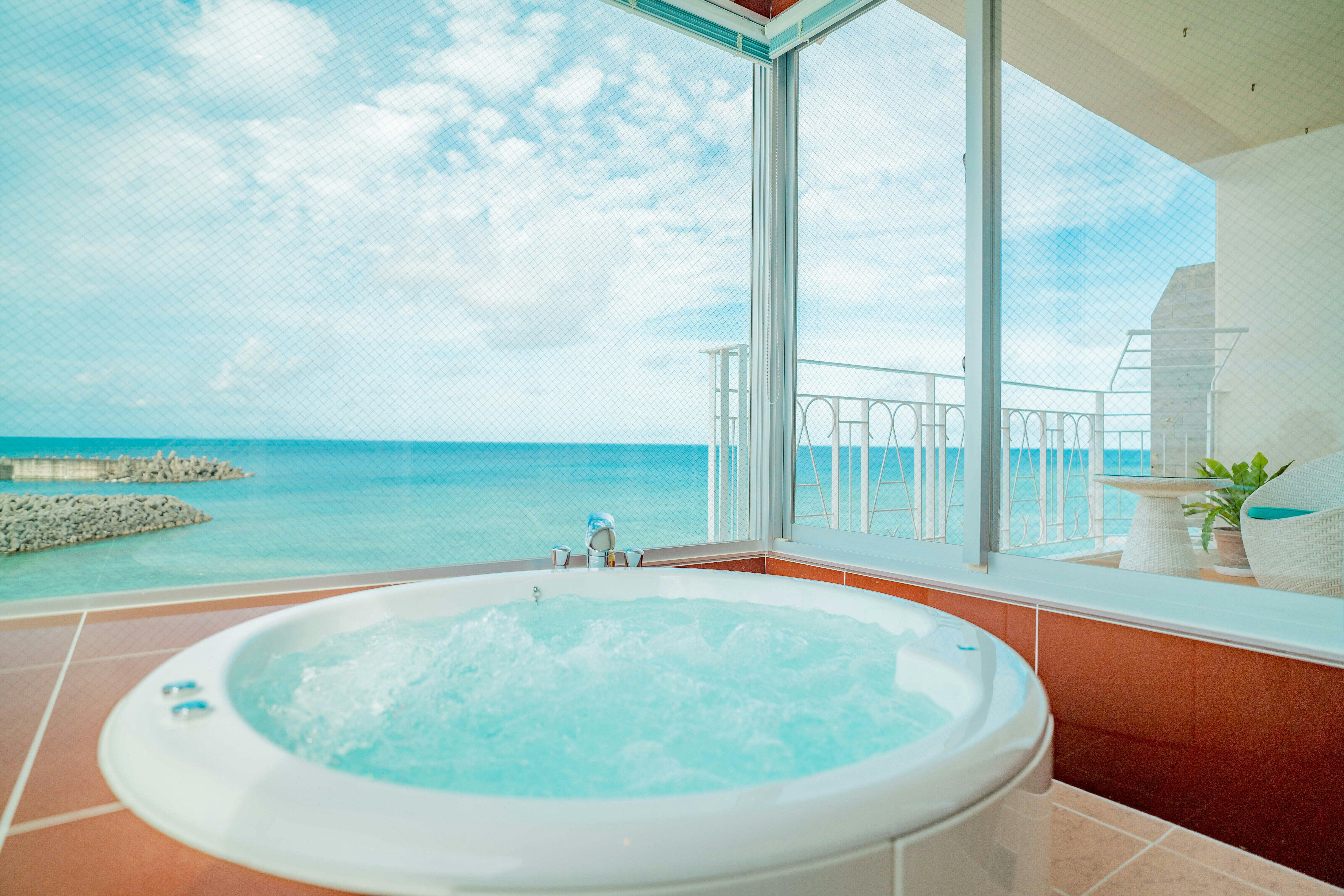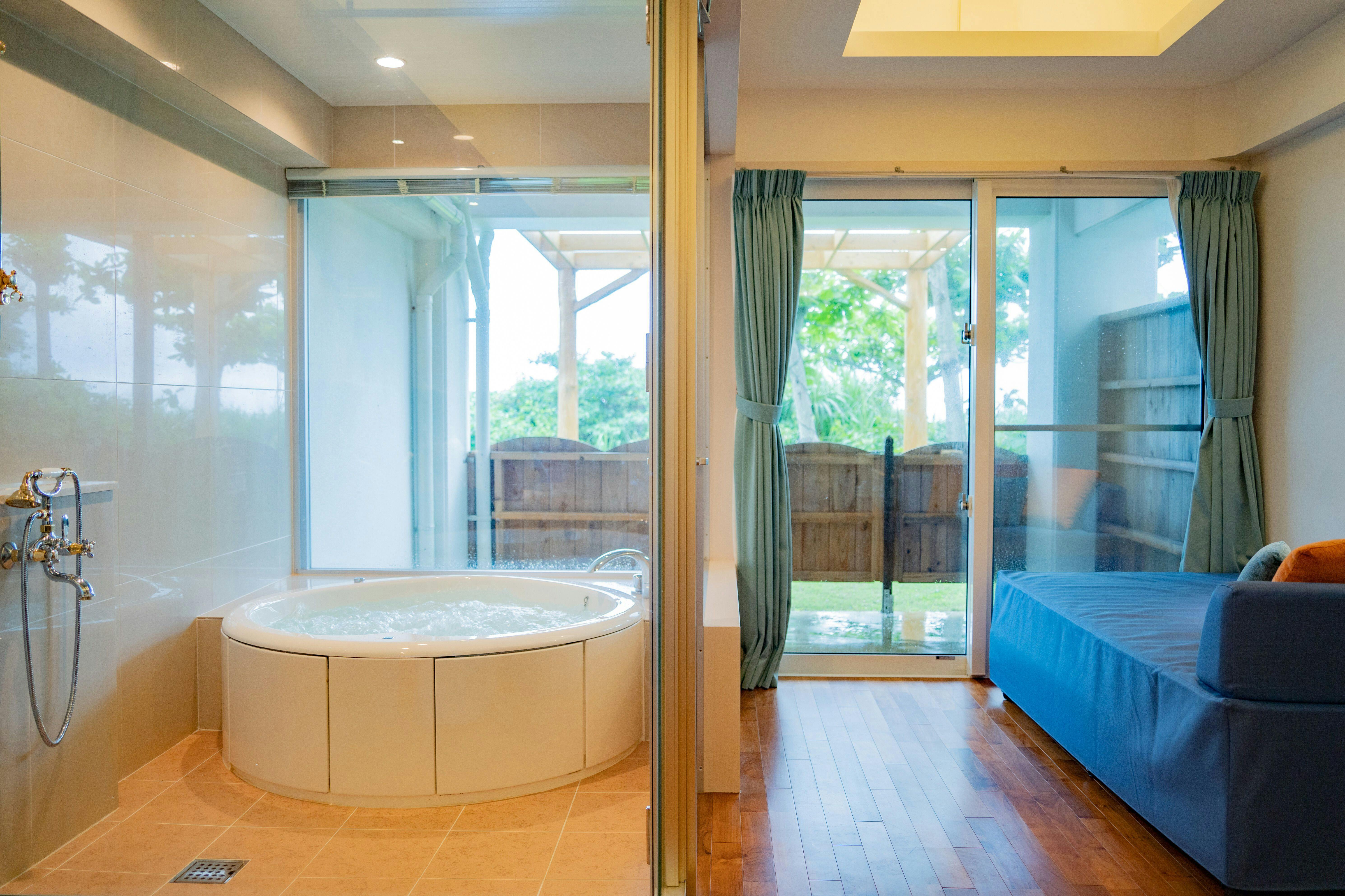 44平米、最大3名様までご利用可能。全室ジャグジー完備。【エメラルドグリーンにコバルトブルー】の海を見ながらのバスタイムを堪能できる解放感のあるテラス。木のぬくもりを感じる一枚板のカウンターテーブルにナイトテーブル等自社製作(手作り)IHキッチン完備/49型液晶テレビ/冷蔵庫/ケトル/ドリップポット/ヘルスメーター/金庫/ アメニティーは環境に配慮したLIMEXハブラシを使用し、シャンプーリンスはPOLAエステロワエを設置