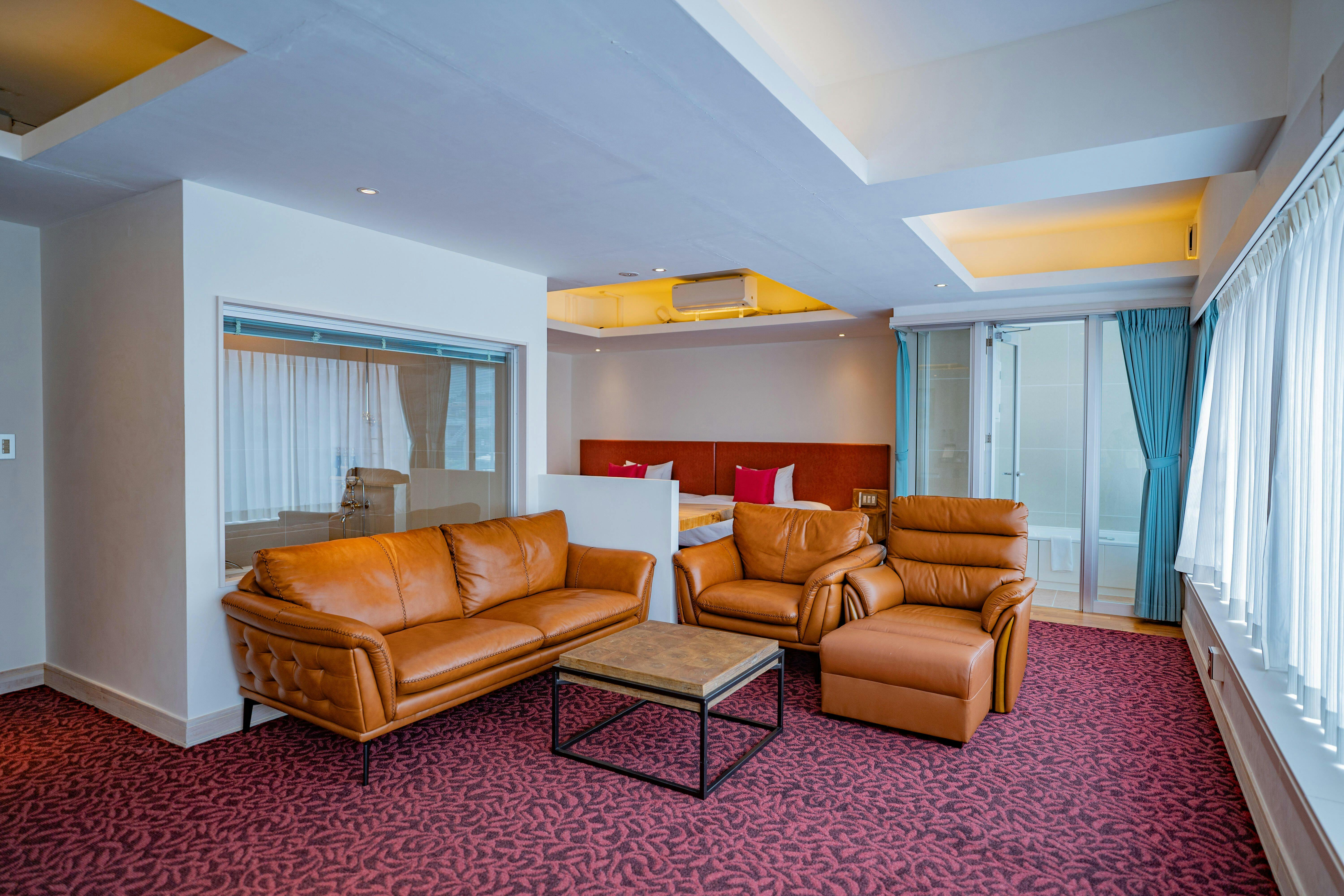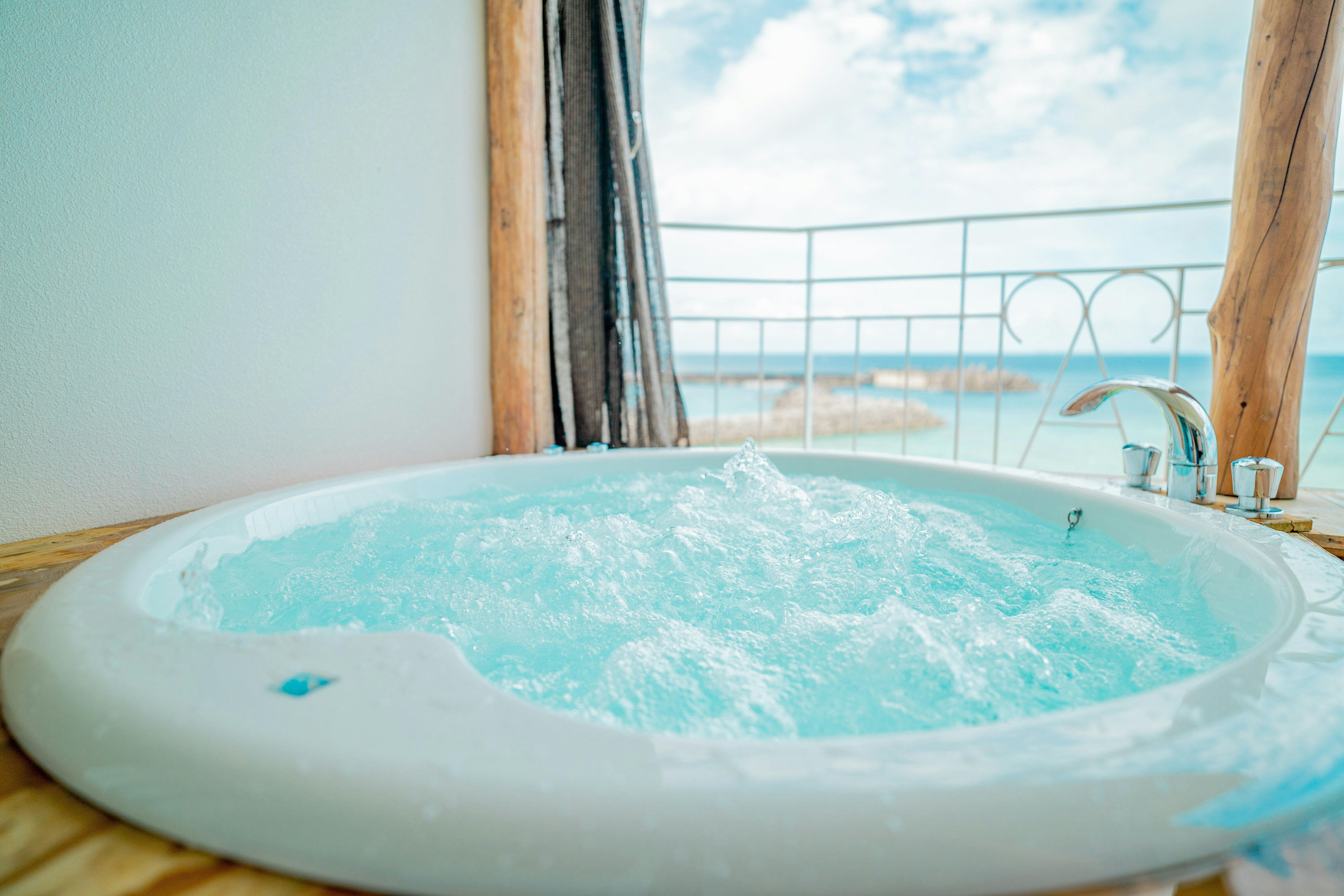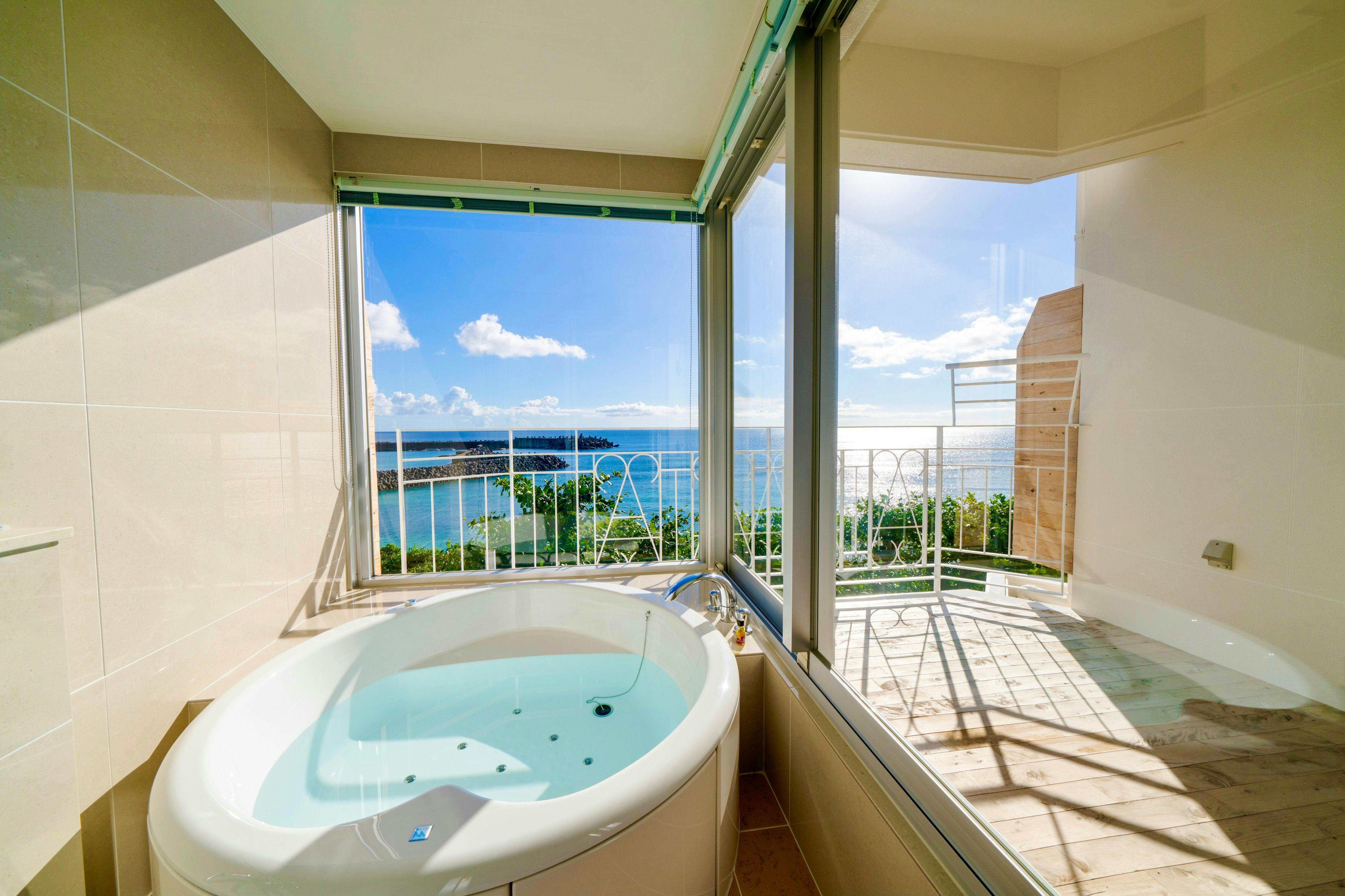 44平米、最大3名様までご利用可能。全室ジャグジー完備。【エメラルドグリーンにコバルトブルー】の海を見ながらのバスタイムを堪能できる解放感のあるテラス。木のぬくもりを感じる一枚板のカウンターテーブルにナイトテーブル等自社製作(手作り)IHキッチン完備/49型液晶テレビ/冷蔵庫/ケトル/ドリップポット/ヘルスメーター/金庫/ アメニティーは環境に配慮したLIMEXハブラシを使用し、シャンプーリンスはPOLAエステロワエを設置