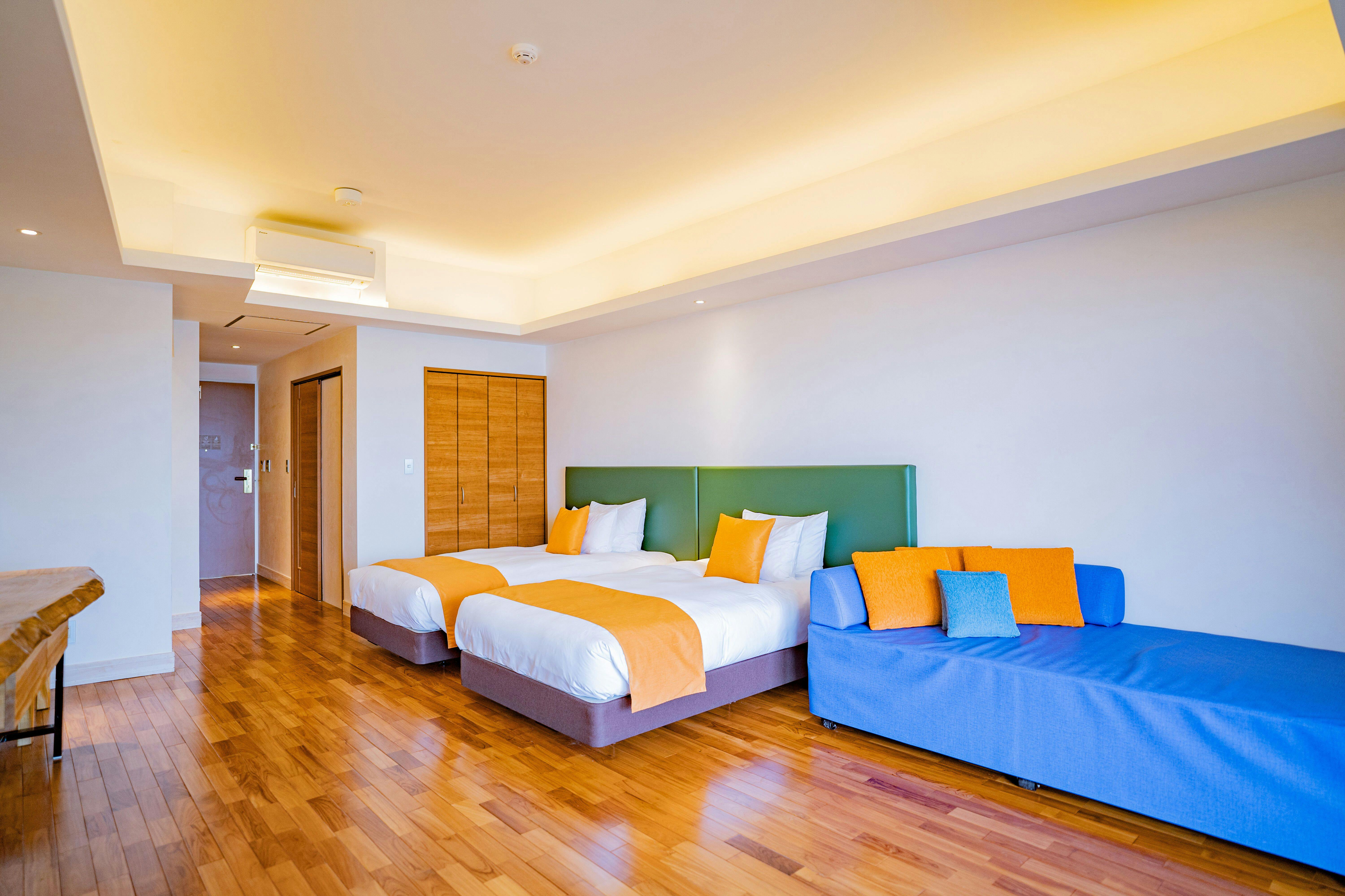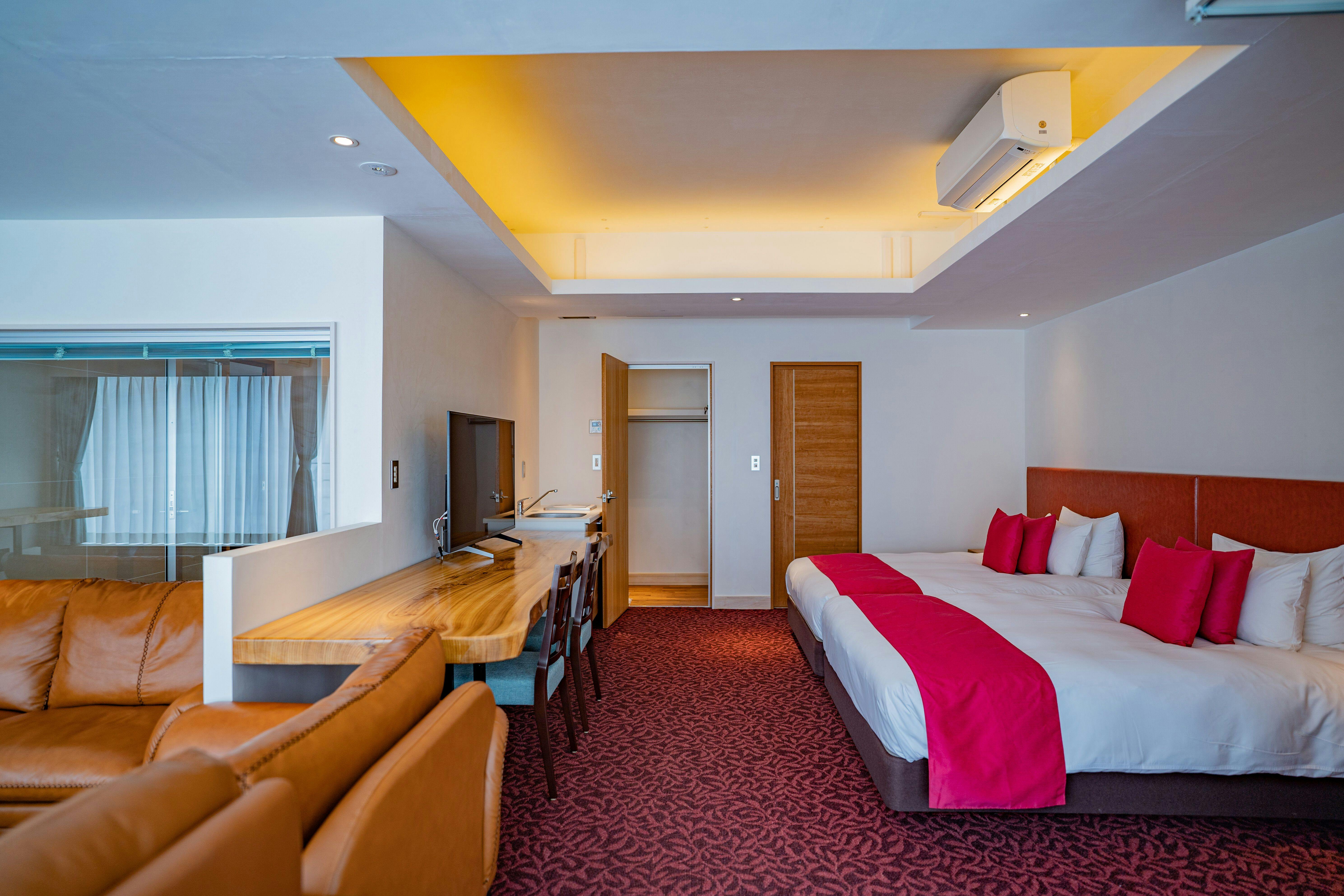 73平米、ダブルベッド2台、エキストラベッド1台で5名様までご利用可能。当館最大の広さを誇る優雅な空間。ファミリー旅行にぴったりです。木のぬくもりを感じる一枚板のカウンターテーブルにナイトテーブル等自社製作(手作り)IHキッチン完備/49型液晶テレビ2台/冷蔵庫/ケトル/ドリップポット/ヘルスメーター/金庫/ アメニティーは環境に配慮したLIMEXハブラシを使用し、シャンプーリンスはPOLAエステロワエを設置