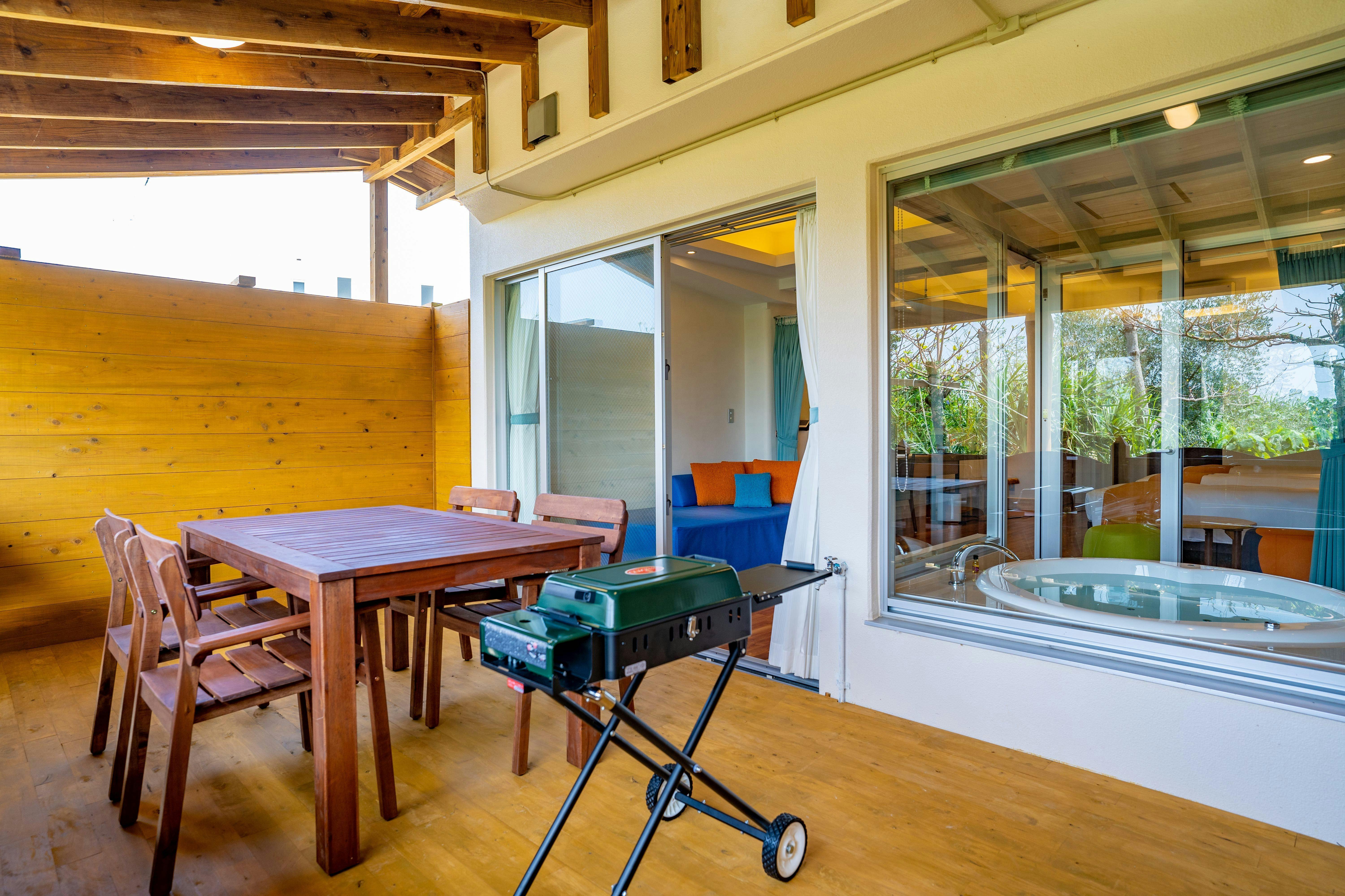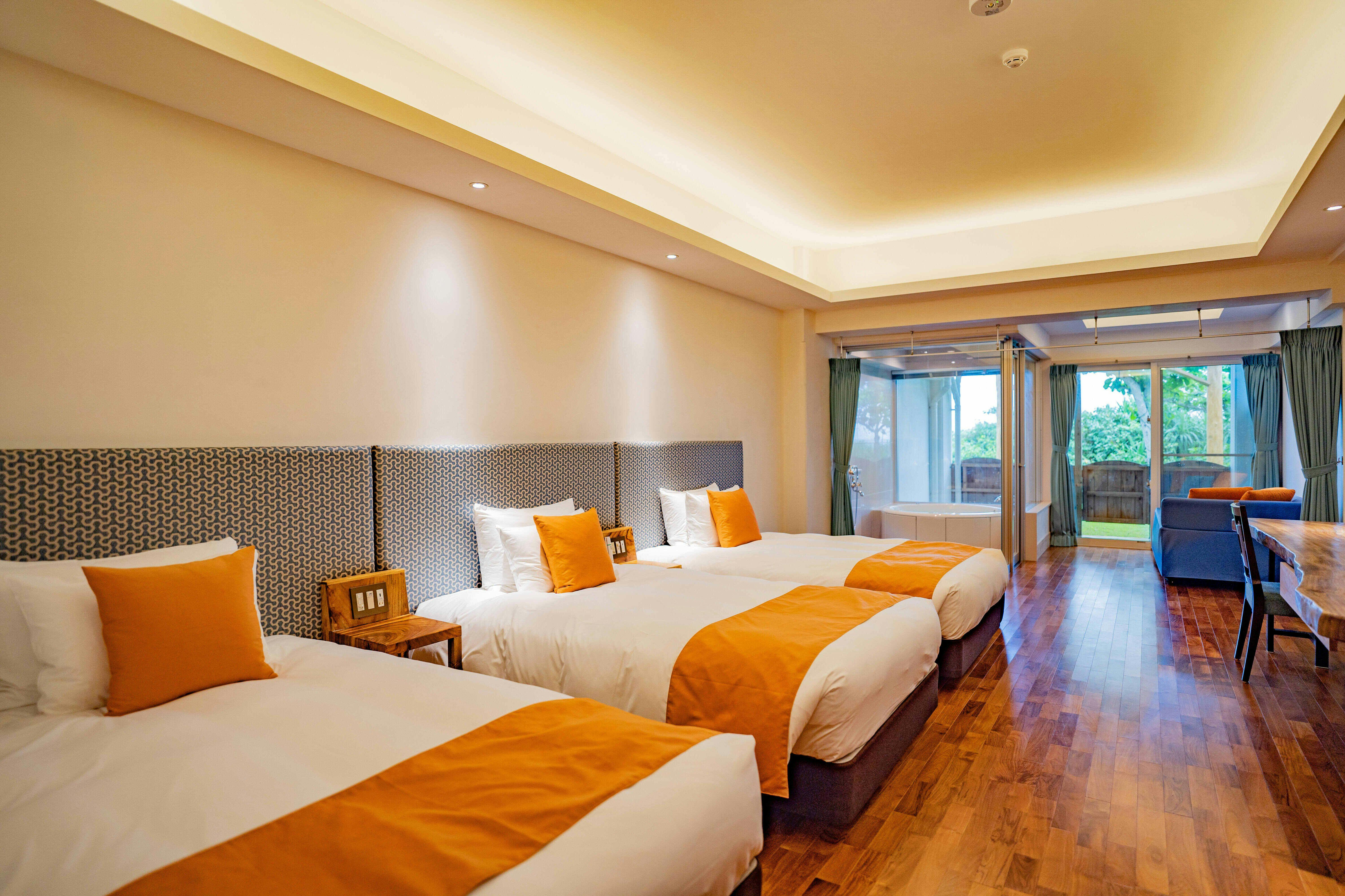51平米、最大4名様までご利用可能。ガーデンテラス付きファミリー及び小グループに適したジャグジー付きの客室。プール・ビーチにはテラスから直接アクセス可能です。木のぬくもりを感じる一枚板のカウンターテーブルにナイトテーブル等自社製作(手作り) IHキッチン完備/49型液晶テレビ/冷蔵庫/ケトル/ドリップポット/ヘルスメーター/金庫/ アメニティーは環境に配慮したLIMEXハブラシを使用し、シャンプーリンスはPOLAエステロワエを設置