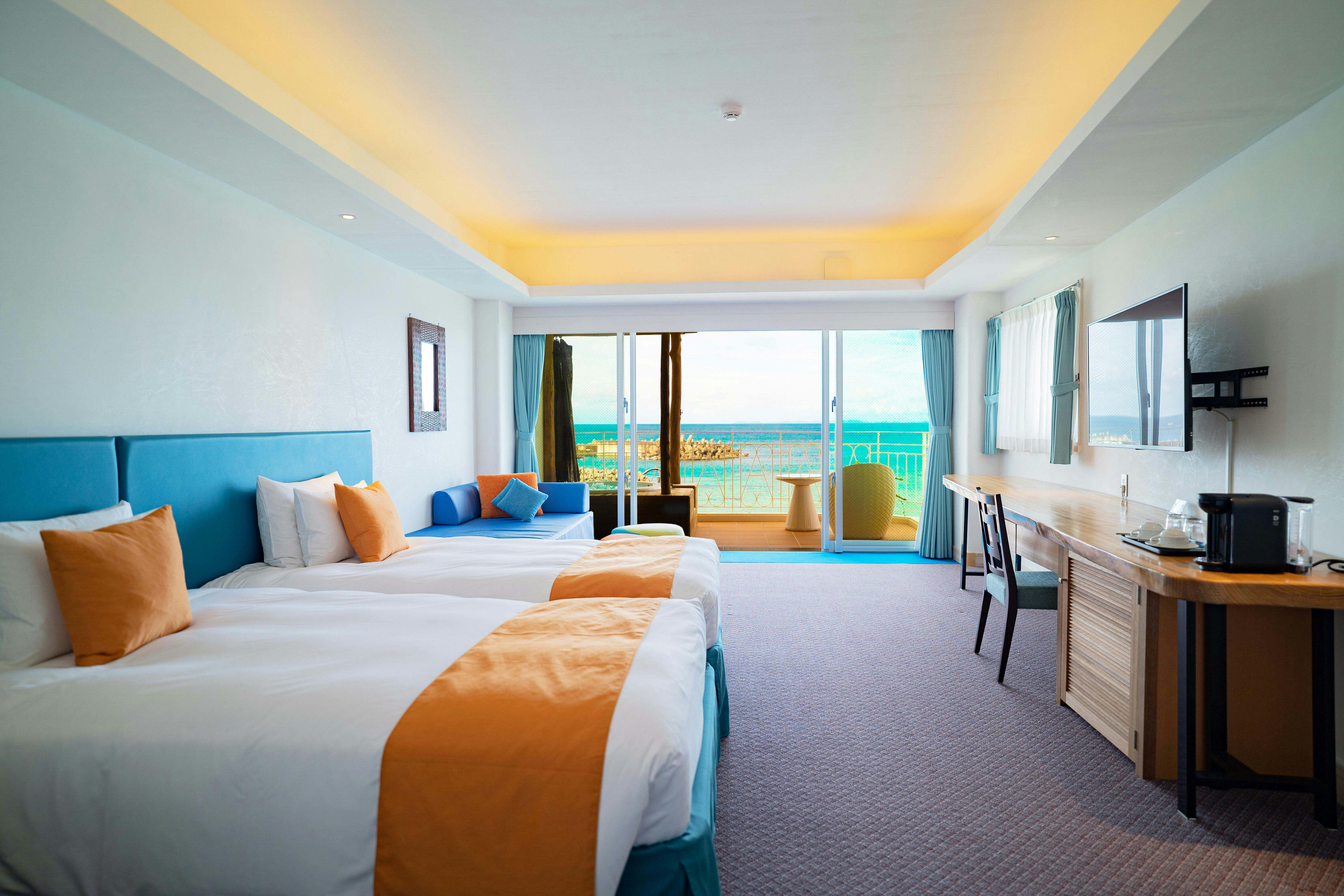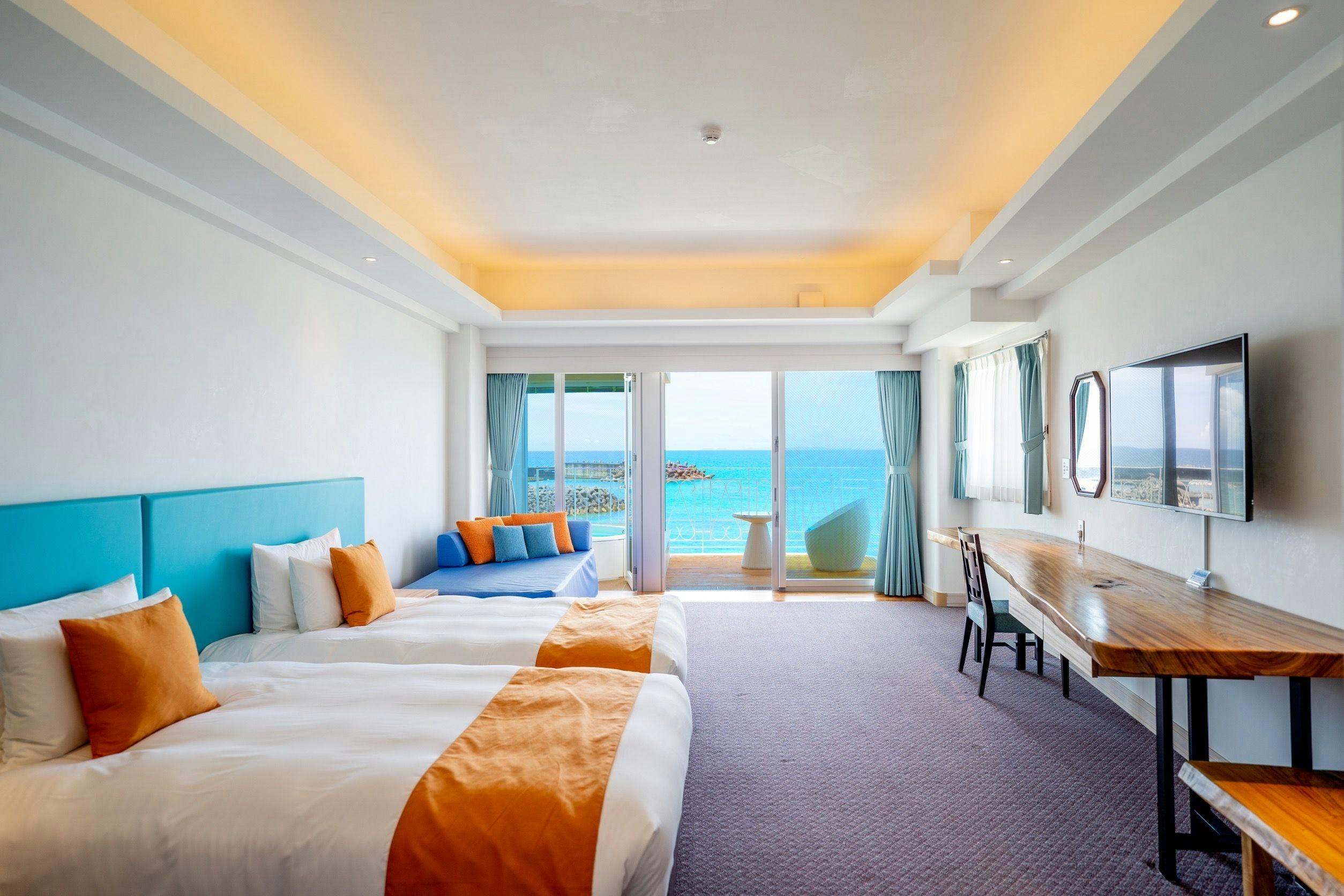 44平米、最大3名様までご利用可能。全室ジャグジーを設置し【エメラルドグリーンにコバルトブルー】の海を見ながらバスタイム。木のぬくもりを感じる一枚板のカウンターテーブルにナイトテーブル等自社製作(手作り) IHキッチン完備/49型液晶テレビ/冷蔵庫/ケトル/ドリップポット/ヘルスメーター/金庫/ アメニティーは環境に配慮したLIMEXハブラシを使用し、シャンプーリンスはPOLAエステロワエを設置