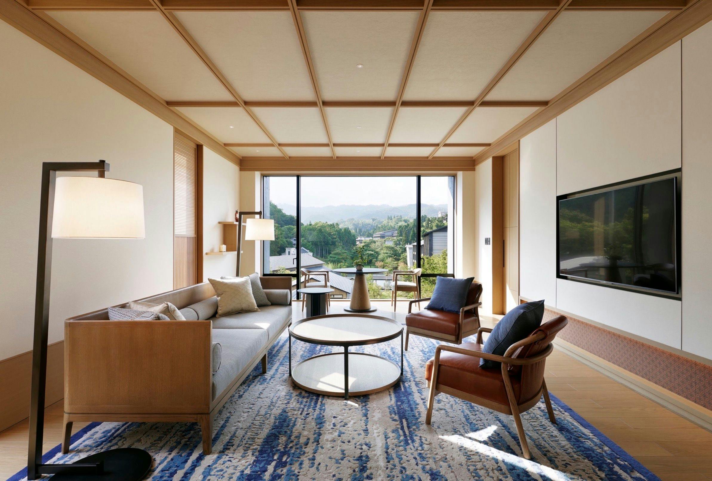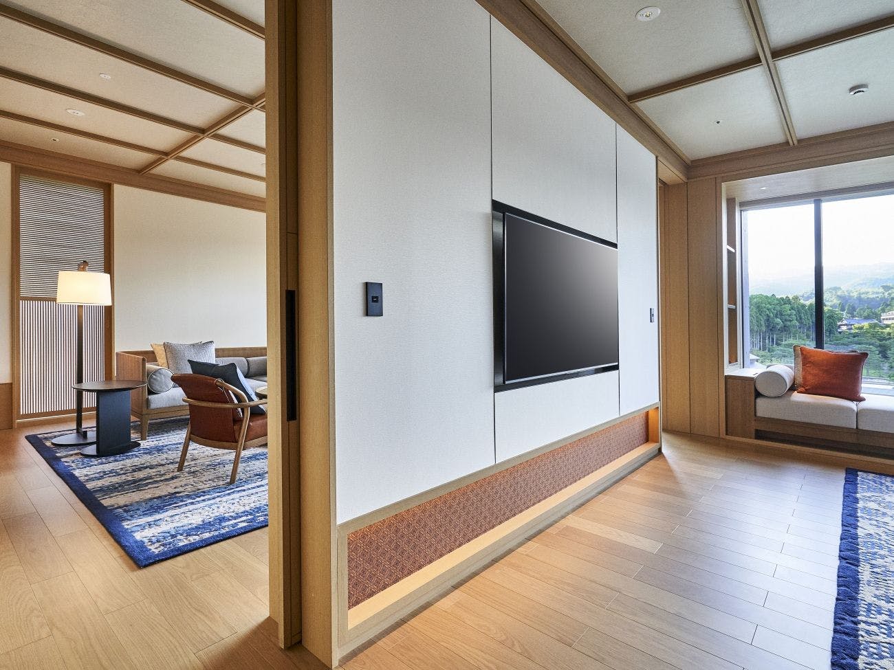 100平米の客室にはアートワークが随所に飾られ、自然と調和した空間をお届けいたします。客室の窓からは鷹峯三山の頂が望め、四季折々の景観をお楽しみいただけます。