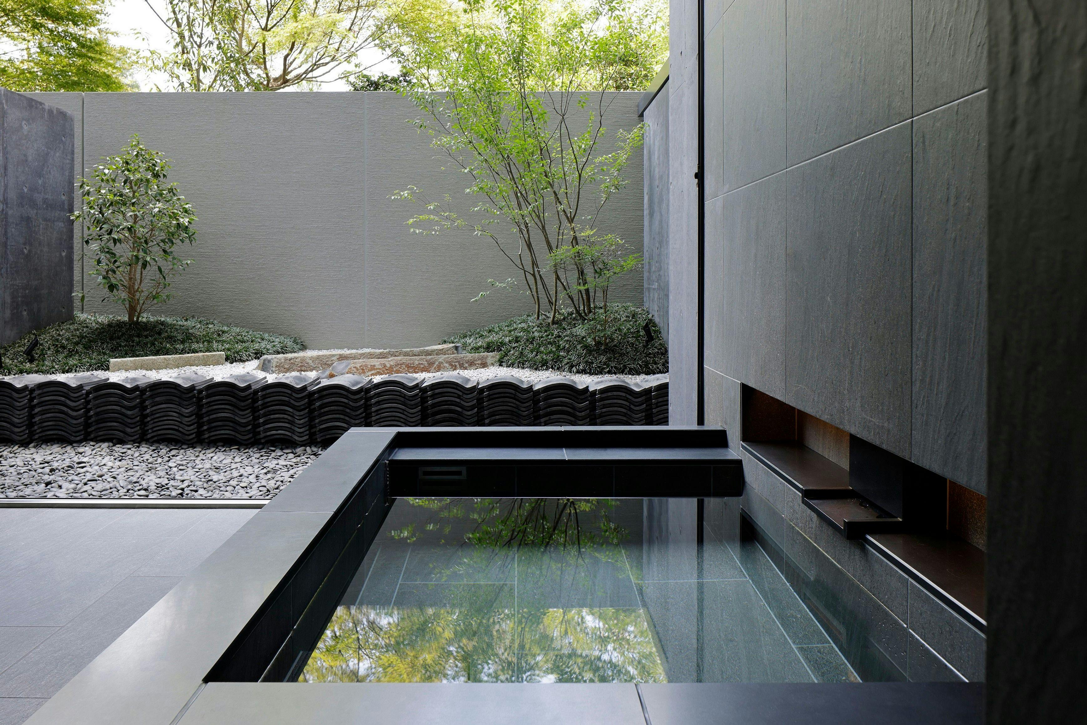 プライベートガーデンを望む半露天風呂にもなる温泉が付いた67平米の客室。