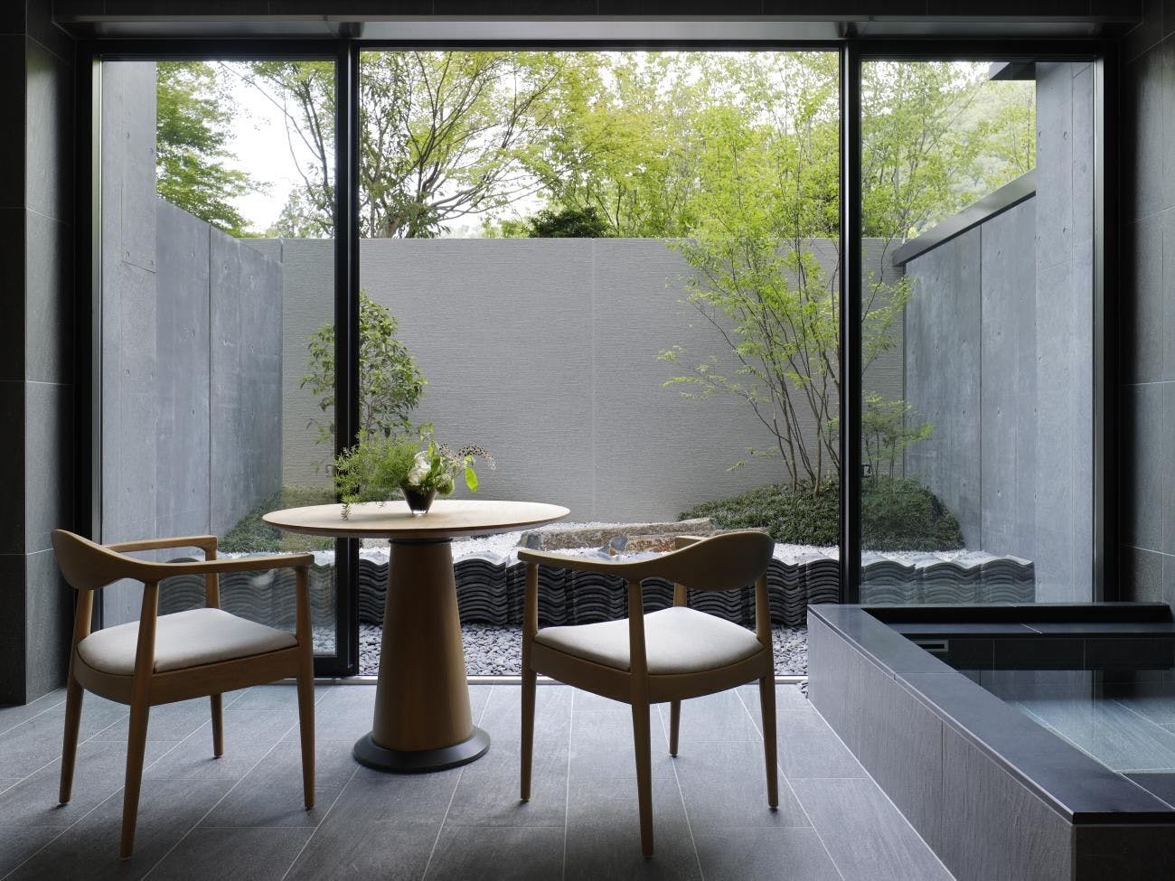 サーマルプールへ直接アクセスできるプライベートテラスの付いた82平米の客室。