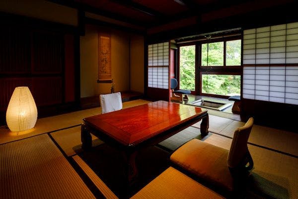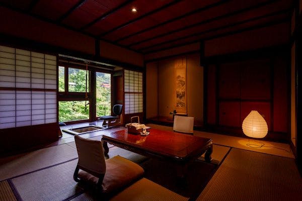 床の間には女将の摘んだ野草が生けられ、各お部屋に必ず囲炉裏がある小さなお部屋でございます。どのお部屋からも庭や山の緑が見え、山間ならではの美しい日本の昭和建築をお愉しみ下さいませ。※お部屋にはお手洗い、お風呂はついておりません。