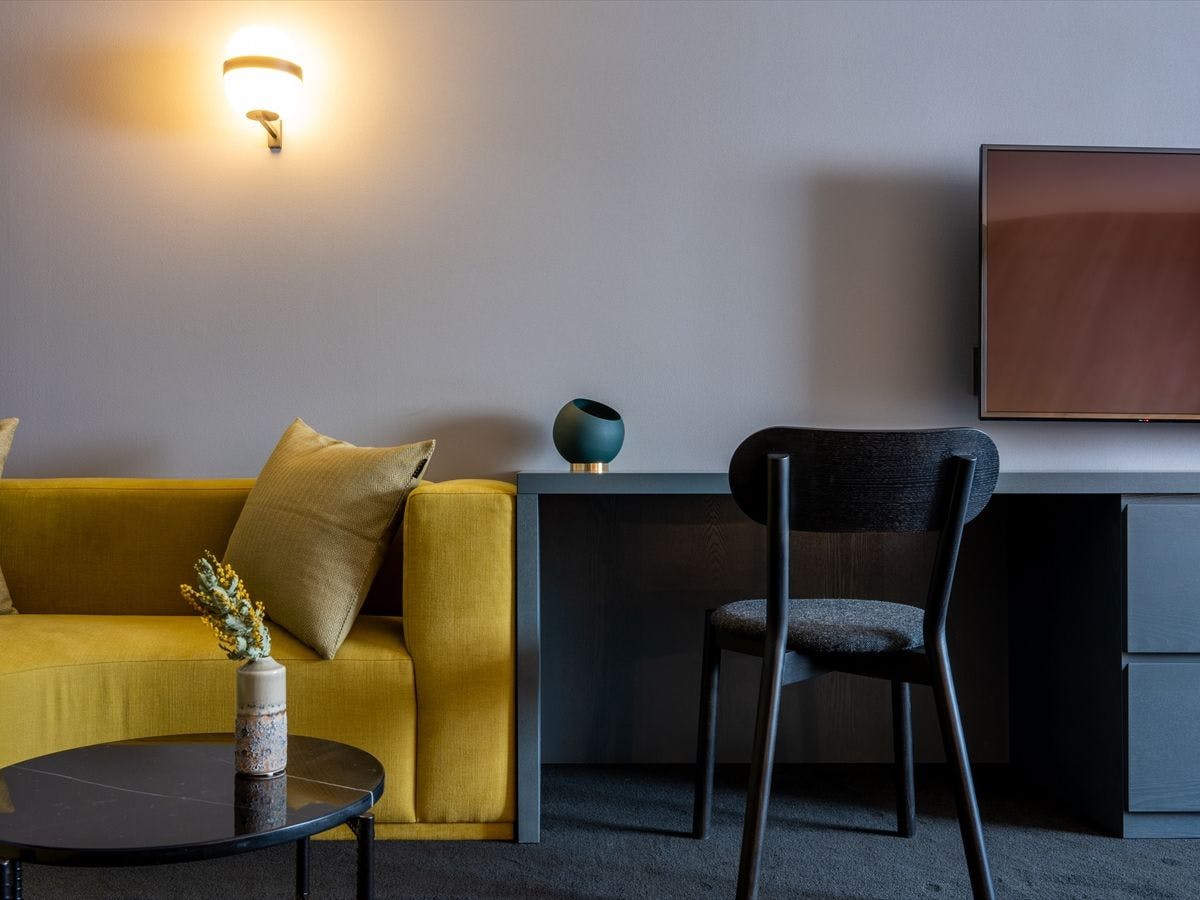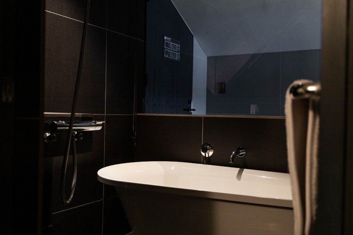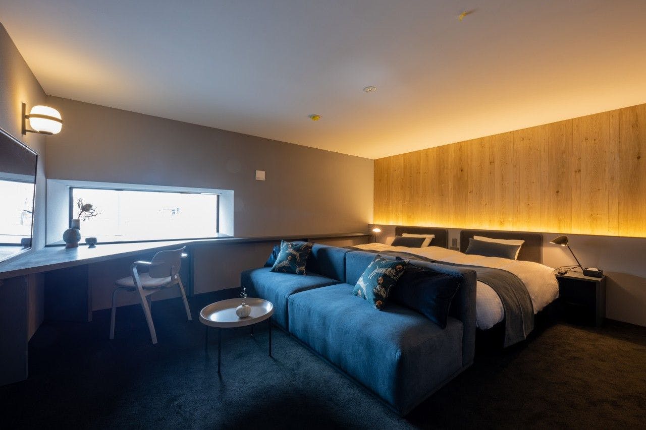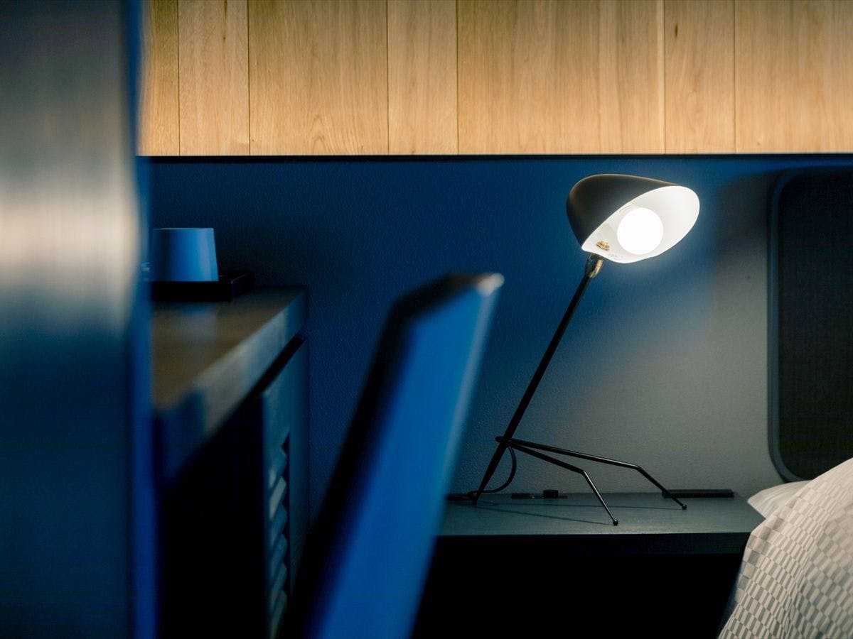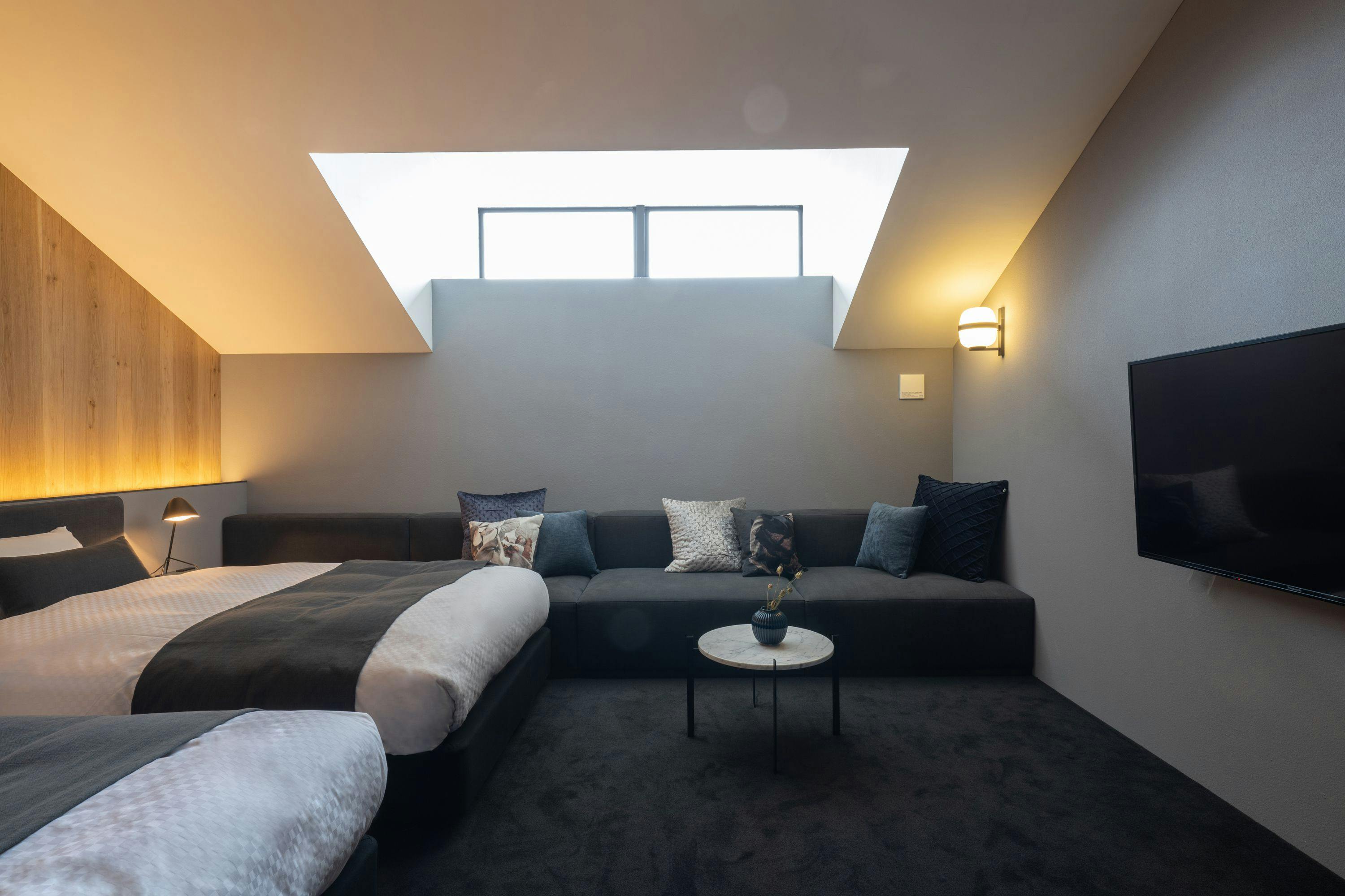 1~2名定員/約36平米/プライベートバス付きシンプルながら、デザイン性高いインテリアが随所に配され、空間の高級感を引き立てます。最低限の照明に抑え、疲れた心をほぐす心地よい眠りを導きます。