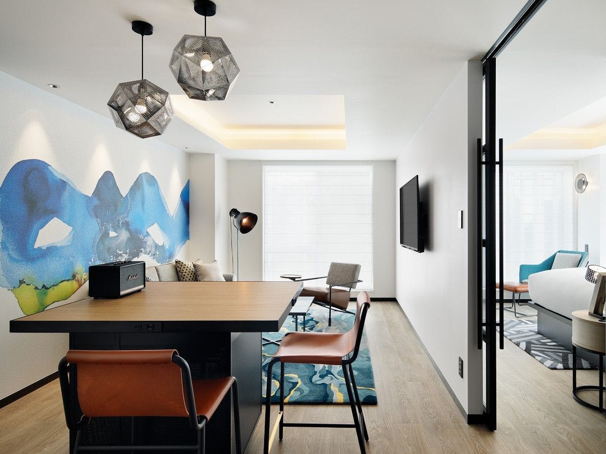 モダンアートが映えるリビングルームとベッドルームで構成された客室。