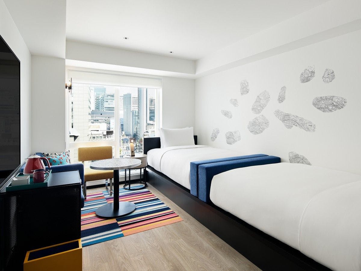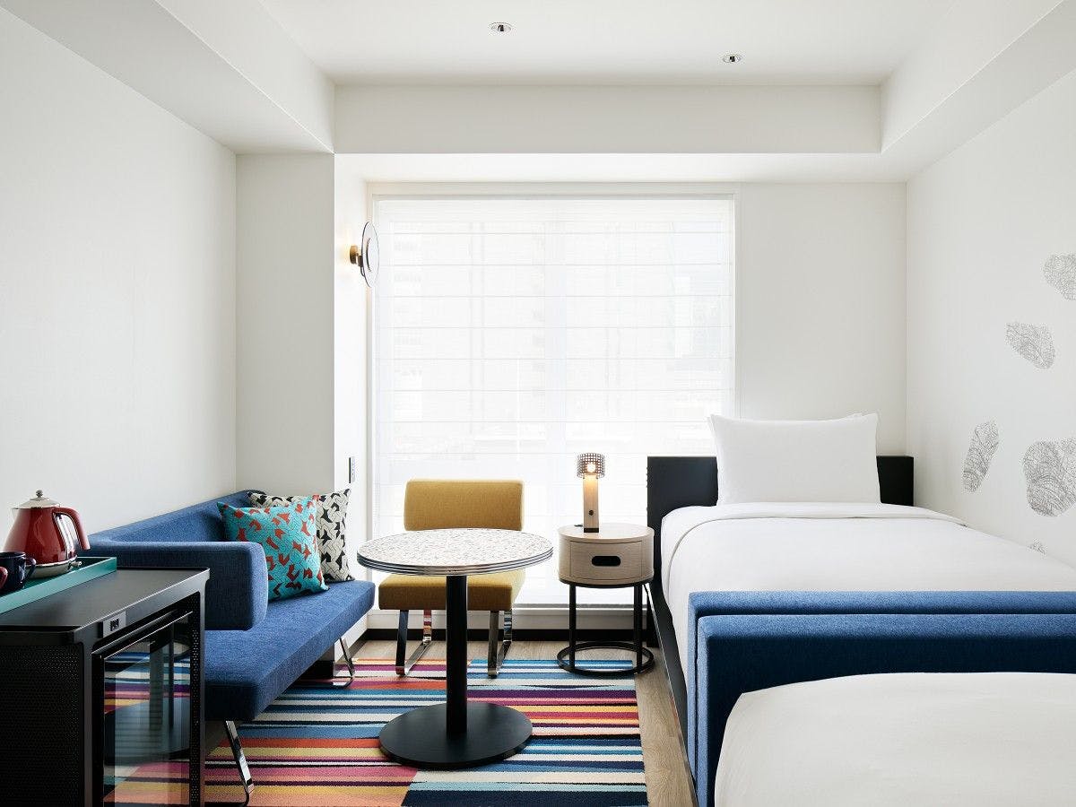 友人同士の滞在にぴったりな、向かい合ったベッドが特徴の客室。