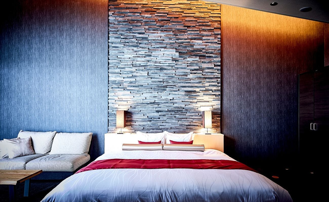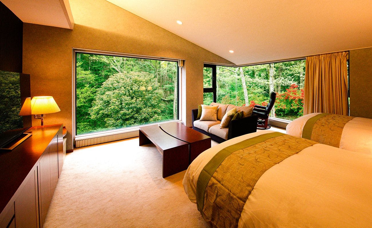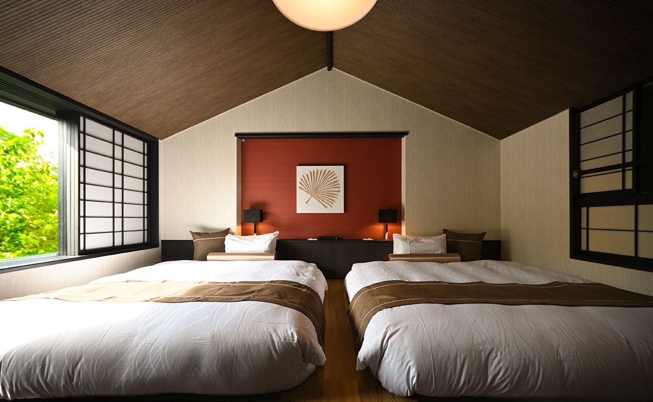 お部屋の中は2階建てになっているメゾネットタイプです。1階部分のリビングでは、壁一面の大きな窓から中庭を望みます。2階の寝室には、2階の寝室には、幅160cmのクイーンダブルサイズベッドが2台。旅の疲れを癒すマッサージチェアつき。
