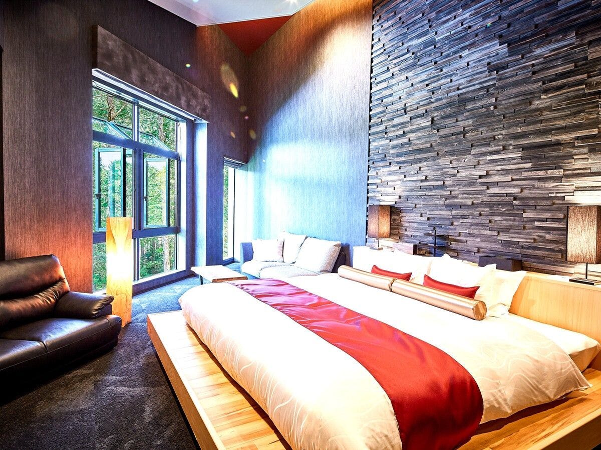 60平米の広々ラウンジ&ダイニングにベッドルームが3室、専用の温泉内風呂を備えた、豪華スイート。