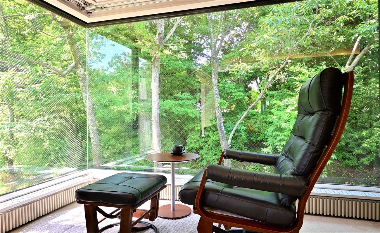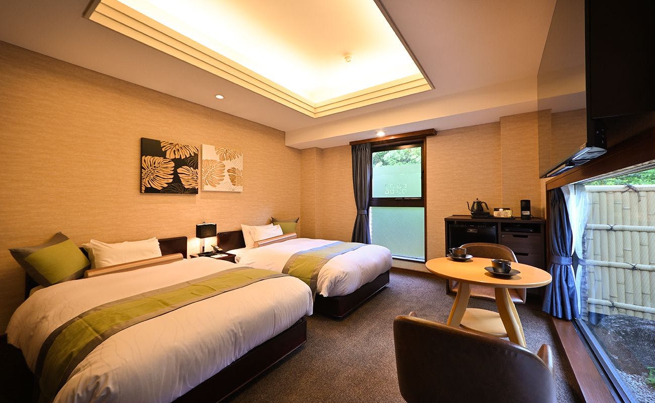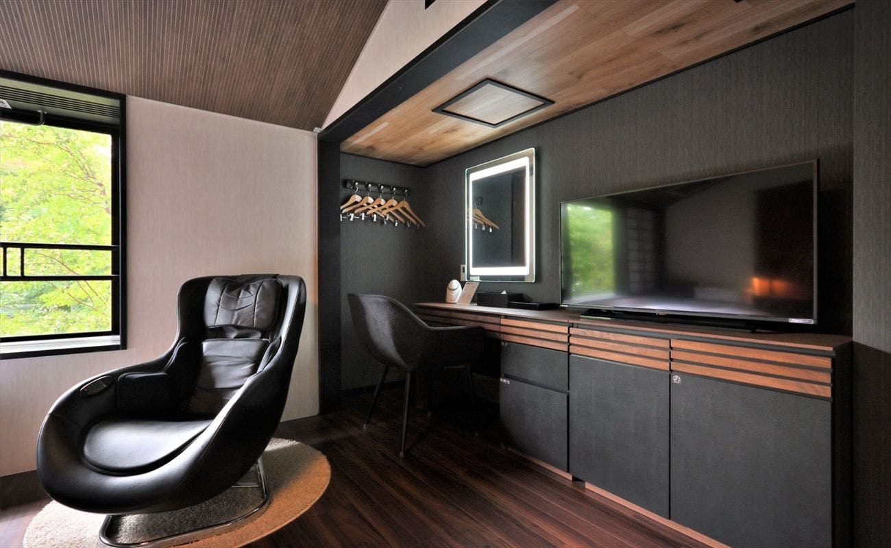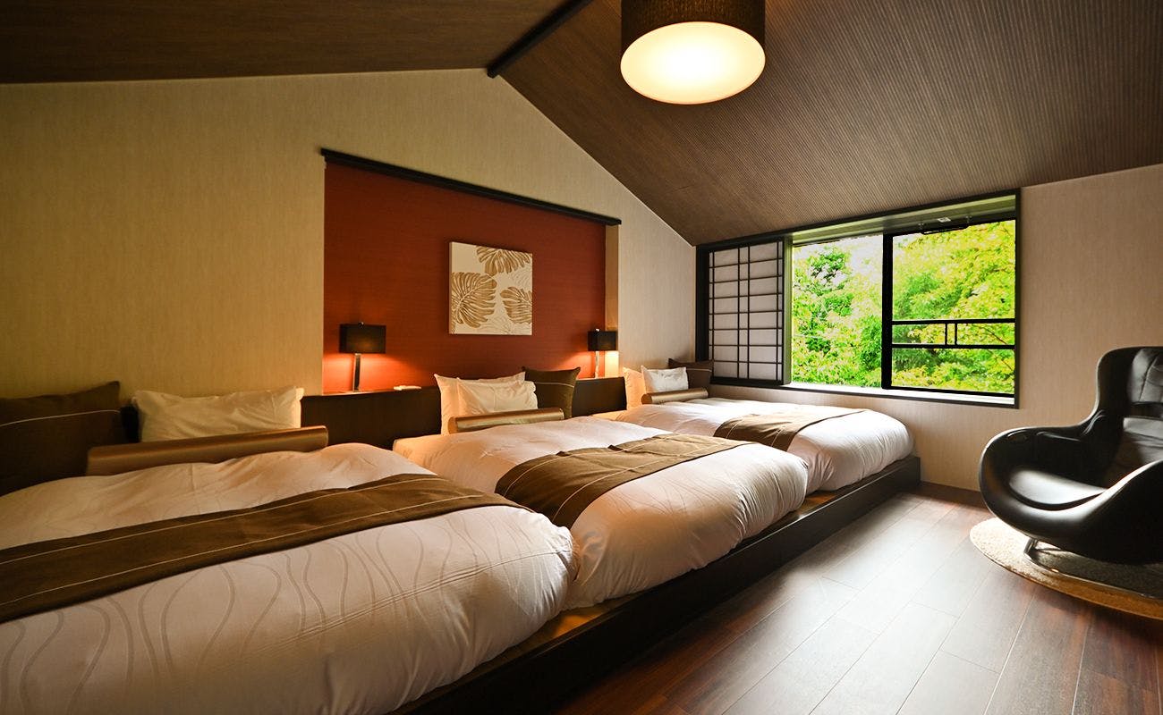 お部屋の中は2階建てになっているメゾネットタイプです。1階部分のリビングでは、壁一面の大きな窓から中庭を望みます。2階の寝室には、幅110cmの幅広シングルサイズベッドが3台。旅の疲れを癒すマッサージチェアつき。