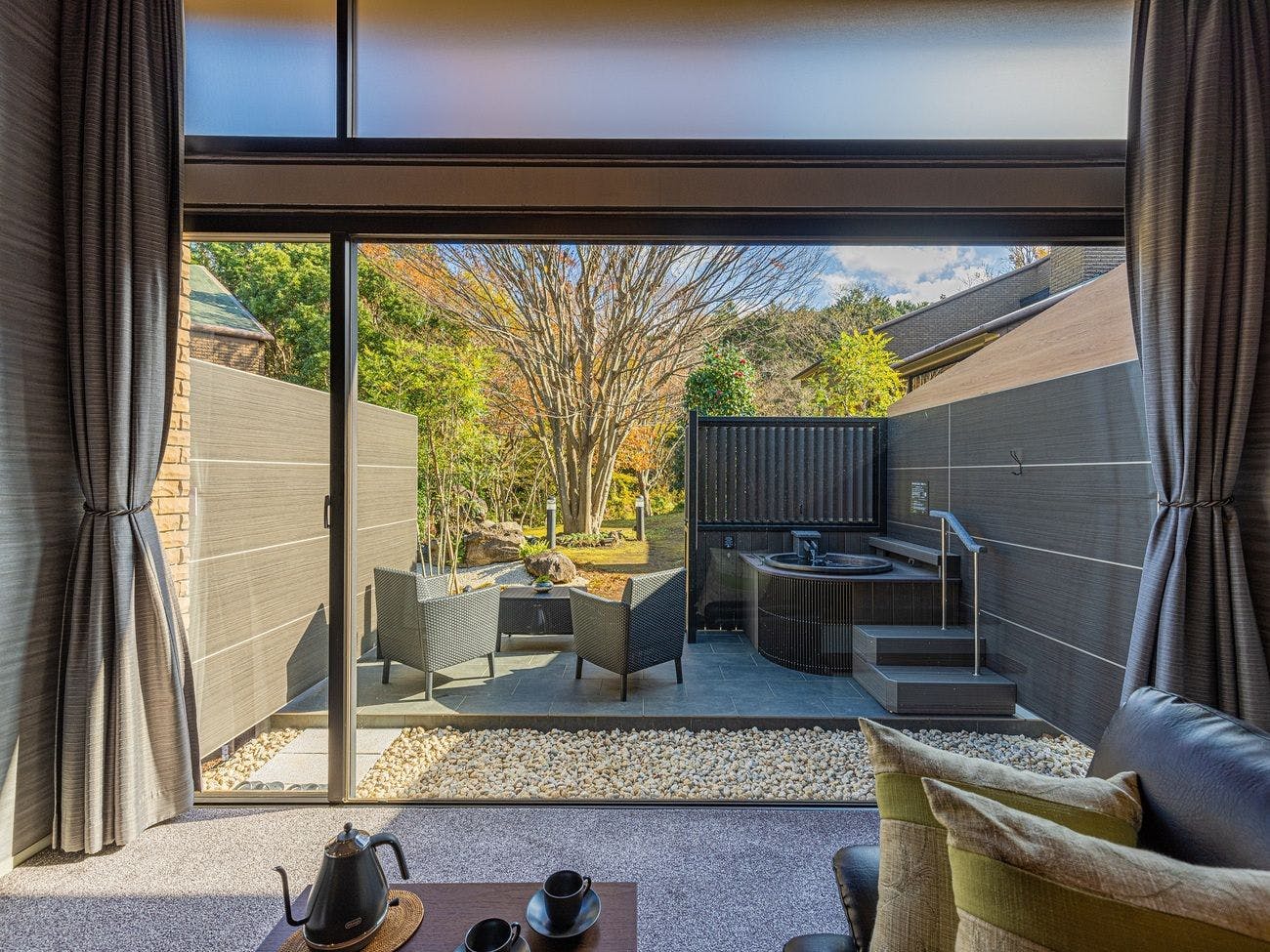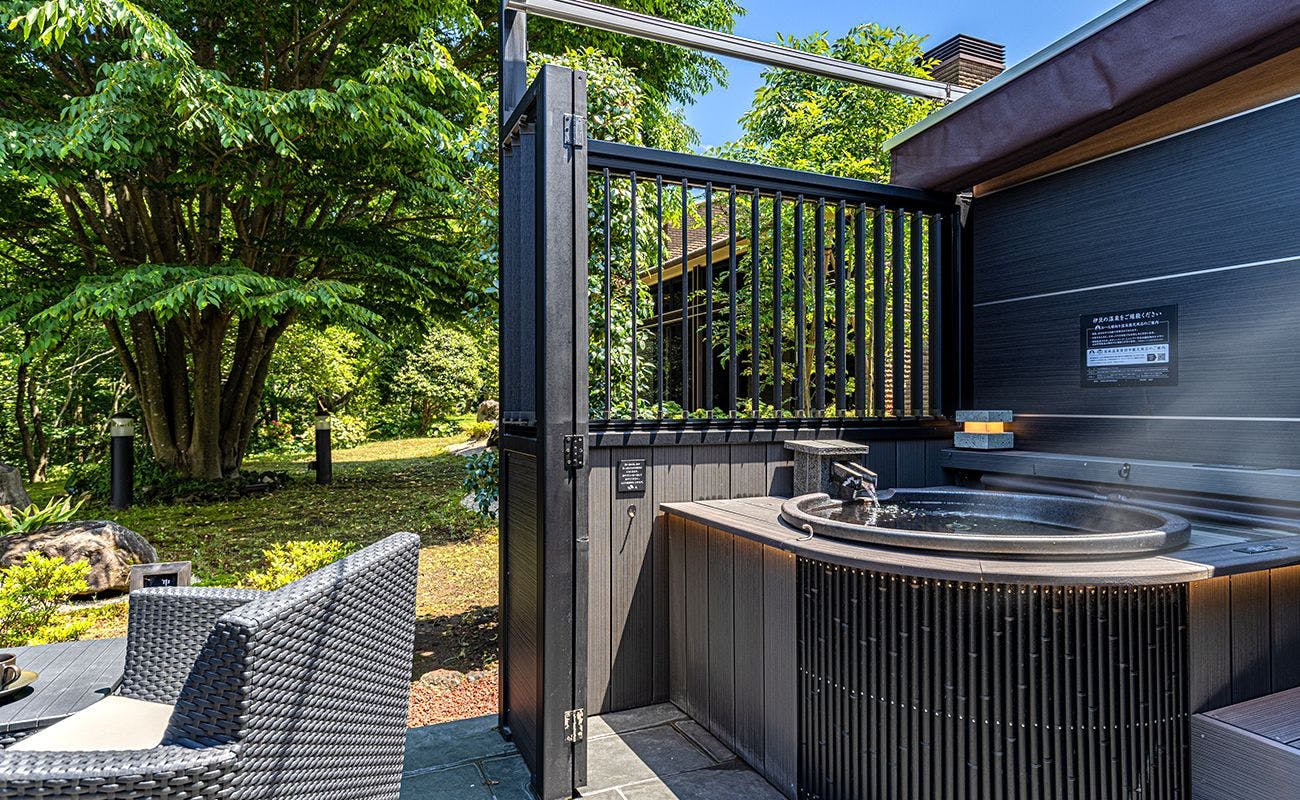 お部屋のテラスには、中庭を一望する信楽焼の温泉露天風呂とシャワーブースがございます。昼は庭と森の緑を、夜は満天の星空を愉しむことができます。更に、ご滞在中何時でも貸し切りでお楽しみ頂ける、素晴らしい眺望の貸切温泉お風呂が2つございます。