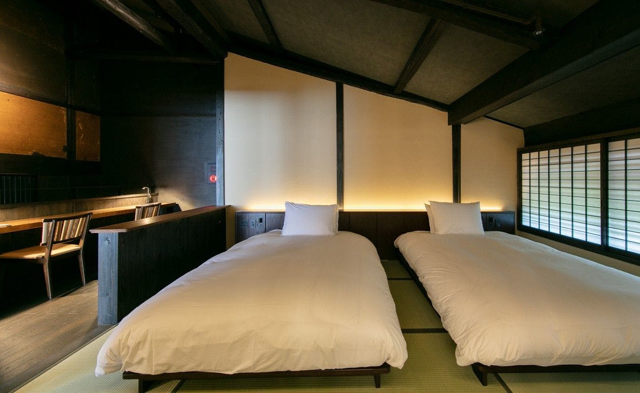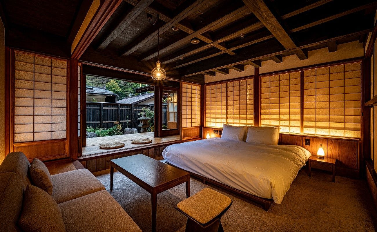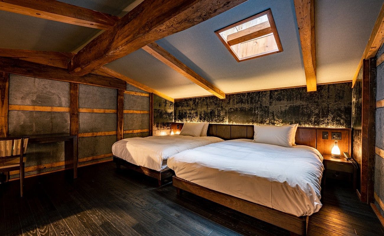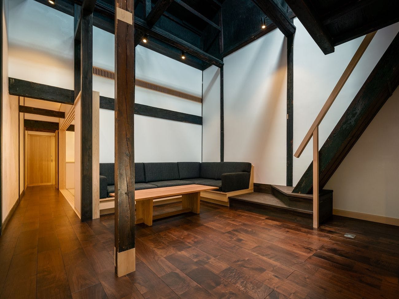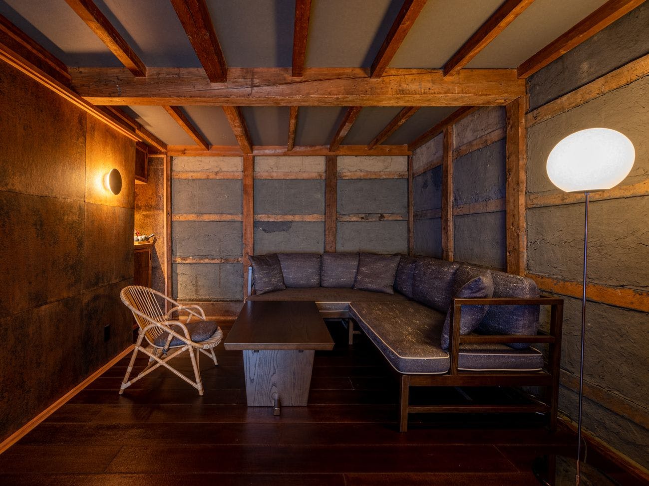 上原屋で唯一表通りに面しており、約200年有り続けた柱や梁の空間に、金属などの新しい素材が融合した新しい古民家スタイルのお部屋。