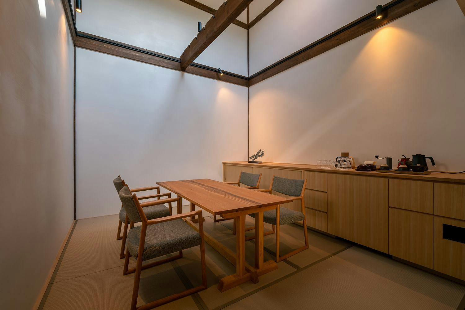 圧倒的な吹き抜け空間の畳ダイニングには、広い高窓から淡い光が差し込み、
