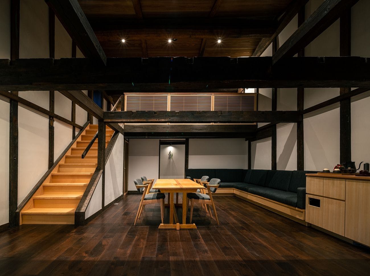 古民家ならではの吹き抜けの土間空間で圧倒的なスケール感を味わえ、家族やお友達、大切な人とワクワクを共有できるお部屋です。