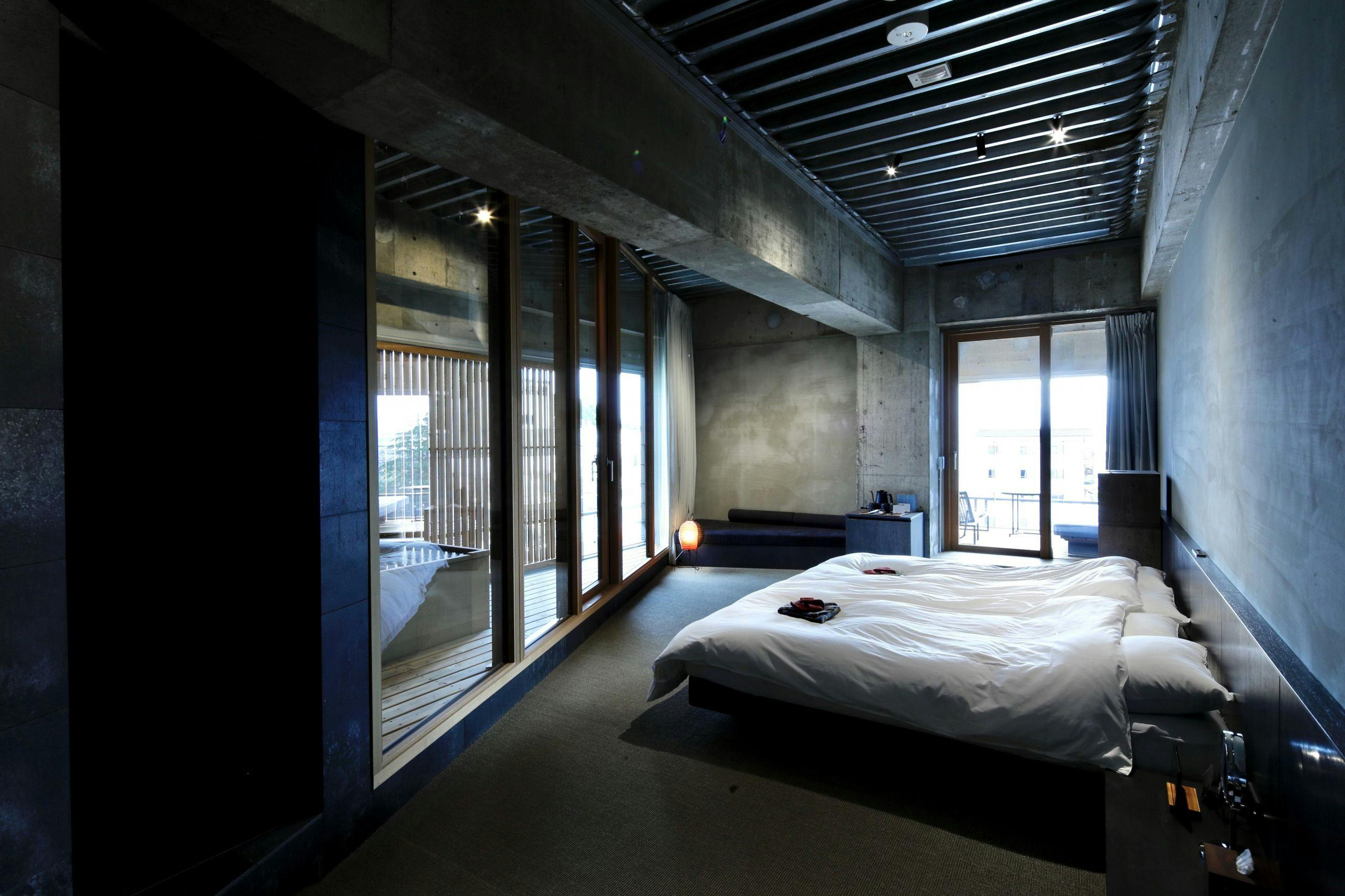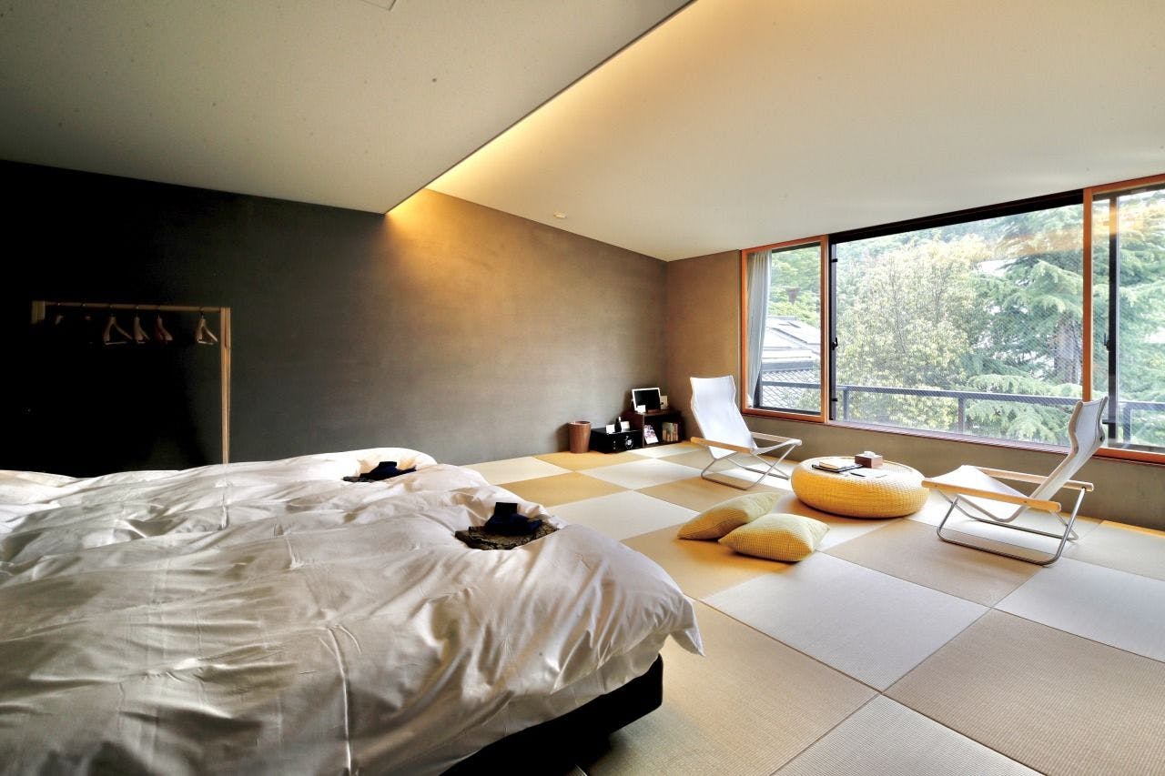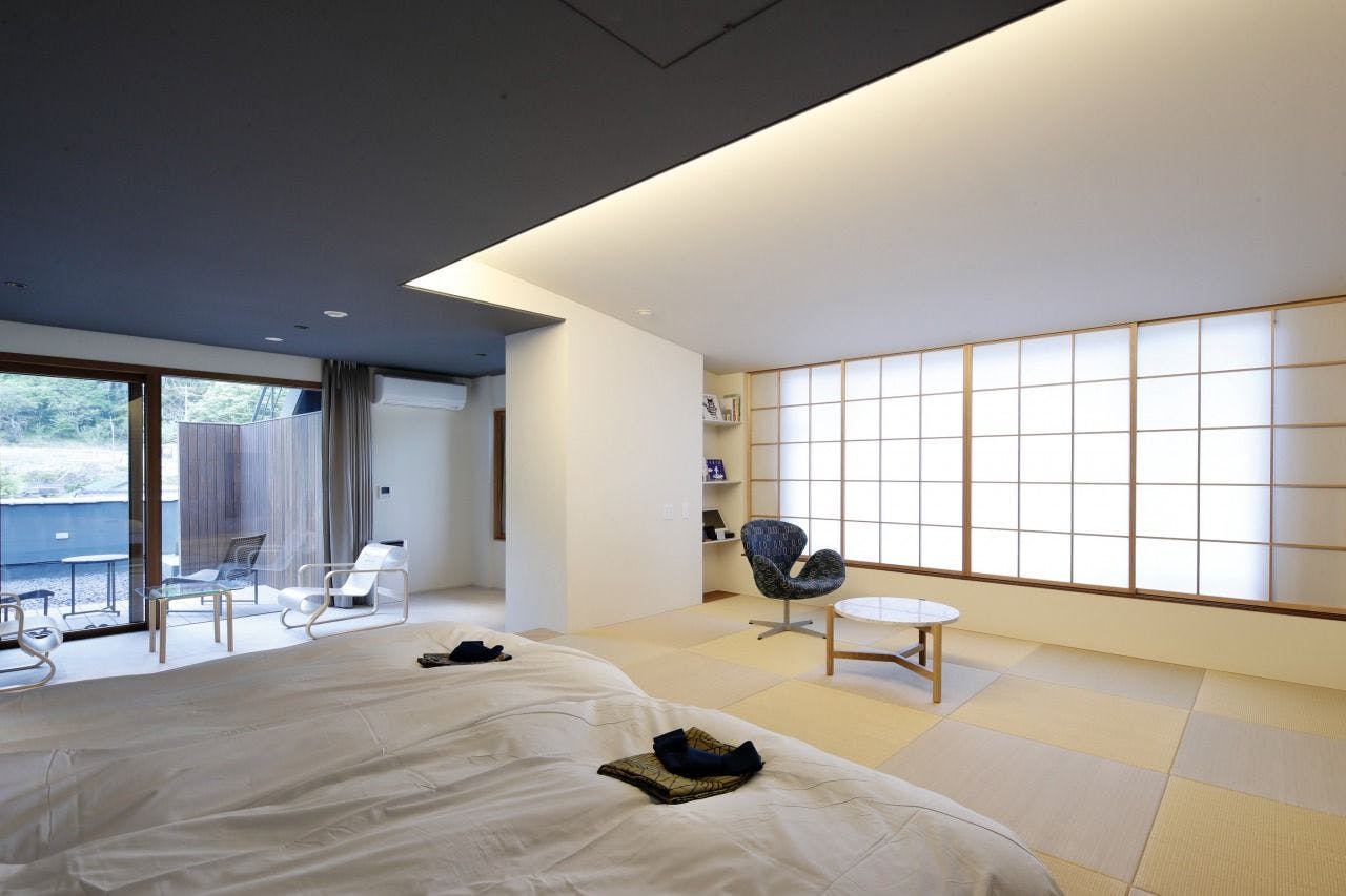 さらにこの客室の特徴が茶室をイメージした和室。ゆとりを持ったメインルームとの対比が特徴的なストイックな空間で、扉を閉めると瞑想空間に。本をじっくり読んだり、二人で語りあったり。2枚の布団を敷けば最大4名様でご利用いただけます。