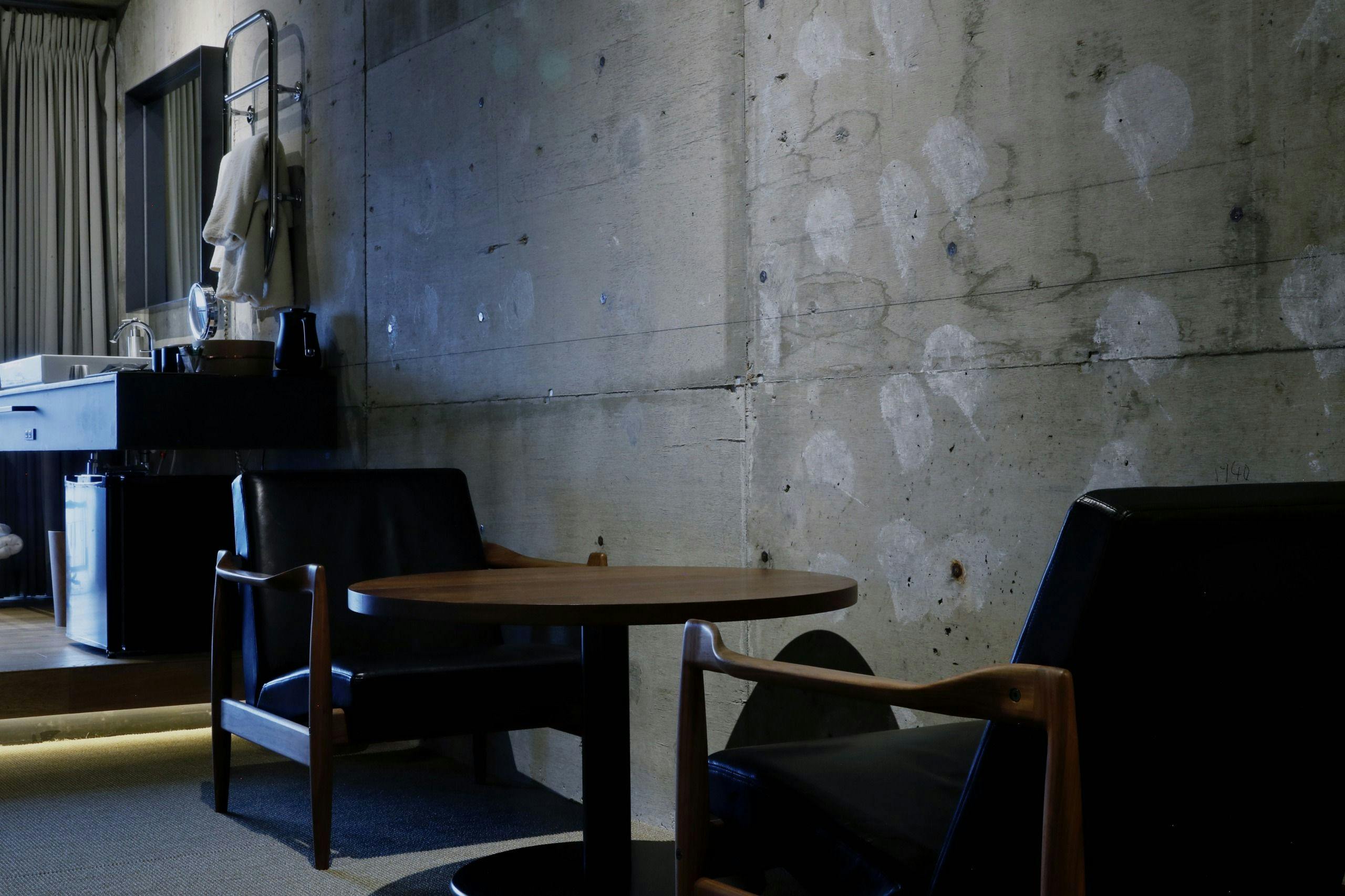 2台のベッドと、小さなリビングスペースを備えた客室です。設計は「SUPPOSE DESIGN OFFICE」。デラックスルームとの違いは「おこもり書斎ベッド」がないこと、家具デザインが「SUPPOSE DESIGN OFFICE」ではないこと。とはいえ、SUPPOSEらしい新旧がレイヤリングされたストイックな空間をお楽しみいただけます。