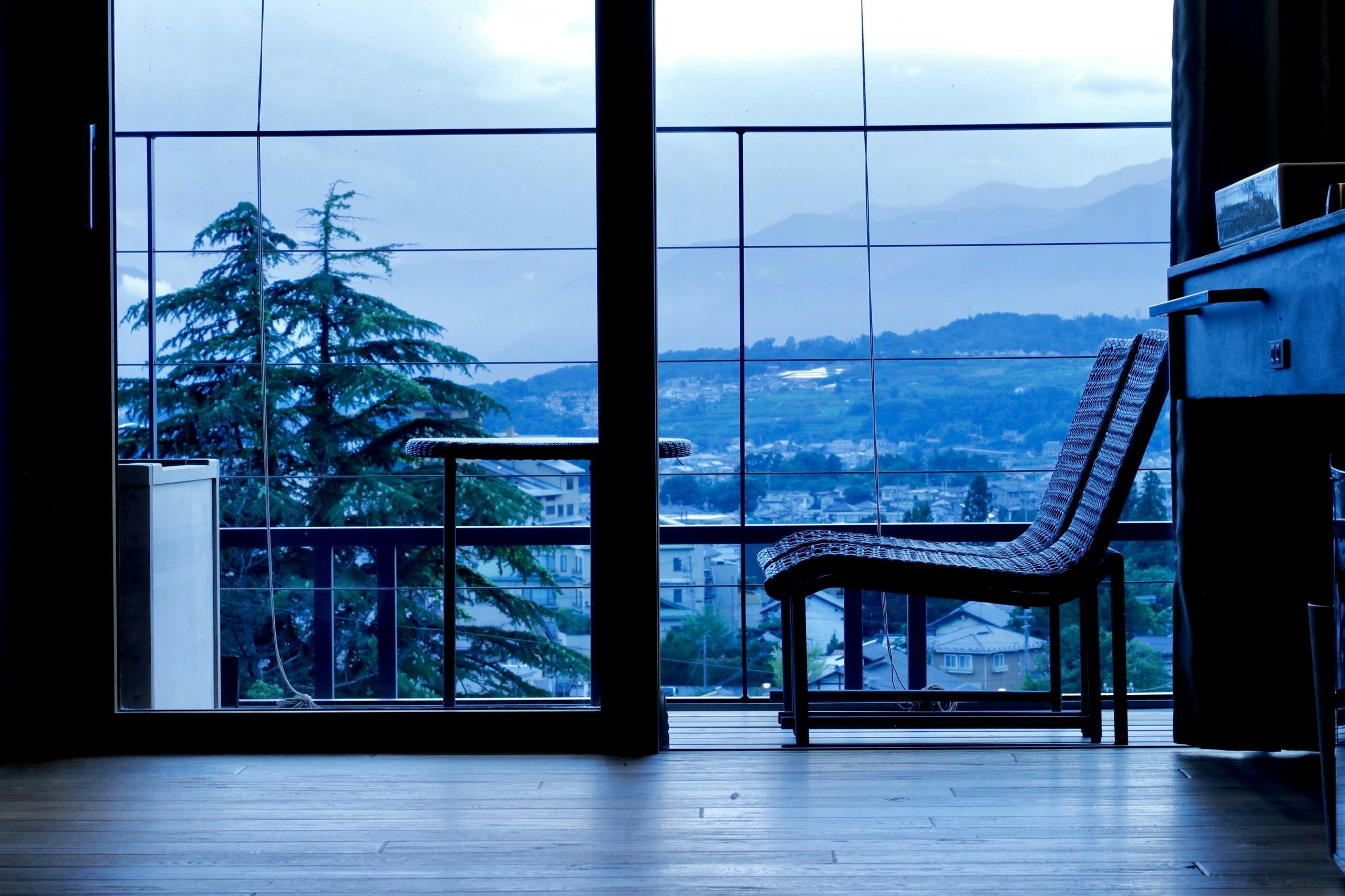 松本市街と北アルプスを遠望します。ただし一方向には隣の旅館が。視線を遮るためルーバーが設置されています。